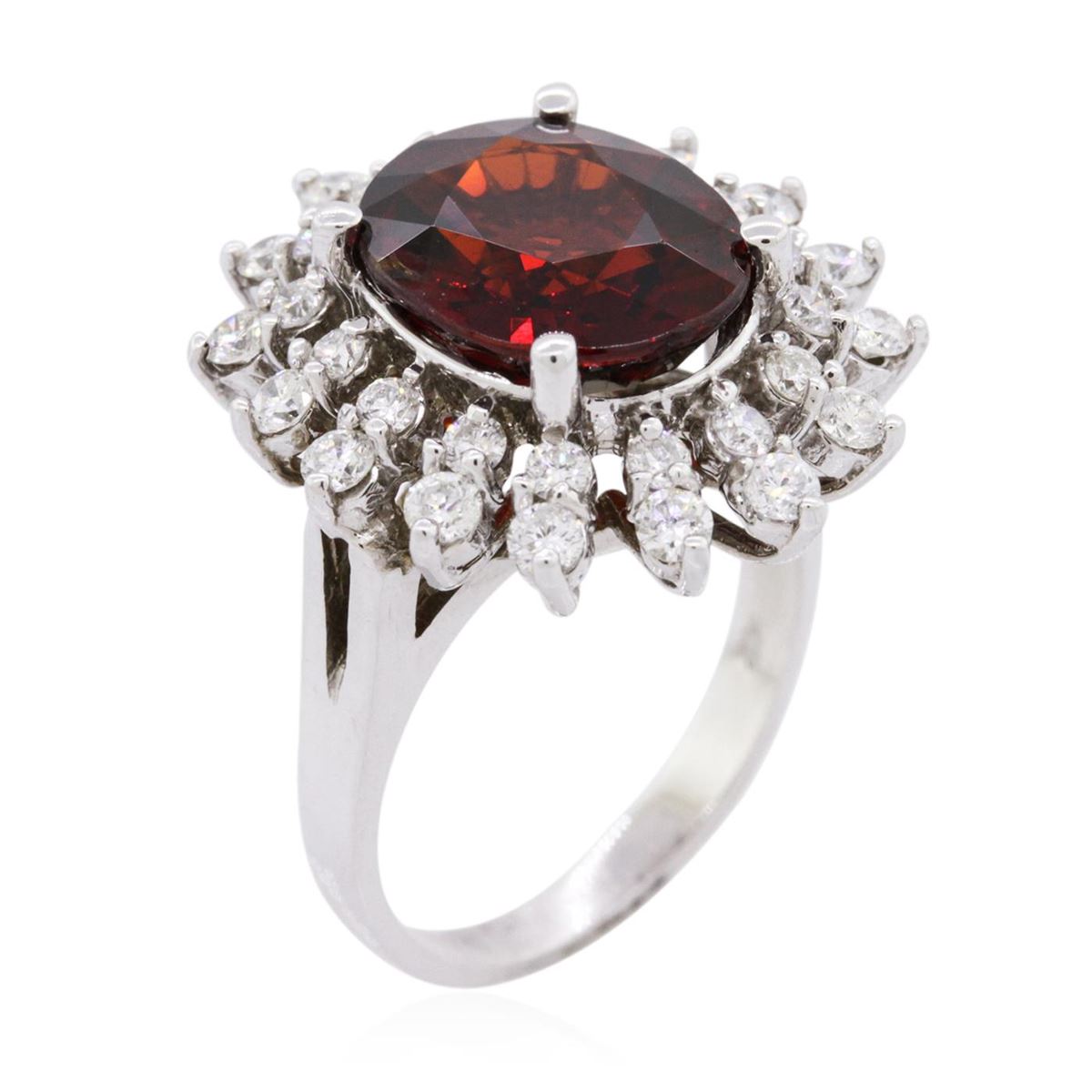 One electronically tested 14KT white gold ladies combination cast & assembled garnet and diamond ring with a cathedral shank with a bright polish finish. Identified with markings of "14K". Condition is new. Containing: One prong set oval modified brilliant cut natural pyrope garnet, measuring 11.75 x 10.00 x 6.15mm, approximate weight of 5.66ct., clarity is eye clean, type II, medium dark, very slightly brownish, red color, (GIA R 6/3), cut is good. Thirty-Two prong set round brilliant cut diamonds, measuring 2.00 - 1.70 x 1.11mm (depth est.) approximate total weight of 32 Stones = 0.74ct. Clarity: SI-2 to I-1. Color: I - J, Cut is Good. All diamonds and colored gemstones are graded in the mounting, unless otherwise stated. Colored gemstones are presumed to have been subjected to commonly used enhancement processes. Total Weight of Colored Stones 5.66ct. Total Weight of Diamonds 0.74ct. Total Weight of Ring 7.40 grams. GGL Appraised at $5,060.00.