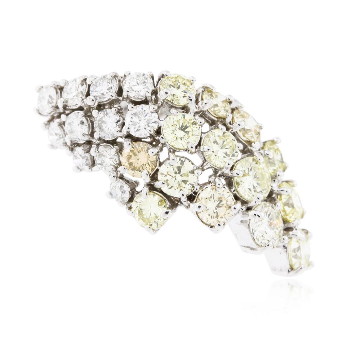 One electronically tested 14KT white gold ladies cast diamond waterfall ring with a bright polish finish. Condition is new, good workmanship. The ring features a cascading bouquet of diamonds completed by a three millimeter wide band. Identified with markings of "K14". Containing: Eleven prong set round brilliant cut diamonds, measuring 3.40 - 2.70 x 1.83mm (depth est.) approximate total weight of 11 stones = 1.31ct. Graded in the setting. Clarity SI-1 to SI-2. Color I-K. Fourteen prong set round brilliant cut diamonds, measuring 4.90 - 3.80 x 2.61mm (depth est.) approximate total weight of 14 stones = 4.36ct. The group includes a mix of natural color and irradiated enhanced color diamonds ranging from very light yellow to fancy yellow diamonds, Graded in the setting. Clarity SI-1 to SI-2. Total weight of Diamonds 5.67ct. Total weight of Ring 7.80gm. AIG Appraised at $21,960.00.
