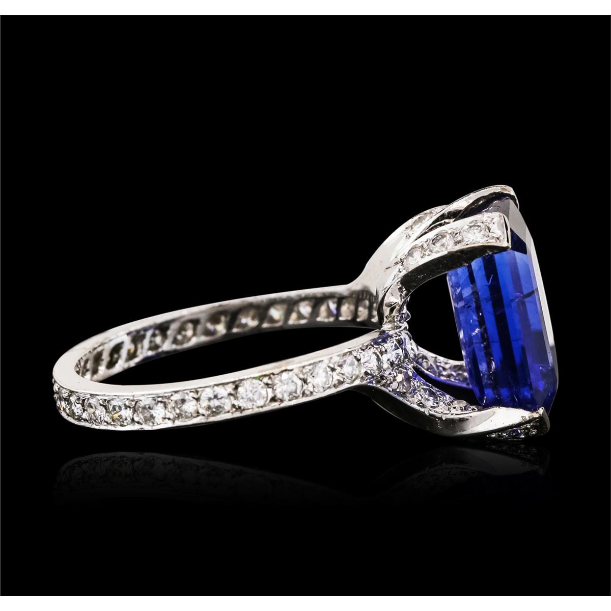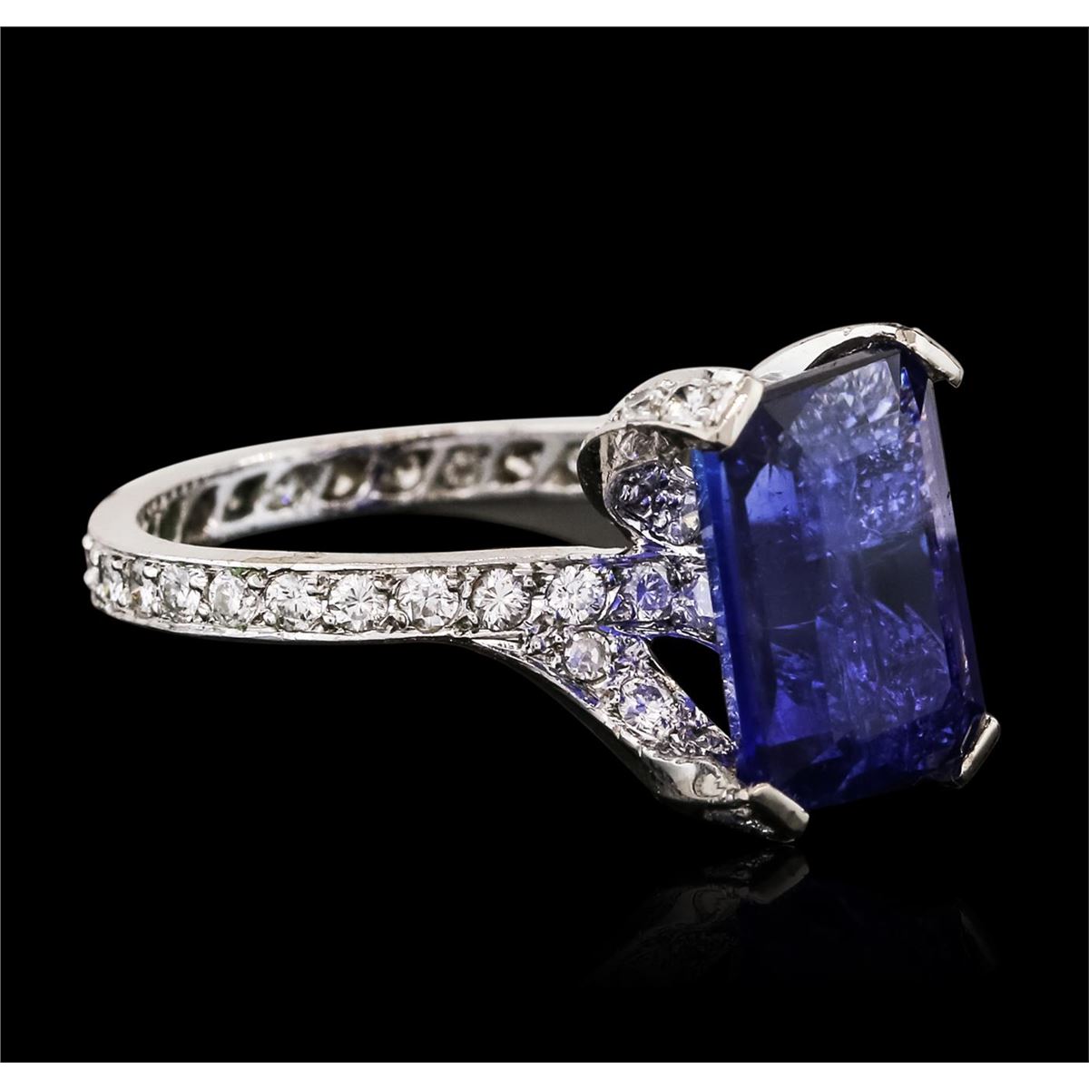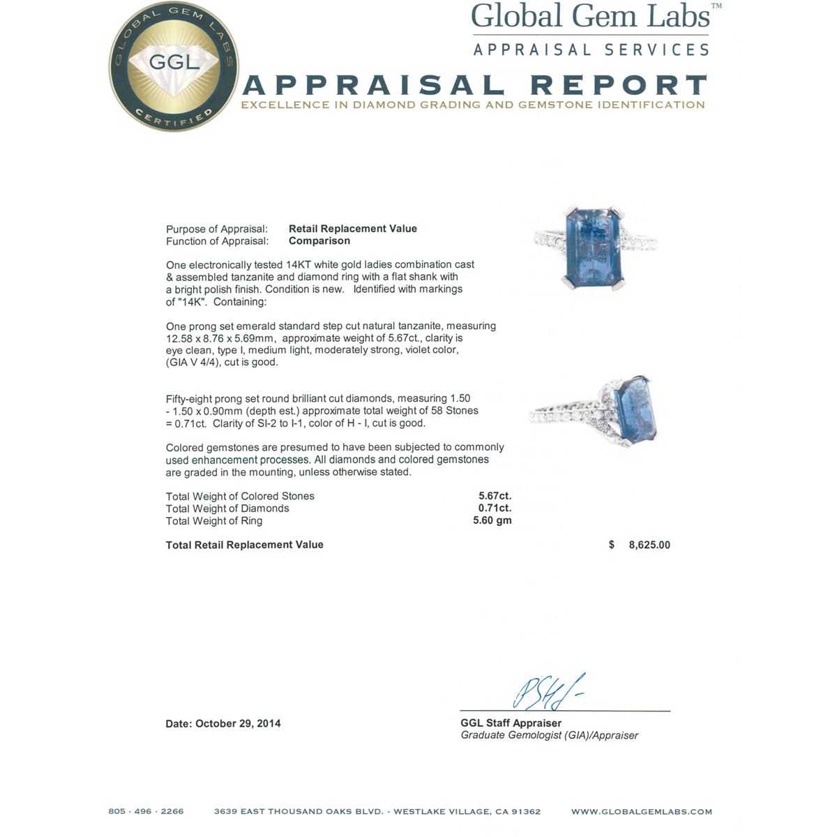 One electronically tested 14KT white gold ladies combination cast & assembled tanzanite and diamond ring with a flat shank with a bright polish finish. Identified with markings of 14K. Condition is new. Containing: One prong set emerald standard step cut natural tanzanite, measuring 12.58 x 8.76 x 5.69mm, approximate weight of 5.67ct., clarity is eye clean, type I, medium light, moderately strong, violet color, (GIA V 4/4), cut is good. Fifty-Eight prong set round brilliant cut diamonds, measuring 1.50 - 1.50 x 0.90mm (depth est.) approximate total weight of 58 Stones = 0.71ct. Clarity: SI-2 to I-1. Color: H - I, Cut is Good. Colored gemstones are presumed to have been subjected to commonly used enhancement processes. All diamonds and colored gemstones are graded in the mounting, unless otherwise stated. Total Weight of Colored Stones 5.67ct. Total Weight of Diamonds 0.71ct. Total Weight of Ring 5.60 grams. GGL Appraised at $8,625.00.