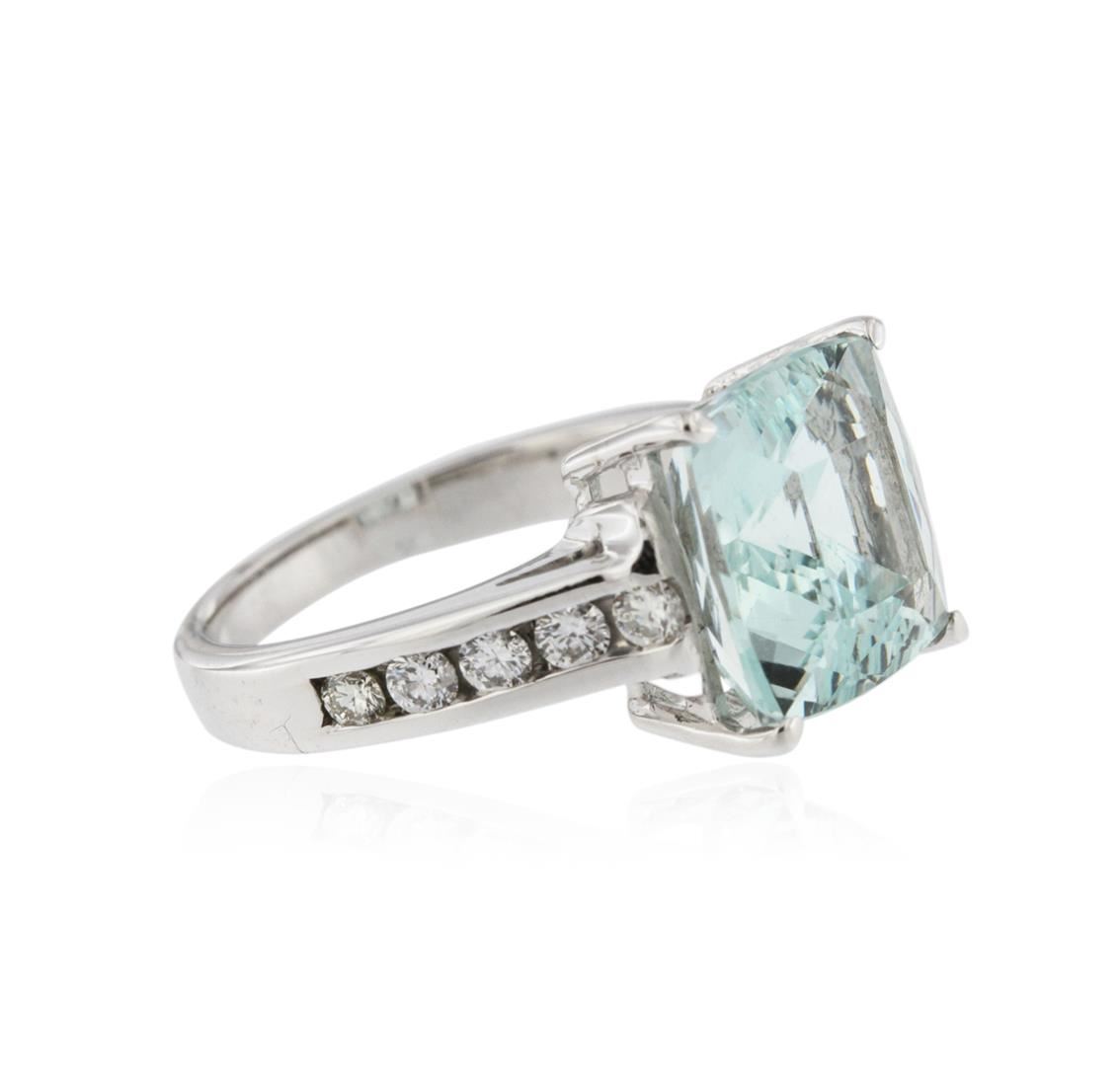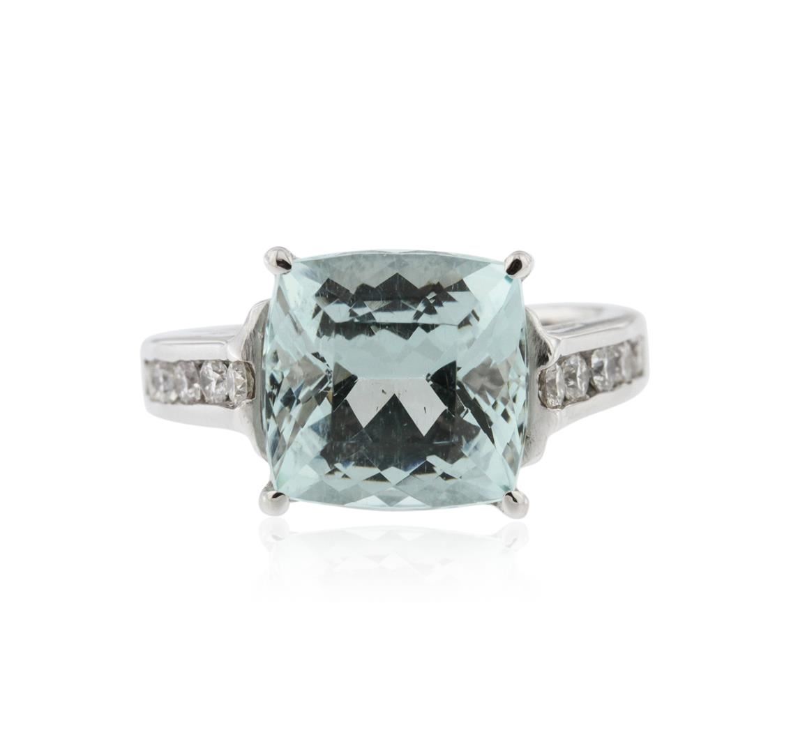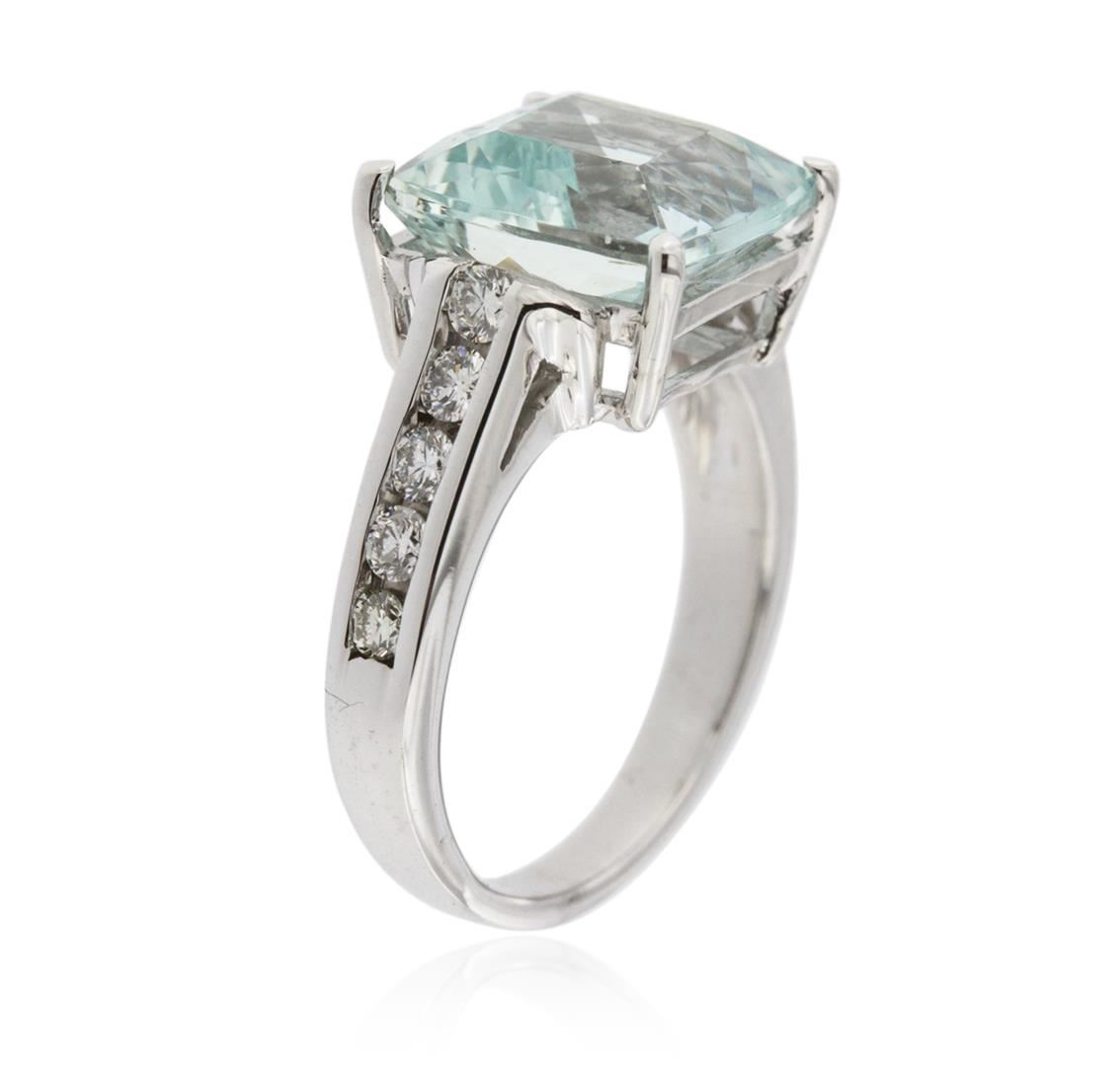 One ring featuring: 14KT white gold weighing 6.45 grams containing one princess cut aquamarine center weighing 5.70ct and round cut diamonds weighing a total of 0.35ct.