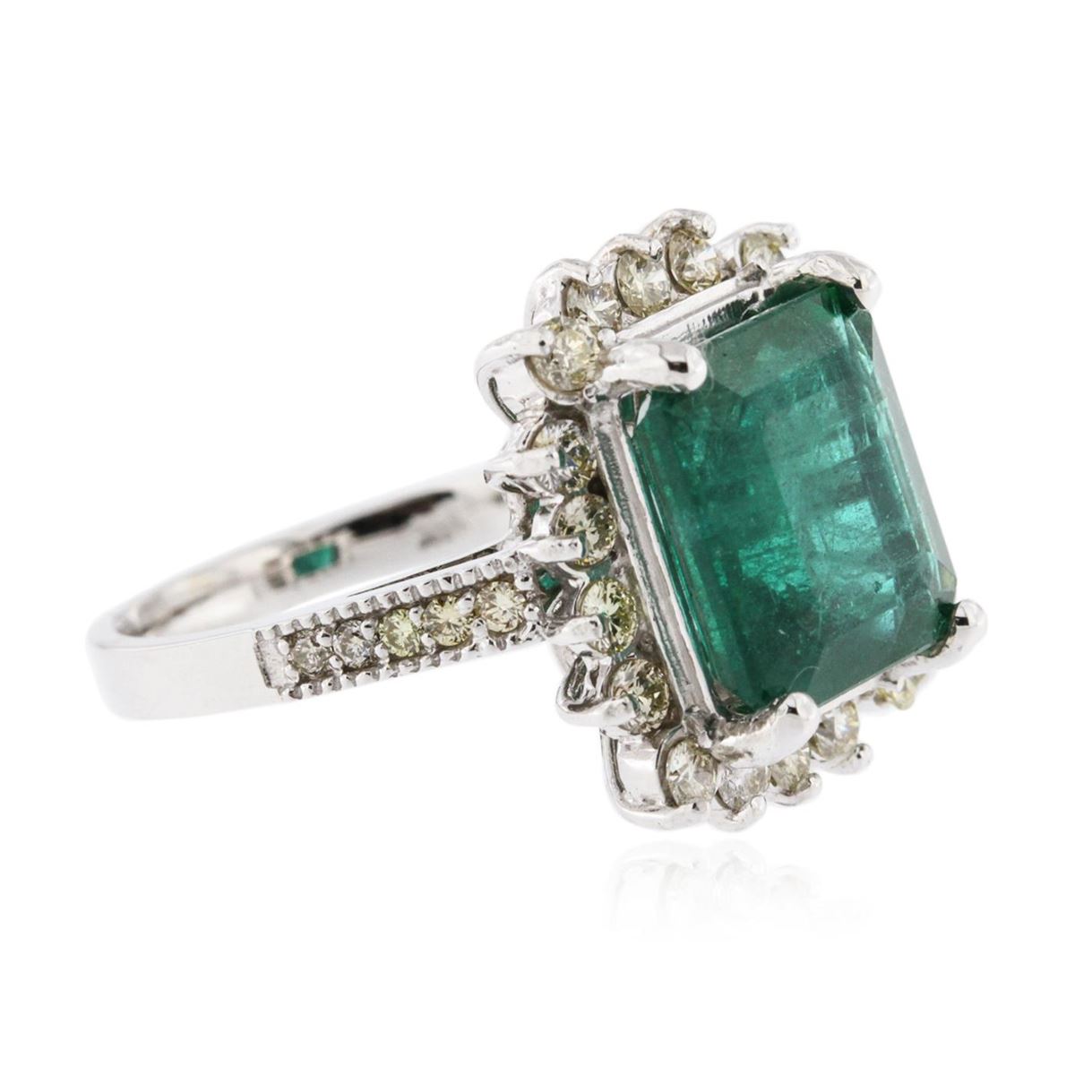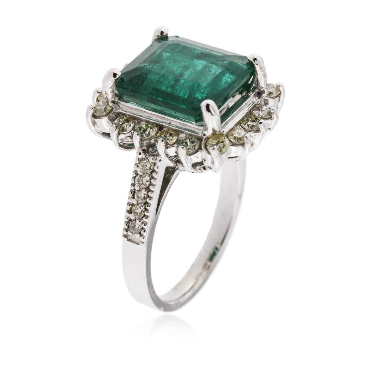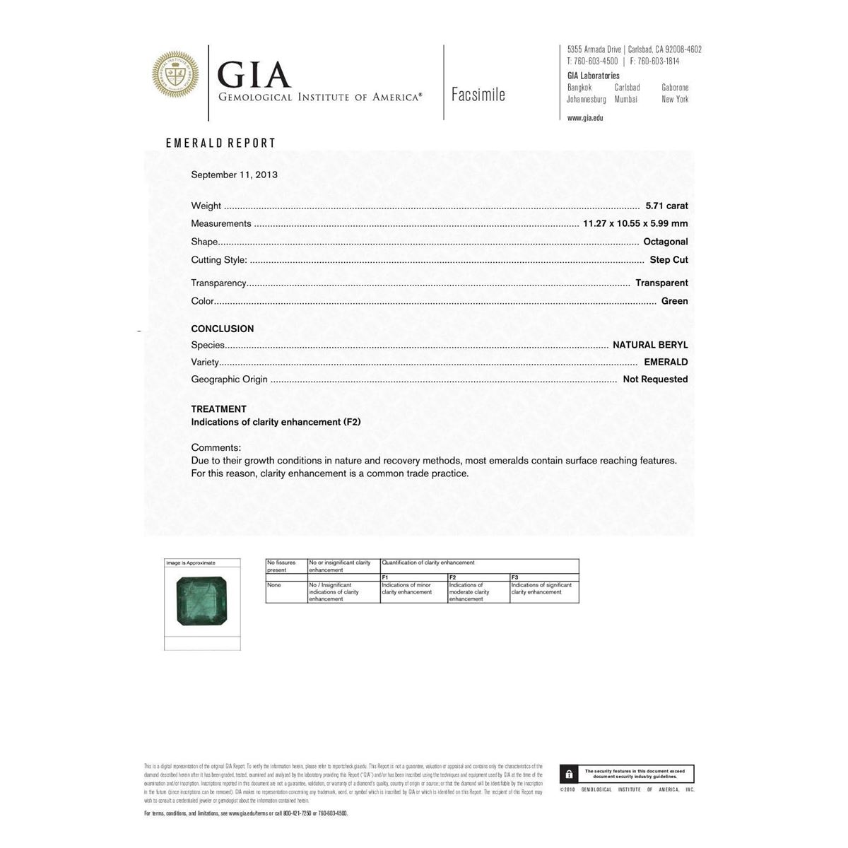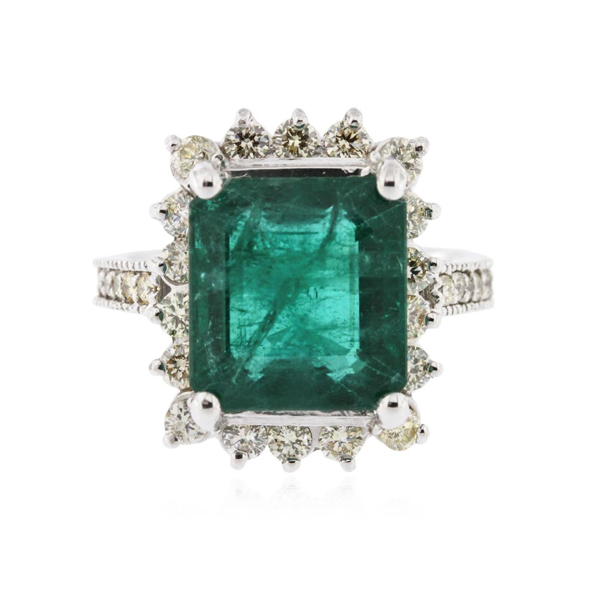 One electronically tested 14KT white gold ladies cast emerald and diamond ring with a bright polish with milgrain finish. Condition is new, good workmanship. The featured emerald is set within a diamond bezel, supported by diamond set shoulders and completed by a two and one-half millimeter wide band. Identified with markings of "14K". Containing: One prong set rectangular step cut natural emerald, measuring 11.27 x 10.55 x 5.99mm, exact weight 5.71ct., clarity is heavily included, type III, medium dark, moderately strong, very slightly bluish green color, (GIA vslbG 6/4), cut is good. Transmitting light with a minimum of distortion, transparent. Naturally occurring internal & external characteristics are present. Indications of oil, & opticon residue. GIA Colored Stone Grading Report attached. Graded loose prior to setting in the GIA Laboratory, Report # 6157648169. Twenty-eight prong & bead set round brilliant cut diamonds, measuring 2.10 - 1.50 x 1.08mm (depth est.) approximate total weight of 28 Stones = 0.92ct. Graded in the setting. Clarity VS-2 to SI - 2. Color J - L. Total Weight of Colored Stones 5.71ct. Total Weight of Diamonds 0.92ct. Total Weight of Ring 7.50gm. AIG Appraised at $16,540.00.