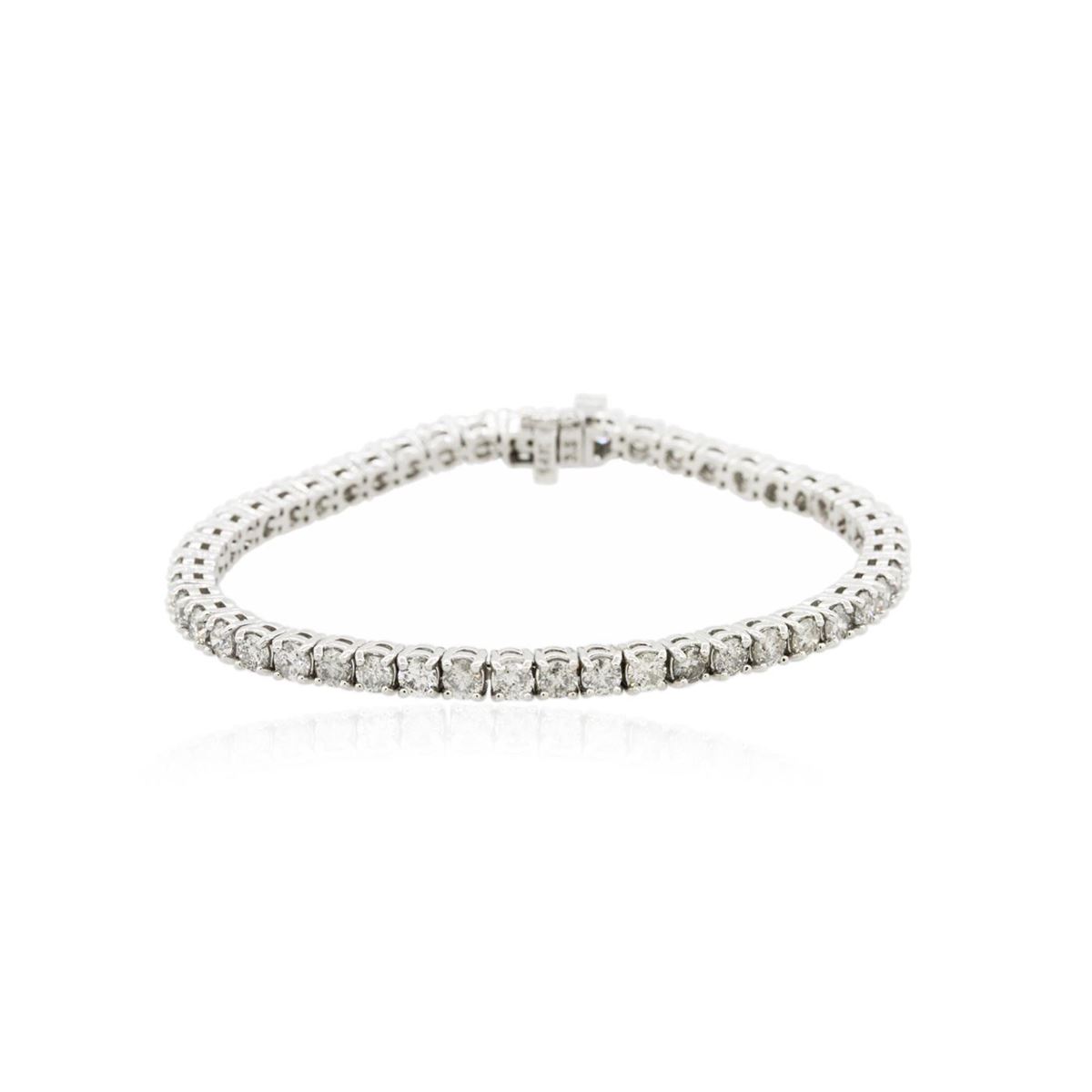 One electronically tested 14KT white gold Ladies combination cast & assembled tennis bracelet with a hidden box clasp with a bright polish finish. Condition is new. Measurements: 7" in length. Identified with markings of "14K". Containing: Forty-Eight prong set round brilliant cut diamonds, measuring 3.20 - 3.20 x 1.92mm (depth est.) approximate. Total Weight of 48 Stones = 5.76ct. Clarity: I-1 to I-3. Color: I - J, Cut is Good. Total Weight of Diamonds 5.76ct. Total Weight of Bracelet 16.60 grams. GGL Appraised at $14,670.00.