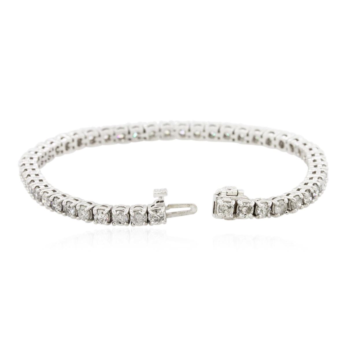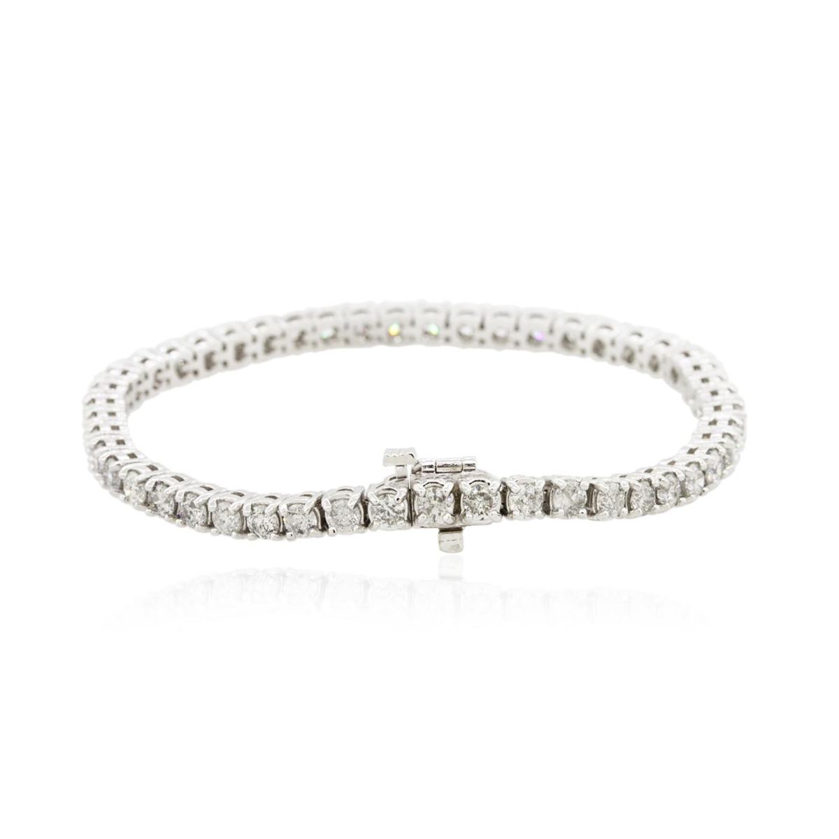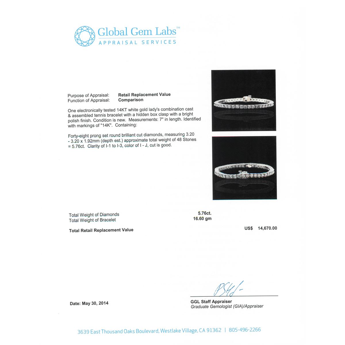One electronically tested 14KT white gold Ladies combination cast & assembled tennis bracelet with a hidden box clasp with a bright polish finish. Condition is new. Measurements: 7" in length. Identified with markings of "14K". Containing: Forty-Eight prong set round brilliant cut diamonds, measuring 3.20 - 3.20 x 1.92mm (depth est.) approximate. Total Weight of 48 Stones = 5.76ct. Clarity: I-1 to I-3. Color: I - J, Cut is Good. Total Weight of Diamonds 5.76ct. Total Weight of Bracelet 16.60 grams. GGL Appraised at $14,670.00.