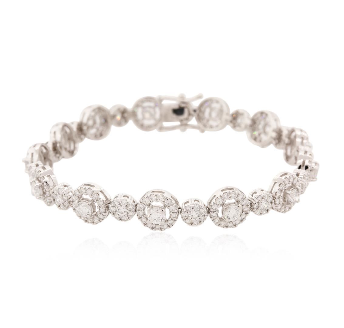 One electronically tested 14KT white gold ladies cast & assembled diamond bracelet with a bright polish finish. Seven and one-half inch length bracelet features a flexible stylized diamond ribbon, terminating in a concealed clasp with twin safeties. Identified with markings of "585". Condition is new, good workmanship. Containing: Thirteen prong set round brilliant cut diamonds, measuring 3.40 - 3.35 x 2.10mm (depth est.) approximate total weight of 13 Stones = 1.95ct. Graded in the setting. Clarity: SI-1 to I-1. Color: G - I Two Hundred Seventy-Three prong set round brilliant cut diamonds, measuring 1.60 - 1.50 x 0.93mm (depth est.) approximate total weight of 273 Stones = 3.81ct. Graded in the setting. Clarity: SI-1 to I-1. Color: G - I. Total Weight of Diamonds 5.76ct. Total Weight of Bracelet 17.47 grams. AIG Appraised at $19,565.00.