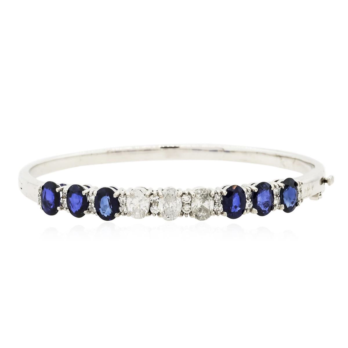 One electronically tested 14KT white gold ladies cast & assembled sapphire and diamond bangle bracelet with a bright polish finish. Condition is new, good workmanship. Seven inch length bangle bracelet features a sapphire and diamond ribbon supported by a hinged shoulder, terminating in a concealed clasp with safety. Identified with markings of "K14". Containing: Six prong set oval mixed cut natural blue sapphires, measuring 6.80 x 5.00. x 3.25mm, 6%. bulge factor, approximate. Total Weight of 5.76ct., clarity is slightly included, type II, dark, strong, violetish blue color, (GIA vB 7/5), cut is good. Transmitting light with a minimum of distortion, transparent, Naturally occurring internal & external characteristics are present. Intermittent color zoning present. Indications of laboratory high temperature diffusion treatment. Measurements & the color grade are an average for the group. Graded in the setting. Three prong set oval shaped cut diamonds, measuring 8.00. x 4.60 x 2.90mm (depth est.) approximate. Total Weight of 3 Stones = 2.24ct. Graded in the setting. Clarity: I-1 to I-2 . Color: H - I Twenty prong set round brilliant cut diamonds, measuring 2.00. - 1.80 x 1.14mm (depth est.) approximate. Total Weight of 20 Stones = 0.60ct. Graded in the setting. Clarity: SI-2 to I-2 . Color: G - I. Total Weight of Colored Stones 5.76ct.. Total Weight of Diamonds 2.84ct.. Total Weight of Bangle Bracelet 17.60gm. AIG Appraised at $17,540.00.