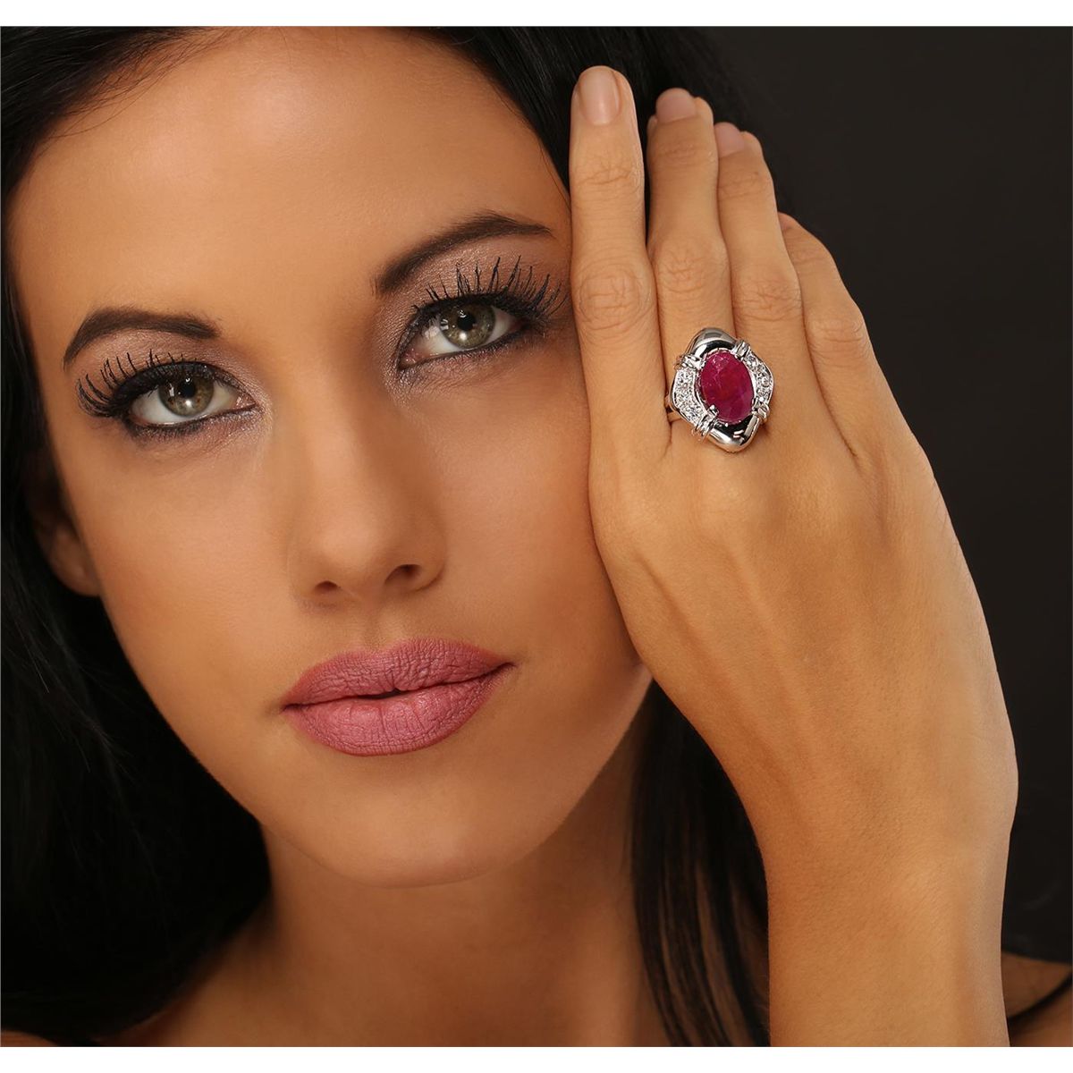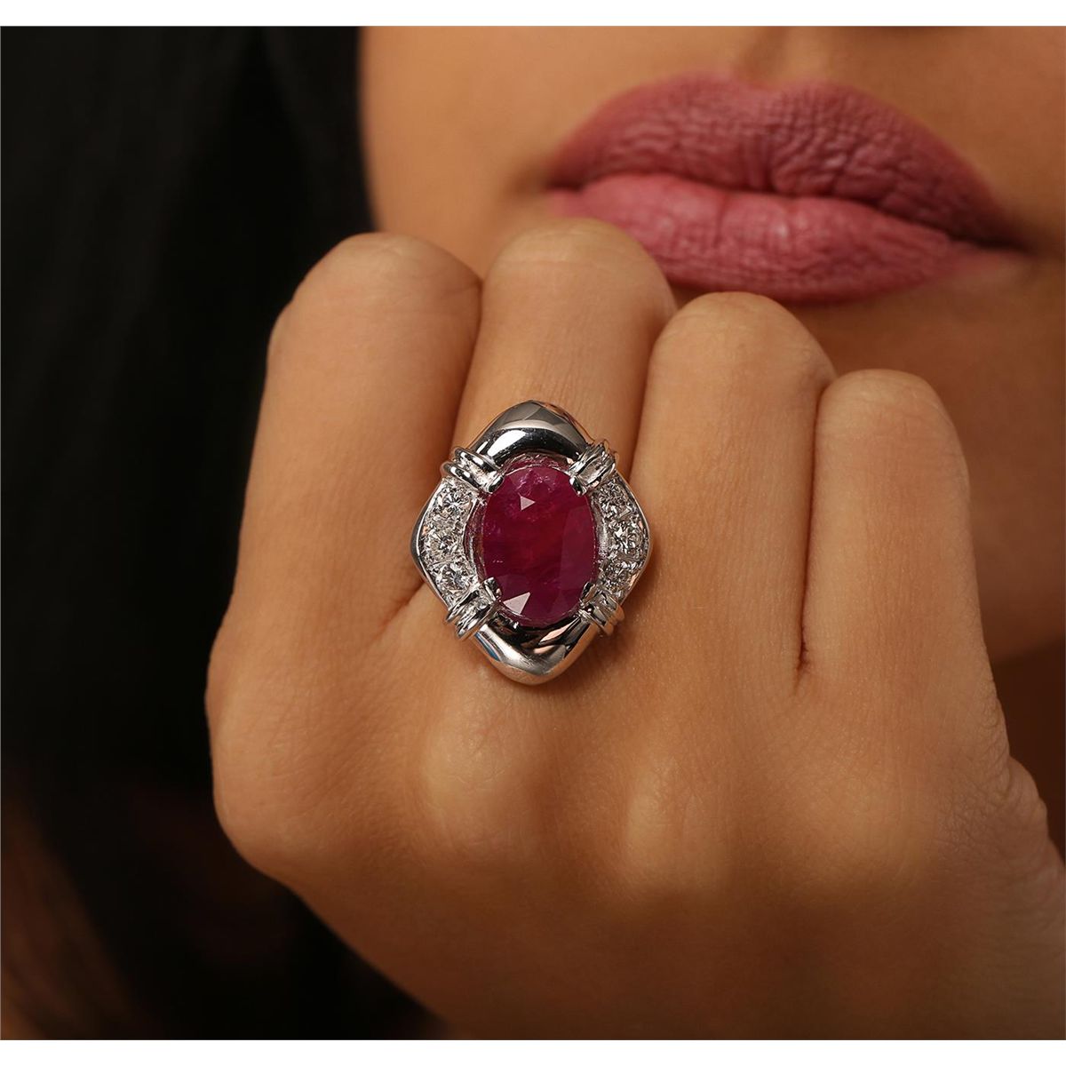 One electronically tested 14KT white gold Ladies combination cast & assembled ring with a bright polish finish. Condition is new. Identified with markings of "14K". Containing: One prong set oval modified mixed cut natural ruby, measuring 13.50 x 10.50 x 5.00.mm, approximate weight of 5.76ct., clarity is heavily included, type II, medium dark, moderately strong, strongly purplish red color, (GIA stpR 6/4), cut is good. Indications of heat treatment with glass and flux residue. Colored gemstones are presumed to have been subjected to commonly used color/clarity enhancement processes. Six bead set round brilliant cut diamonds, measuring 3.00. - 3.00. x 1.80mm (depth est.) approximate. Total Weight of 6 Stones = 0.59ct. Clarity: SI-1 to SI-2. Color: H - I, Cut is Good. Total Weight of Colored Stones 5.76ct. Total Weight of Diamonds 0.59ct. Total Weight of Ring 11.30 grams. GGL Appraised at $7,130.00.