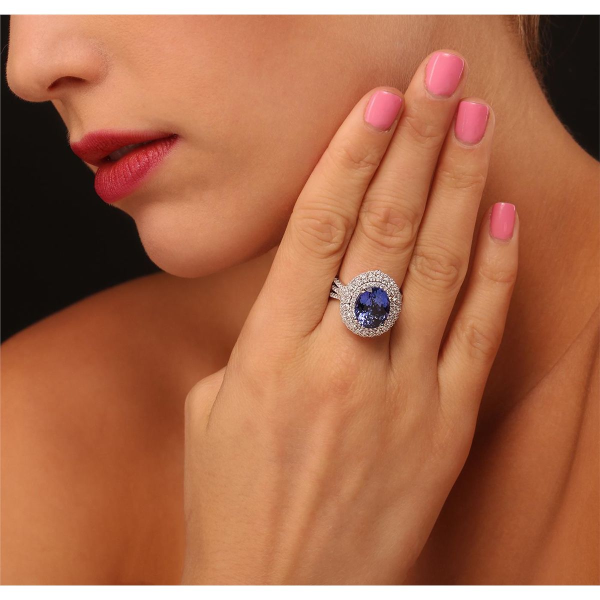 One electronically tested 14KT white gold ladies cast tanzanite and diamond ring with a bright polish finish. Condition is new, good workmanship. The featured tanzanite is set within a two tired diamond lattice gallery, supported by diamond set three way split shoulders and completed by a three and one-half millimeter wide band. Identified with markings of "14K". Containing: One prong set oval mixed cut natural tanzanite, measuring 12.30 x 10.00 x 6.30mm, approximate weight of 5.76ct., clarity is eye clean, type I, medium dark, very slightly grayish, bluish violet color, (GIA bV 6/3), cut is good. Transmitting light with no distortion, transparent. Colored Stone Grading Report attached. Graded in the setting. Tanzanite is a very rare gemstone that is only found in the country of Tanzania. Originally discovered in 1967. Tiffany & Company, named the stone Tanzanite. It is found in the Usumburu Mountains that border the Umba Valley of northern Tanzania. Tanzanite occurs in gray, brown, violet, blue, reddish-purple, & green. The gem is interesting because of its exceptional pleochroism. Rotated in different directions a tanzanite will exhibit multiple changes of color. Tanzanite has a low tolerance to ultrasonic cleaning, and should not be cleaned using this method. One Hundred Forty-Seven prong set round brilliant cut diamonds, measuring 1.90 - 0.90 x 0.84mm (depth est.) approximate. Total Weight of 147 Stones = 1.52ct. Graded in the setting. Clarity: SI-2 to I-2. Color: G - I. Total Weight of Colored Stones 5.76ct. Total Weight of Diamonds 1.52ct. Total Weight of Ring 10.00grams. AIG Appraised at $19,515.00.