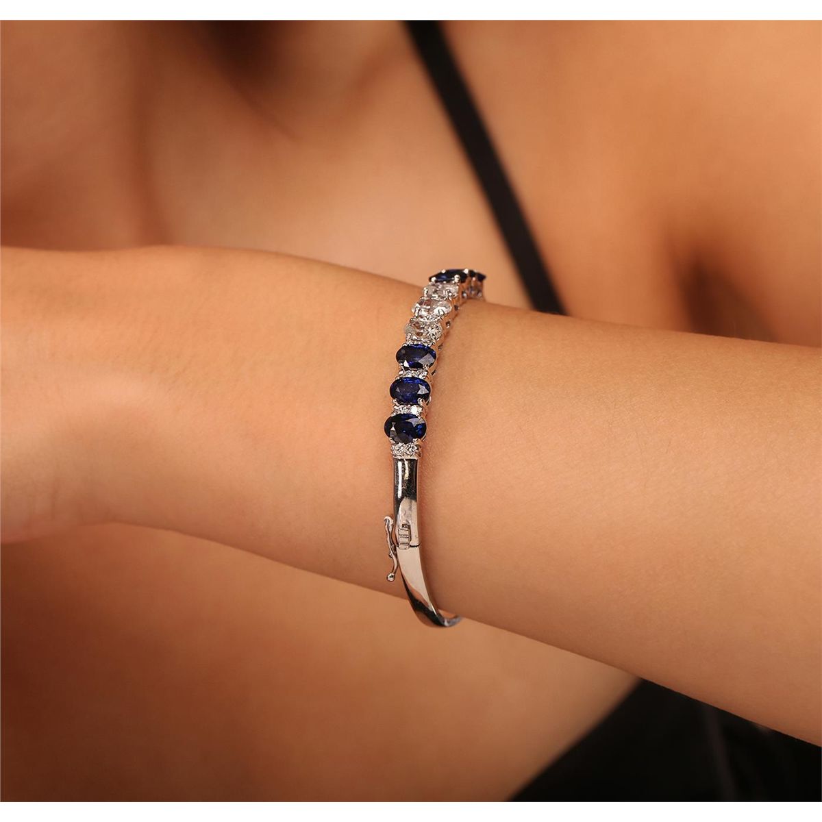 One electronically tested 14KT white gold ladies cast & assembled sapphire and diamond bangle bracelet with a bright polish finish. Condition is new, good workmanship. Seven inch length bangle bracelet features a sapphire and diamond ribbon supported by a hinged shoulder, terminating in a concealed clasp with safety. Identified with markings of "K14". Containing: Six prong set oval mixed cut natural blue sapphires, measuring 6.80 x 5.00. x 3.25mm, 6%. bulge factor, approximate. Total Weight of 5.76ct., clarity is slightly included, type II, dark, strong, violetish blue color, (GIA vB 7/5), cut is good. Transmitting light with a minimum of distortion, transparent, Naturally occurring internal & external characteristics are present. Intermittent color zoning present. Indications of laboratory high temperature diffusion treatment. Measurements & the color grade are an average for the group. Graded in the setting. Three prong set oval shaped cut diamonds, measuring 8.00. x 4.60 x 2.90mm (depth est.) approximate. Total Weight of 3 Stones = 2.24ct. Graded in the setting. Clarity: I-1 to I-2 . Color: H - I Twenty prong set round brilliant cut diamonds, measuring 2.00. - 1.80 x 1.14mm (depth est.) approximate. Total Weight of 20 Stones = 0.60ct. Graded in the setting. Clarity: SI-2 to I-2 . Color: G - I. Total Weight of Colored Stones 5.76ct.. Total Weight of Diamonds 2.84ct.. Total Weight of Bangle Bracelet 17.60gm. AIG Appraised at $17,540.00.