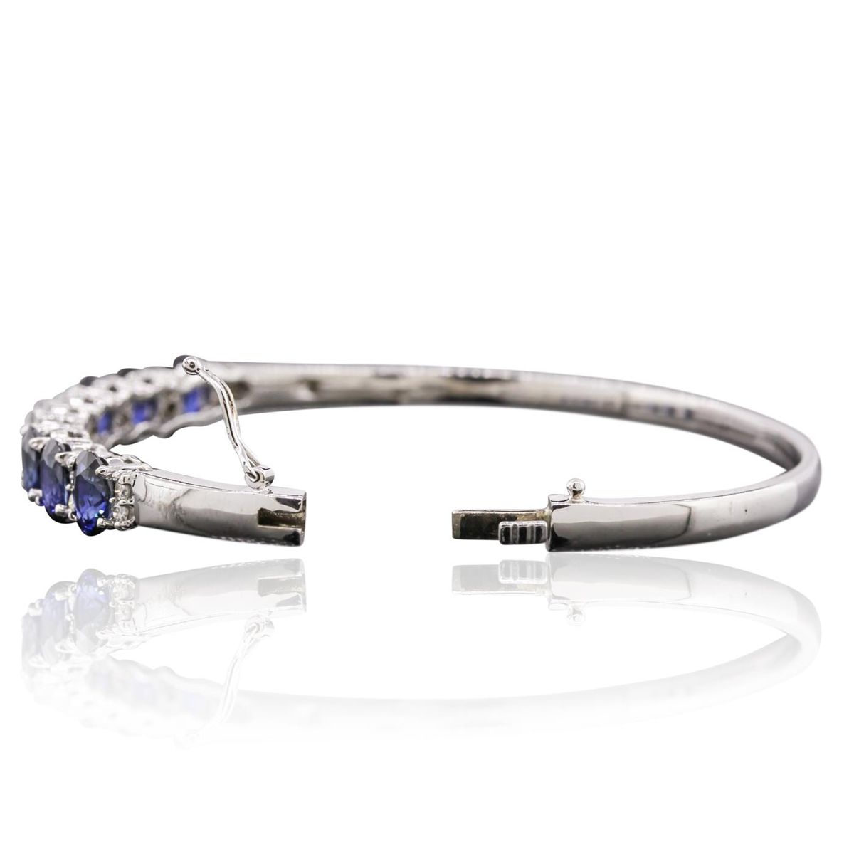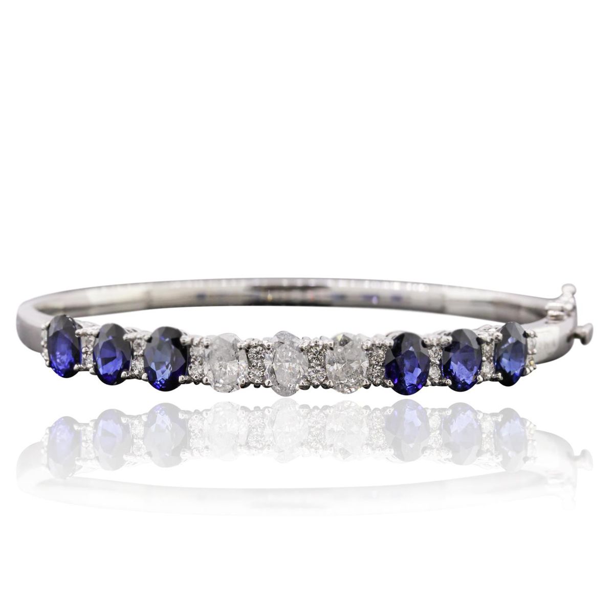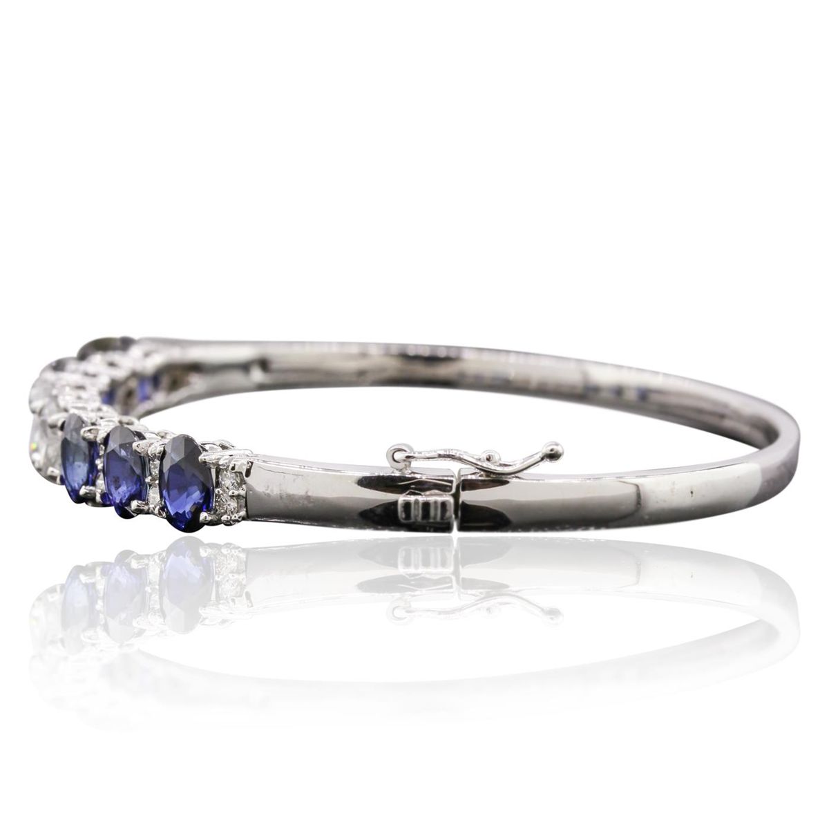One electronically tested 14KT white gold ladies cast & assembled sapphire and diamond bangle bracelet with a bright polish finish. Condition is new, good workmanship. Seven inch length bangle bracelet features a sapphire and diamond ribbon supported by a hinged shoulder, terminating in a concealed clasp with safety. Identified with markings of "K14". Containing: Six prong set oval mixed cut natural blue sapphires, measuring 6.80 x 5.00. x 3.25mm, 6%. bulge factor, approximate. Total Weight of 5.76ct., clarity is slightly included, type II, dark, strong, violetish blue color, (GIA vB 7/5), cut is good. Transmitting light with a minimum of distortion, transparent, Naturally occurring internal & external characteristics are present. Intermittent color zoning present. Indications of laboratory high temperature diffusion treatment. Measurements & the color grade are an average for the group. Graded in the setting. Three prong set oval shaped cut diamonds, measuring 8.00. x 4.60 x 2.90mm (depth est.) approximate. Total Weight of 3 Stones = 2.24ct. Graded in the setting. Clarity: I-1 to I-2 . Color: H - I Twenty prong set round brilliant cut diamonds, measuring 2.00. - 1.80 x 1.14mm (depth est.) approximate. Total Weight of 20 Stones = 0.60ct. Graded in the setting. Clarity: SI-2 to I-2 . Color: G - I. Total Weight of Colored Stones 5.76ct.. Total Weight of Diamonds 2.84ct.. Total Weight of Bangle Bracelet 17.60gm. AIG Appraised at $17,540.00.