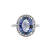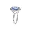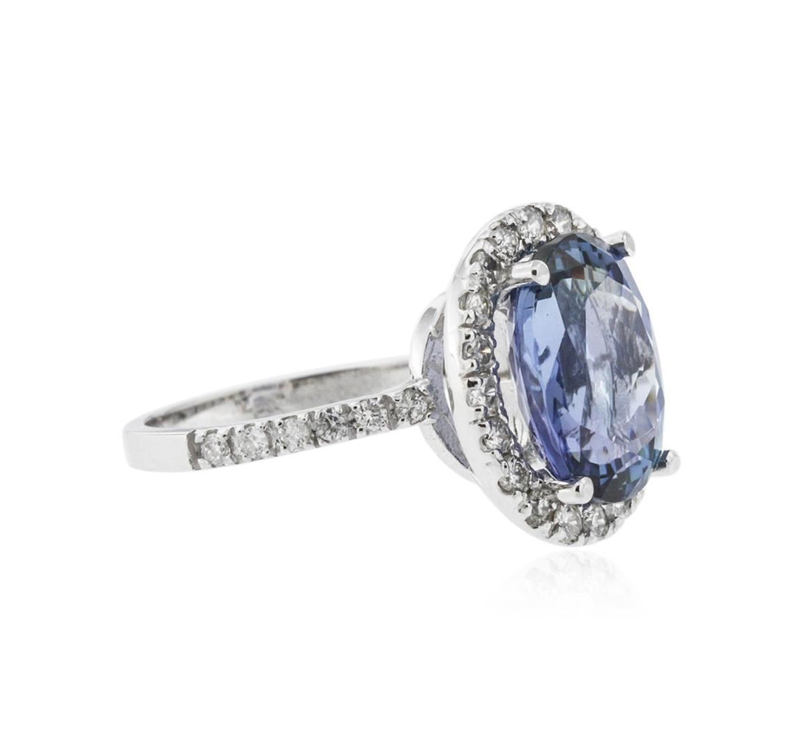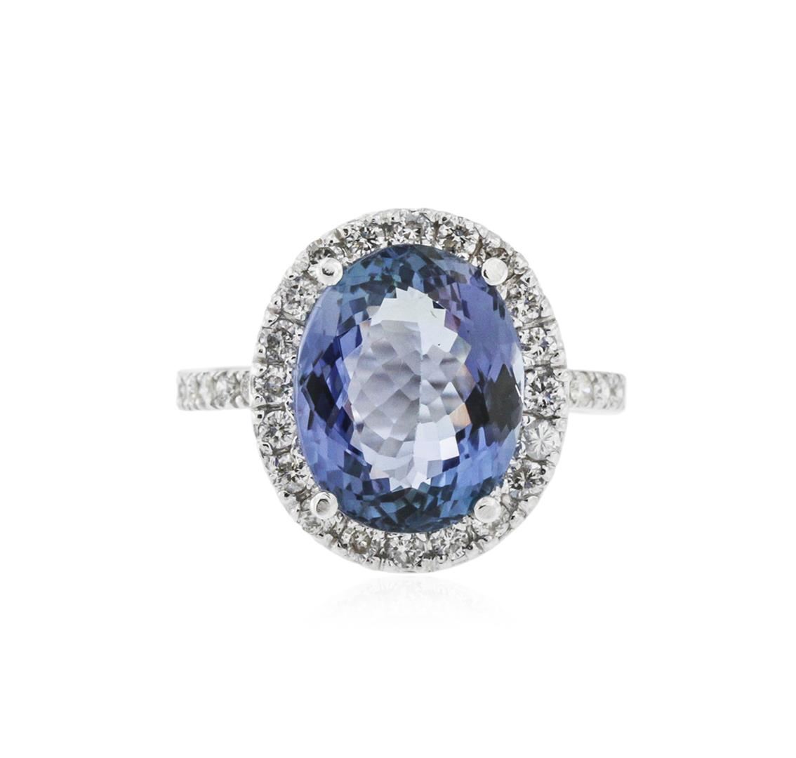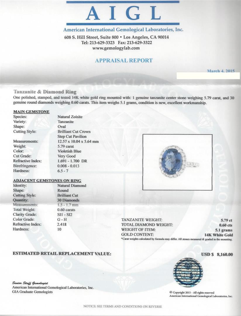 One polished, stamped, and tested 14K white gold ring mounted with: 1 genuine tanzanite center stone weighing 5.79 carat, and 30 genuine round diamonds weighing 0.60 carats. This item weighs 5.1 grams, condition is new, excellent workmanship. MAIN GEMSTONE: Species: Natural Zoisite. Variety: Tanzanite. Shape: Oval. Cutting Style: Brilliant Cut Crown Step Cut Pavilion. Measurements: 12.57 x 10.04 x 5.64 mm. Weight: 5.79 carat. Color: Violetish Blue. Cut Grade: Very Good. Refractive Index: 1.691 - 1.700 DR. Birefringence: 0.008 - 0.013. Hardness: 6.5 - 7. ADJACENT GEMSTONES ON RING: Identity: Natural Diamond. Shape: Round. Cutting Style: Brilliant Cut. Quantity: 30 Diamonds. Measurements: 1.5 - 1.7 mm. Total Weight: 0.60 carats. Clarity Grade: SI1 - SI2. Color Grade: G - H. Refractive Index: 2.418. Hardness: 10. Tanzanite Weight: 5.79 ct. Total Diamond Weight: 0.60 cts. Weight of Item: 5.1 grams. Gold Content: 14K White Gold. AIGL Appraised at $8,160.00.