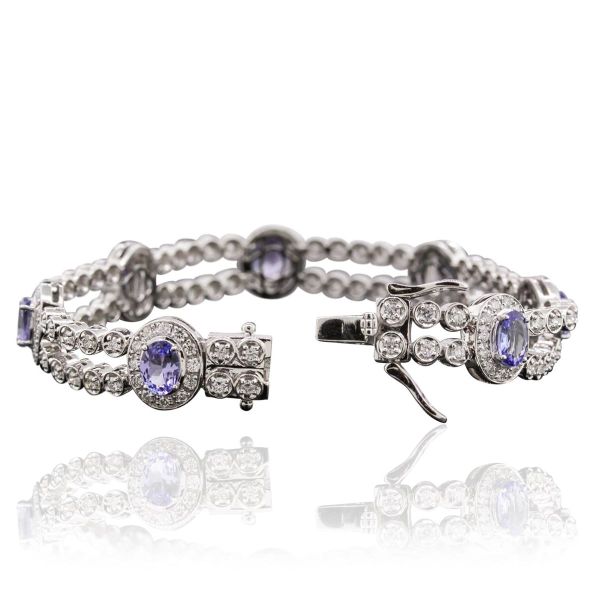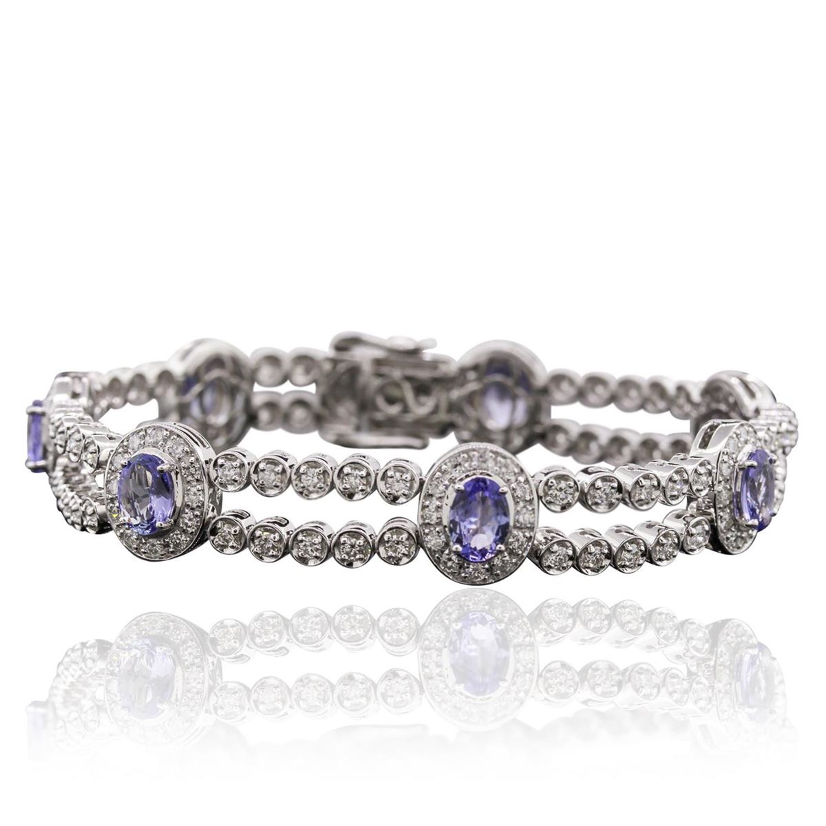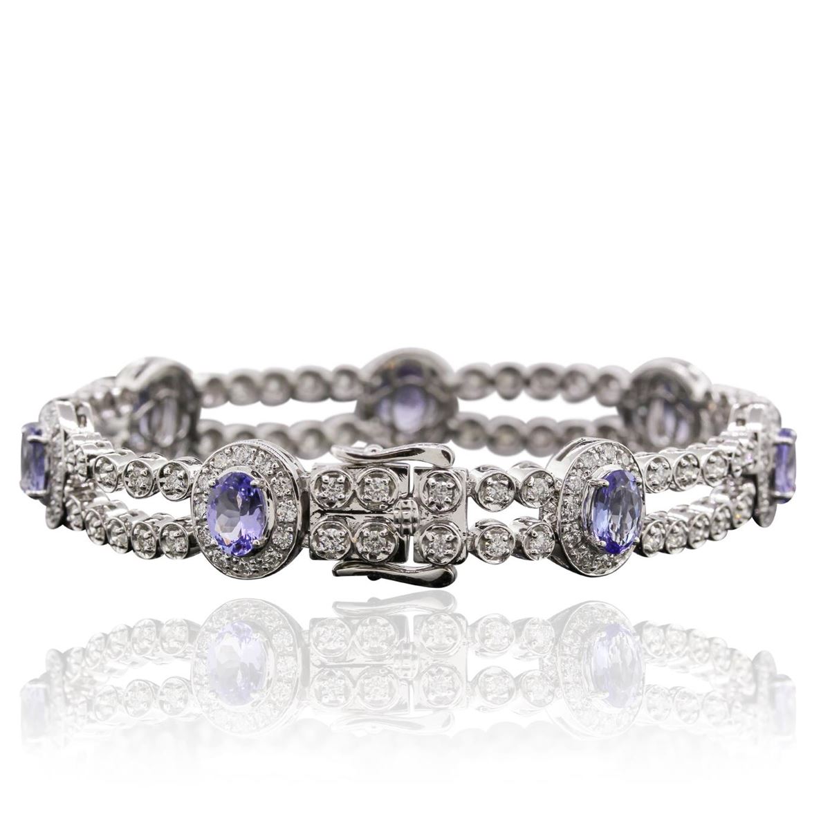 One electronically tested 14KT white gold ladies cast & assembled tanzanite and diamond bracelet with a bright polish finish. Condition is new, good workmanship. The seven and one-quarter inch length bracelet features tanzanite and diamond bezels, interconnected by diamond set rigid ribbons, terminating in a concealed box clasp with twin safeties. Identified with markings of "14K". Containing: Seven prong set oval mixed cut natural tanzanites, measuring 7.00 x 5.00 x 3.25mm, 6%. bulge factor, approximate. Total Weight of 5.81ct., clarity is eye clean, type I, medium, very slightly grayish, violet color, (GIA V 5/3), cut is good. Transmitting light with a minimum of distortion, transparent. Measurements & the color grade are an average for the group. Graded in the setting. Tanzanite is a very rare gemstone that is only found in the country of Tanzania. Originally discovered in 1967. Tiffany & Company, named the stone Tanzanite. It is found in the Usumburu Mountains that border the Umba Valley of northern Tanzania. Tanzanite occurs in gray, brown, violet, blue, reddish-purple, & green. The gem is interesting because of its exceptional pleochroism. Rotated in different directions a tanzanite will exhibit multiple changes of color. Tanzanite has a low tolerance to ultrasonic cleaning, and should not be cleaned using this method. One Hundred Fifty-Four bead set round brilliant cut diamonds, measuring 1.80 - 1.70 x 1.05mm (depth est.) approximate. Total Weight of 154 Stones = 3.11ct. Graded in the setting. Clarity: SI-2 to I-1. Color: F - H. Total Weight of Colored Stones 5.81ct. Total Weight of Diamonds 3.11ct. Total Weight of Bracelet 27.70 grams. AIG Appraised at $18,200.00.