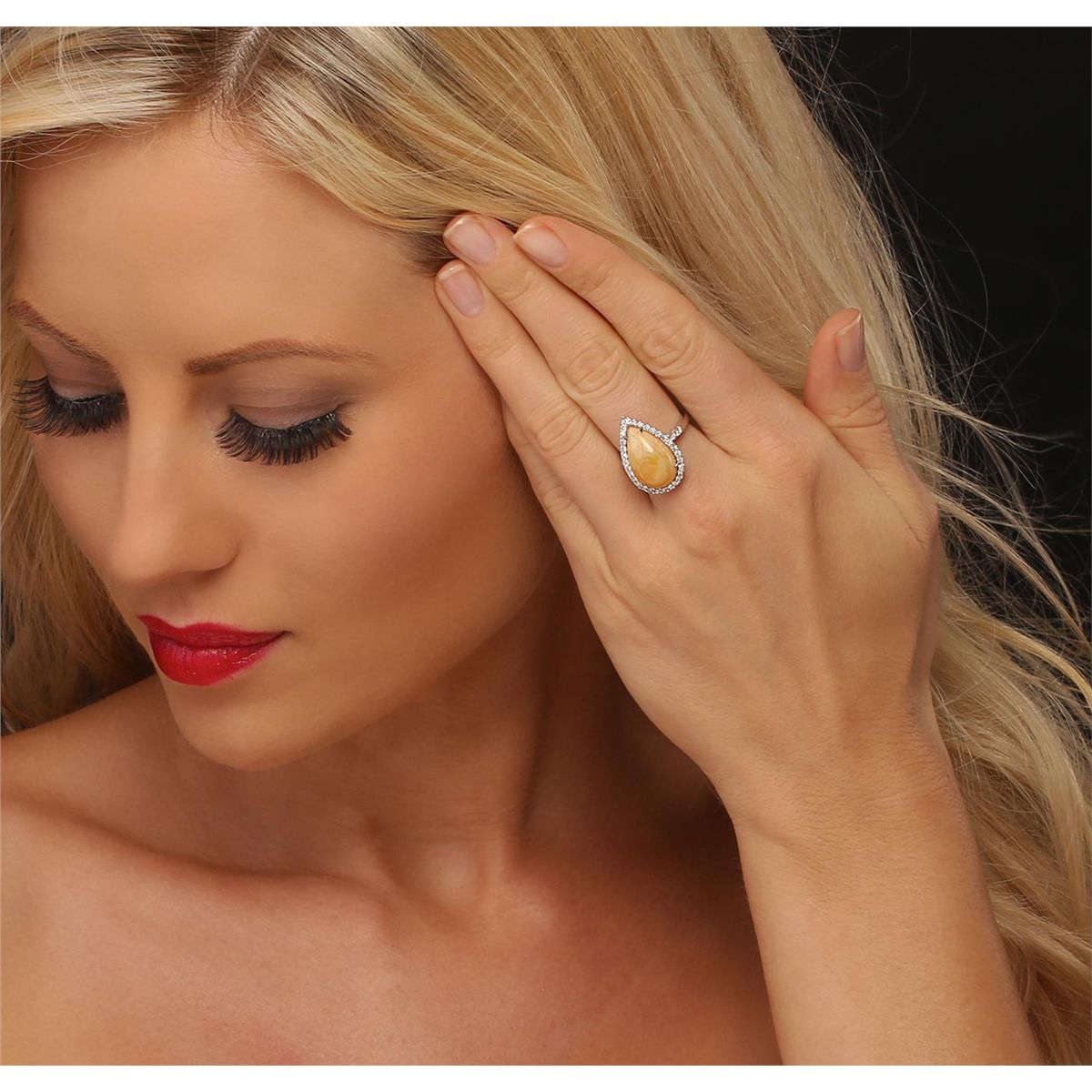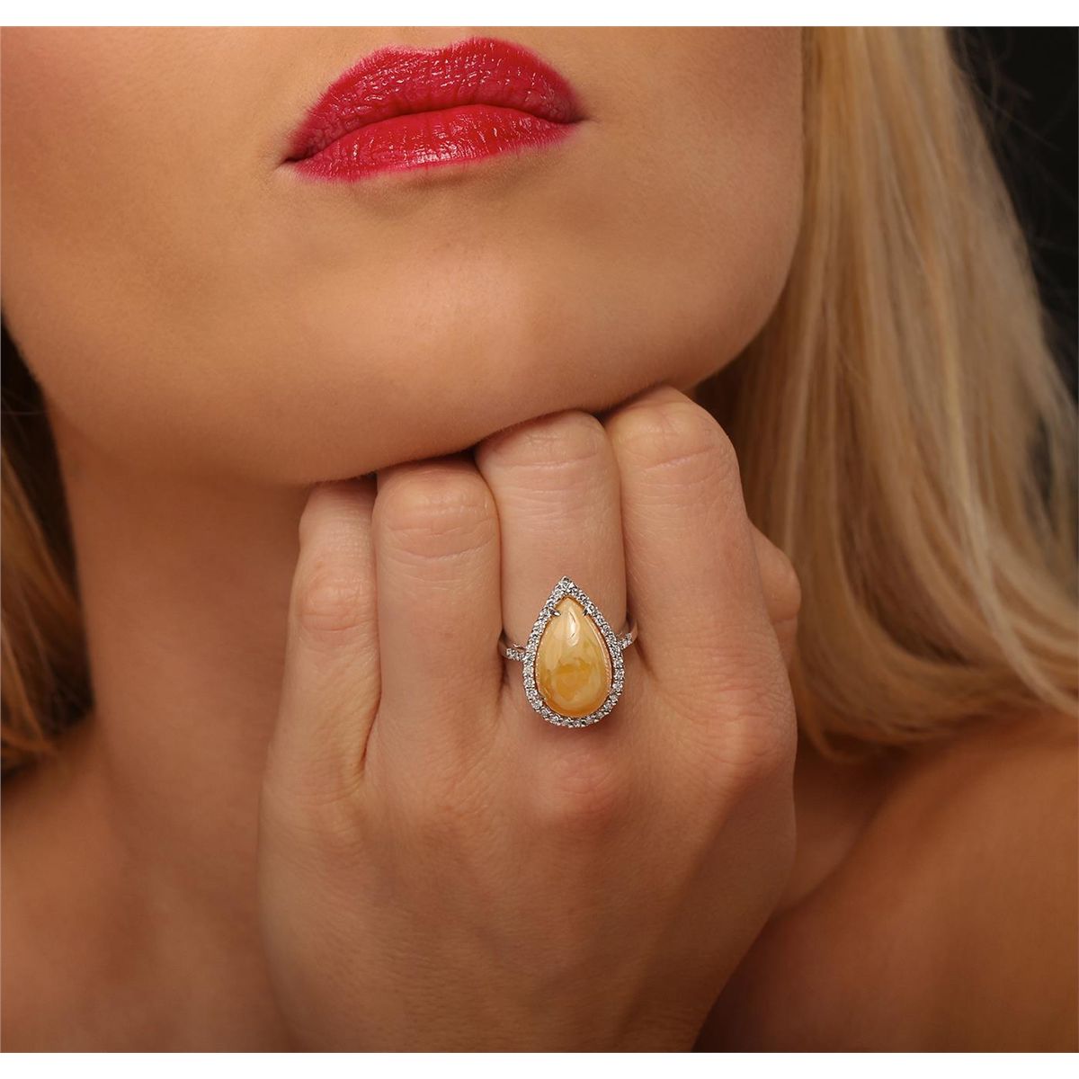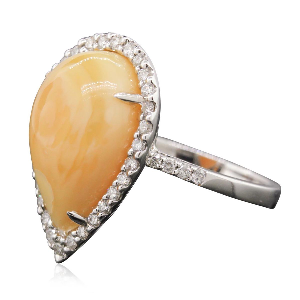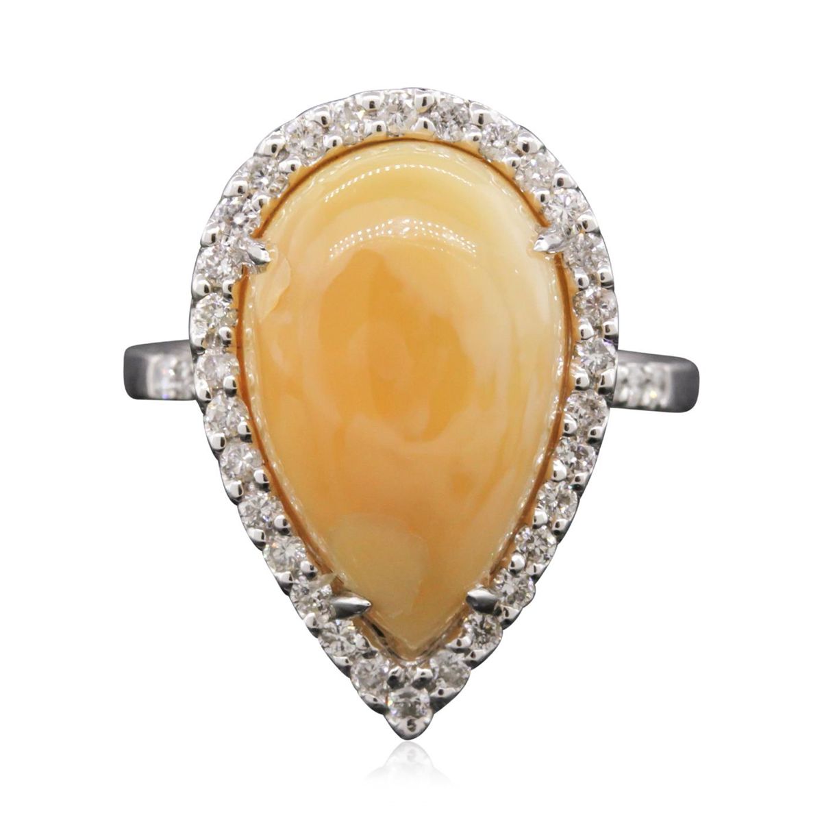 One electronically tested 14KT white gold ladies cast opal and diamond ring with a bright finish. The featured Ethiopian opal is set within a diamond bezel, supported by diamond set shoulders and completed by a two millimeter wide band. Trademark is M. Christoff. Identified with markings of "14K". Condition is good. Containing: One Ethiopian opal that is cut in a pear shaped cabochon and is prong set, measuring 1.70mm long x 1.00mm wide and 7.00mm thick and the approximate weight is 5.82 carats. The opal has a light yellowish-orange color, a high dome, and a good cut. Graded in the setting. Thirty-Eight prong set round brilliant cut diamonds, measuring 1.50 - 1.40 x 0.87mm (depth est) approximate total weight of 38 stones = 0.42ct. Graded in the setting. Clarity SI-2 to I-1 Color G-H. Total weight of opal 5.82ct. Total weight of diamonds 0.42ct. Total weight of ring 4.81 grams. AIG Appraised at $3,050.00.