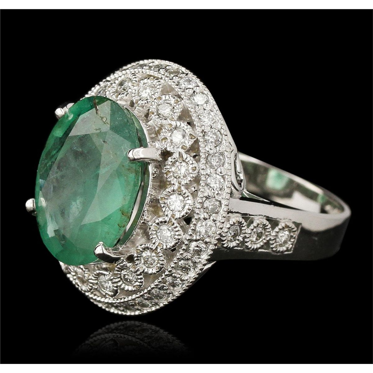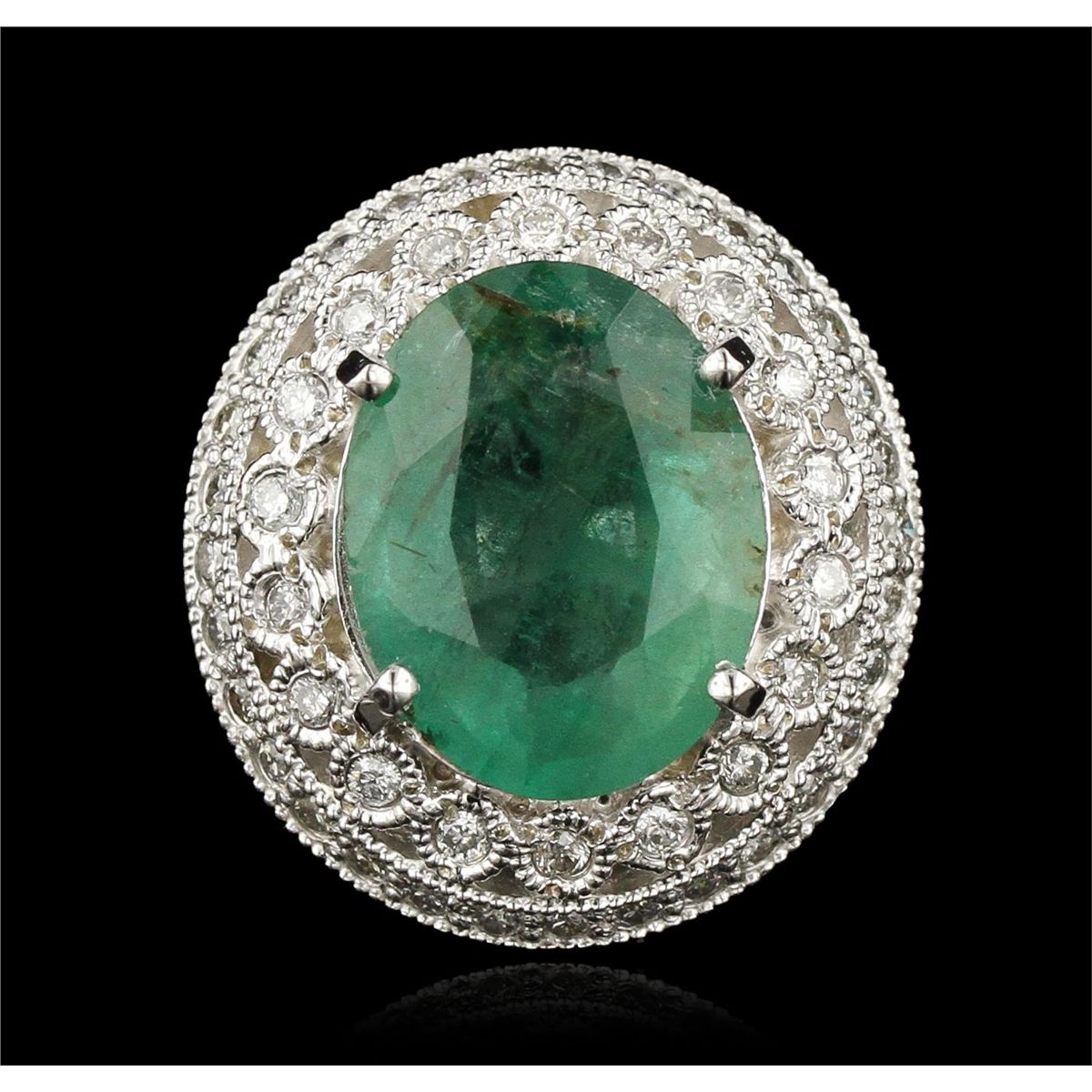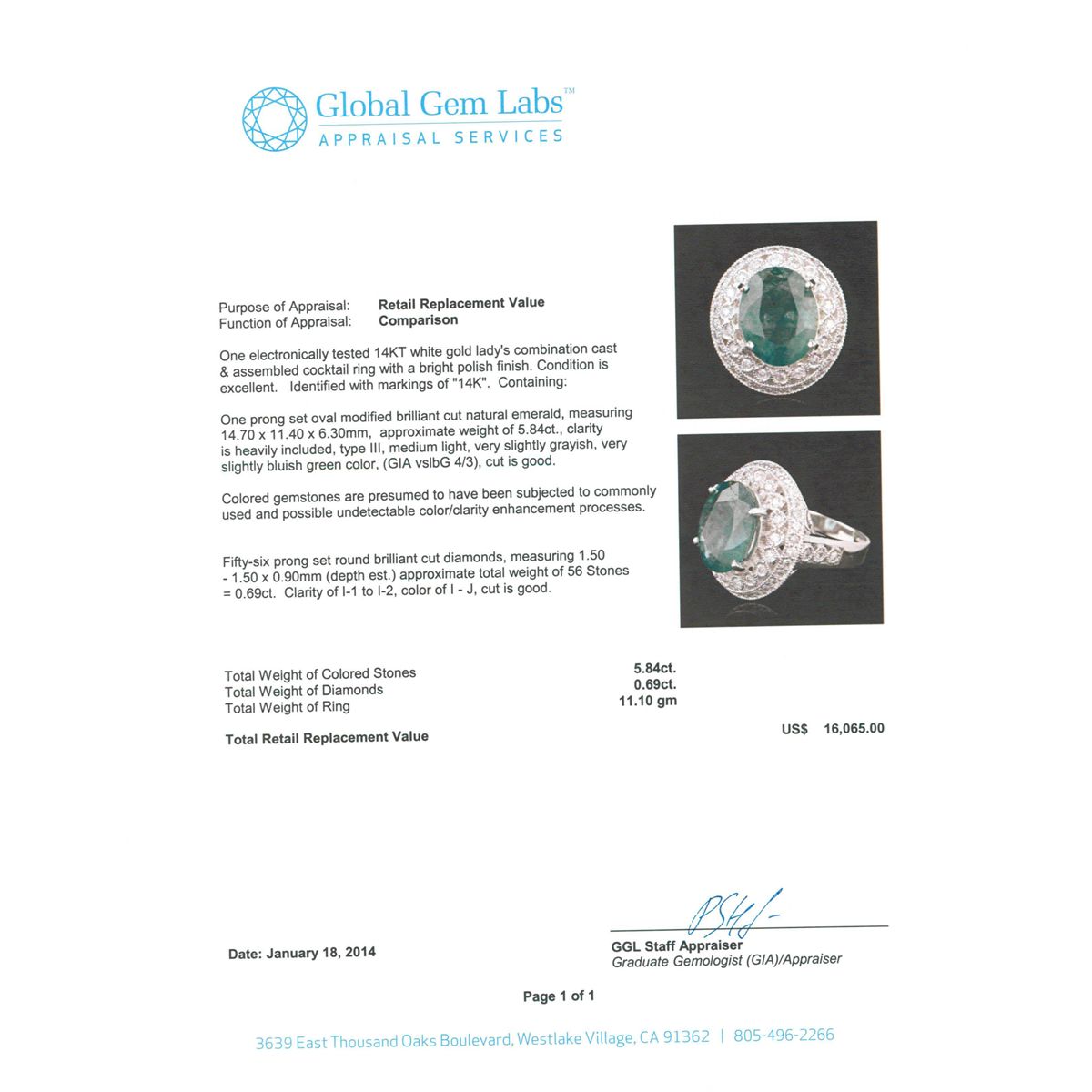 One electronically tested 14KT white gold Ladies combination cast & assembled cocktail ring with a bright polish finish. Identified with markings of "14K". Condition is excellent. Containing: One prong set oval modified brilliant cut natural emerald, measuring 14.70 x 11.40 x 6.30mm, approximate weight of 5.84ct., clarity is heavily included, type III, medium light, very slightly grayish, very slightly bluish green color, (GIA vslbG 4/3), cut is good. Colored gemstones are presumed to have been subjected to commonly used and possible undetectable color/clarity enhancement processes. Fifty-Six prong set round brilliant cut diamonds, measuring 1.50 - 1.50 x 0.90mm (depth est.) approximate total weight of 56 Stones = 0.69ct. Clarity of I-1 to I-2, Color of I - J, Cut is Good. Total Weight of Colored Stones 5.84ct. Total Weight of Diamonds 0.69ct. Total Weight of Ring 11.10gm. GGL Appraised at $16,065.00.