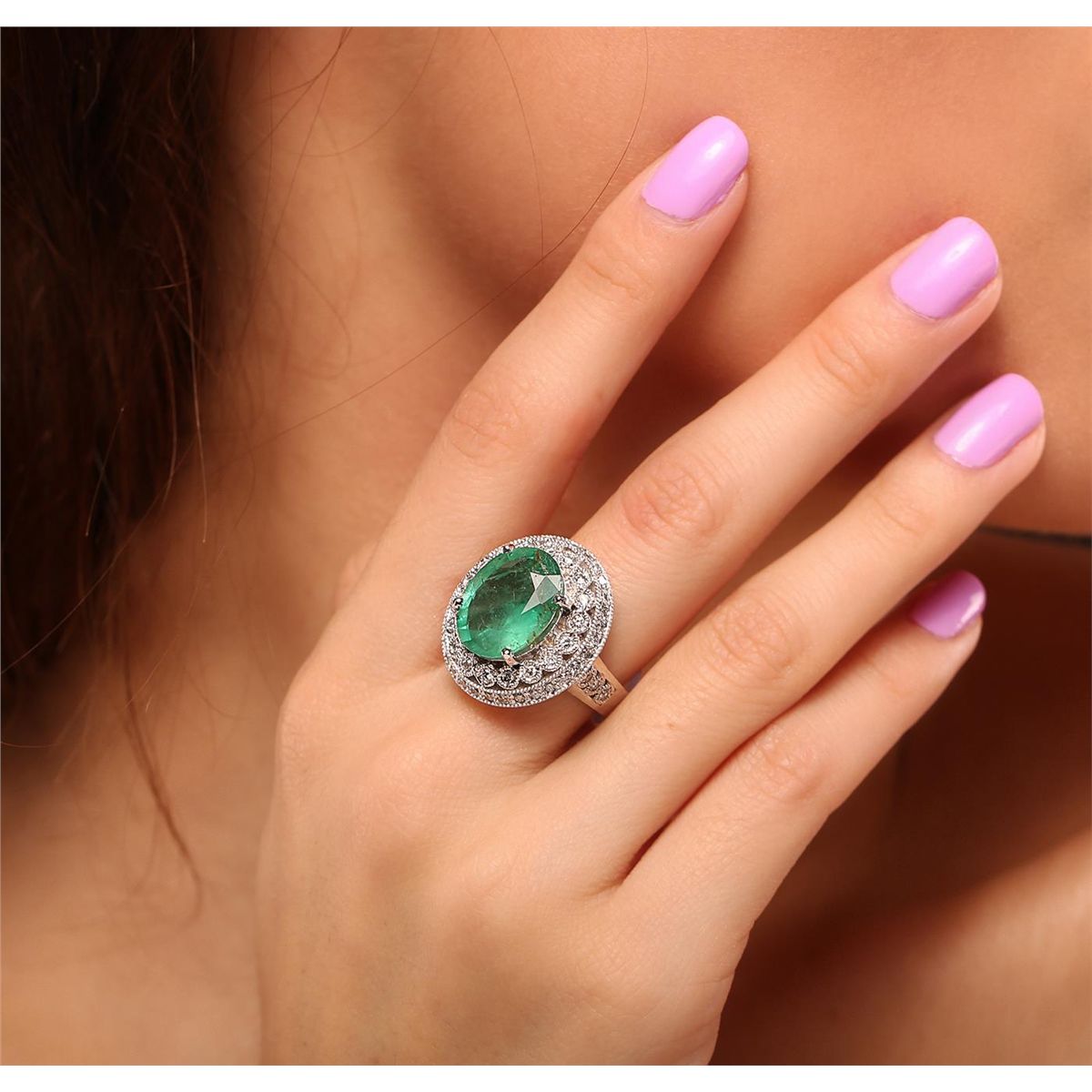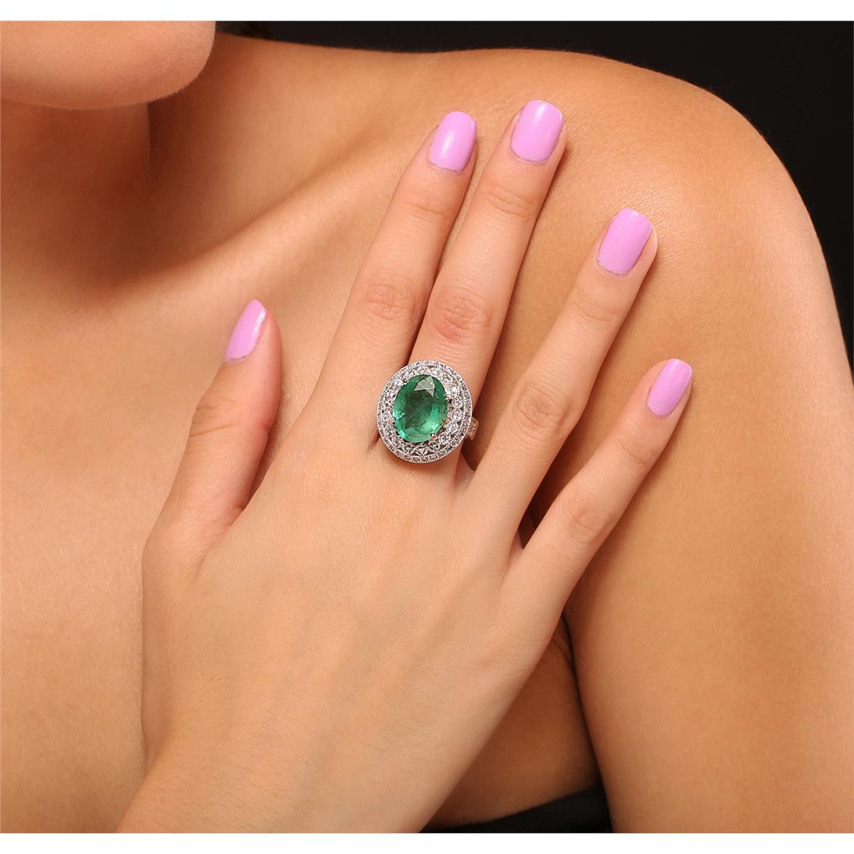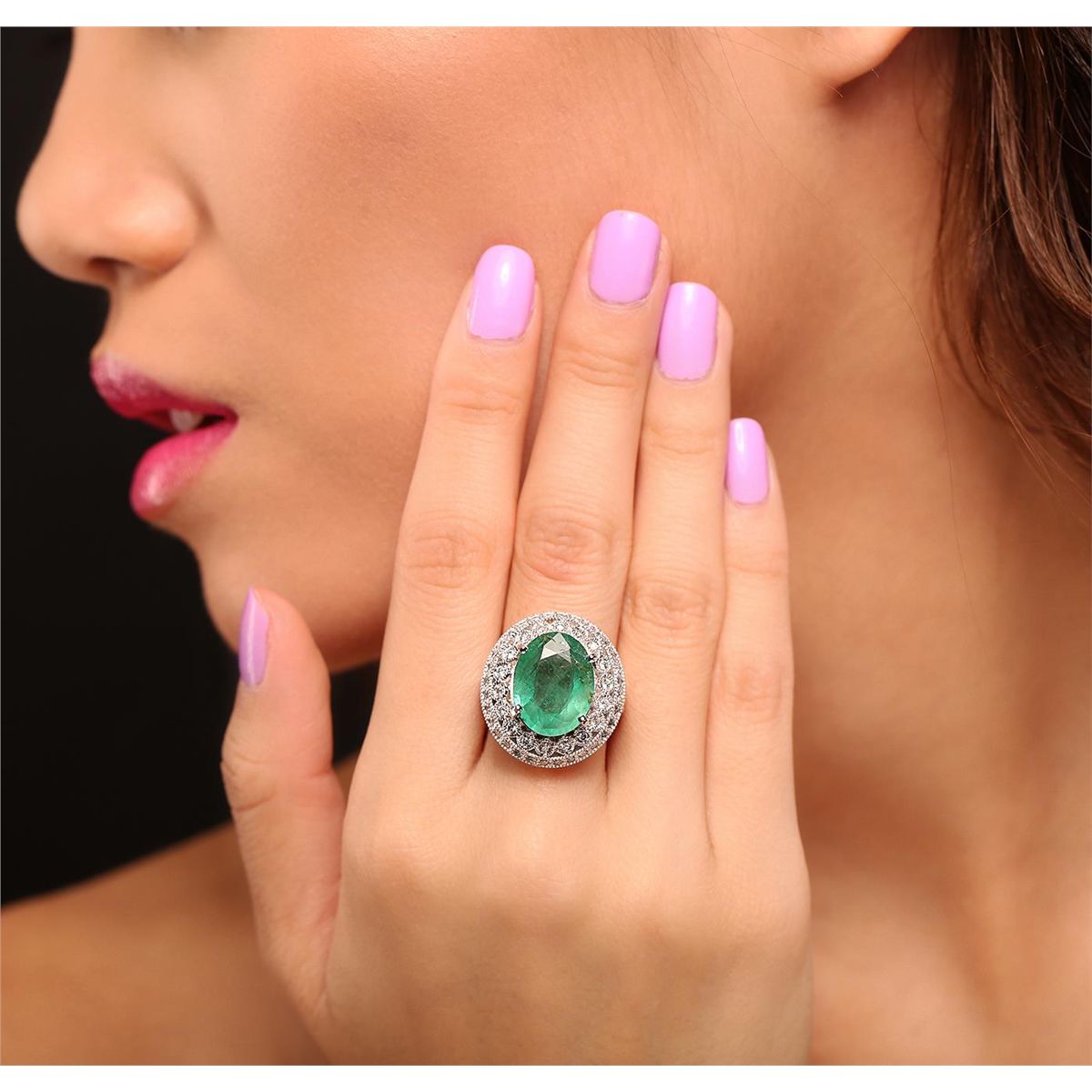 One electronically tested 14KT white gold Ladies combination cast & assembled cocktail ring with a bright polish finish. Identified with markings of "14K". Condition is excellent. Containing: One prong set oval modified brilliant cut natural emerald, measuring 14.70 x 11.40 x 6.30mm, approximate weight of 5.84ct., clarity is heavily included, type III, medium light, very slightly grayish, very slightly bluish green color, (GIA vslbG 4/3), cut is good. Colored gemstones are presumed to have been subjected to commonly used and possible undetectable color/clarity enhancement processes. Fifty-Six prong set round brilliant cut diamonds, measuring 1.50 - 1.50 x 0.90mm (depth est.) approximate total weight of 56 Stones = 0.69ct. Clarity of I-1 to I-2, Color of I - J, Cut is Good. Total Weight of Colored Stones 5.84ct. Total Weight of Diamonds 0.69ct. Total Weight of Ring 11.10gm. GGL Appraised at $16,065.00.