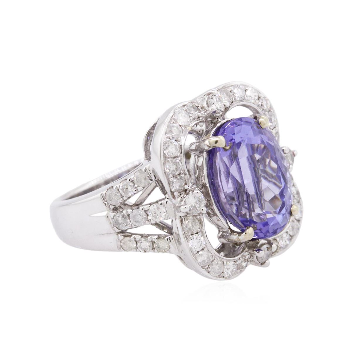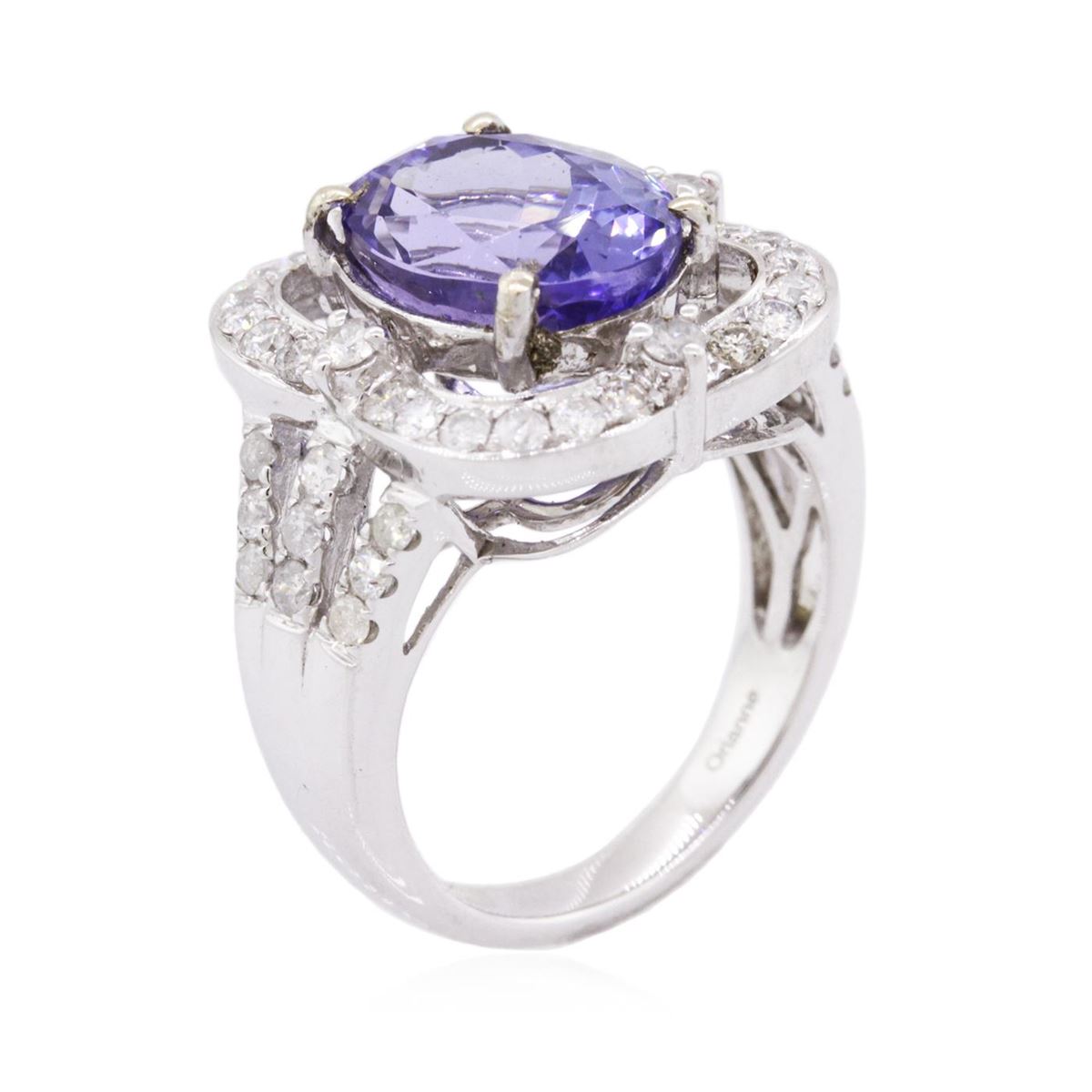 One electronically tested 14KT white gold ladies cast tanzanite and diamond ring with a bright polish finish. The featured tanzanite is set within a stylized diamond bezel supported by diamond set three-way split shoulders, completed by a two and one-half millimeter wide band. Trademark is Orianne. Identified with markings of "14K". Condition is new, good workmanship. Containing: One prong set oval brilliant cut natural tanzanite, measuring 12.00 x 8.85 x 7.51mm, 7% bulge factor, approximate weight of 5.85ct., clarity is eye clean, type I, medium dark, very slightly grayish, bluish violet color, (GIA bV 6/3), cut is good. Transmitting light with no distortion, transparent. Colored Stone Grading Report attached. Graded in the setting. Tanzanite is a very rare gemstone that is only found in the country of Tanzania. Originally discovered in 1967. Tiffany & Company, named the stone Tanzanite. It is found in the Usumburu Mountains that border the Umba Valley of northern Tanzania. Tanzanite occurs in gray, brown, violet, blue, reddish-purple, & green. The gem is interesting because of its exceptional pleochroism. Rotated in different directions a tanzanite will exhibit multiple changes of color. Tanzanite has a low tolerance to ultrasonic cleaning, and should not be cleaned using this method. Forty-Six prong set round brilliant cut diamonds, measuring 2.20 - 1.70 x 1.17mm (depth est.) approximate total weight of 46 Stones = 1.20ct. Graded in the setting. Clarity: I-1 to I-2. Color: G - I. Total Weight of Colored Stones 5.85ct. Total Weight of Diamonds 1.20ct. Total Weight of Ring 8.33 grams. AIG Appraised at $18,635.00.
