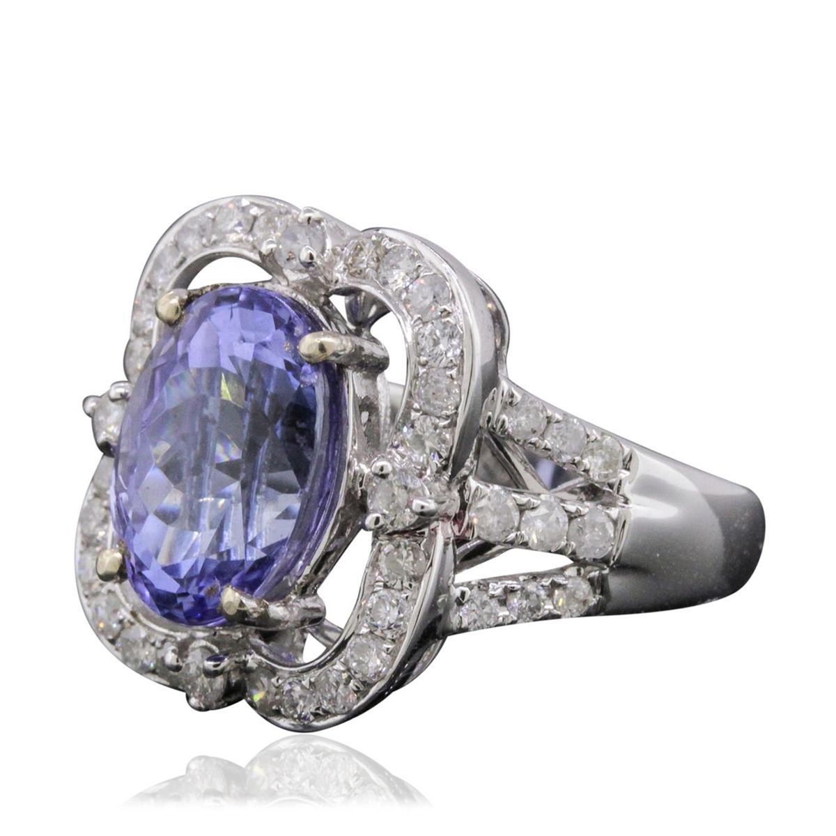 One electronically tested 14KT white gold ladies cast tanzanite and diamond ring with a bright polish finish. The featured tanzanite is set within a stylized diamond bezel supported by diamond set three-way split shoulders, completed by a two and one-half millimeter wide band. Trademark is Orianne. Identified with markings of "14K". Condition is new, good workmanship. Containing: One prong set oval brilliant cut natural tanzanite, measuring 12.00 x 8.85 x 7.51mm, 7% bulge factor, approximate weight of 5.85ct., clarity is eye clean, type I, medium dark, very slightly grayish, bluish violet color, (GIA bV 6/3), cut is good. Transmitting light with no distortion, transparent. Colored Stone Grading Report attached. Graded in the setting. Tanzanite is a very rare gemstone that is only found in the country of Tanzania. Originally discovered in 1967. Tiffany & Company, named the stone Tanzanite. It is found in the Usumburu Mountains that border the Umba Valley of northern Tanzania. Tanzanite occurs in gray, brown, violet, blue, reddish-purple, & green. The gem is interesting because of its exceptional pleochroism. Rotated in different directions a tanzanite will exhibit multiple changes of color. Tanzanite has a low tolerance to ultrasonic cleaning, and should not be cleaned using this method. Forty-Six prong set round brilliant cut diamonds, measuring 2.20 - 1.70 x 1.17mm (depth est.) approximate total weight of 46 Stones = 1.20ct. Graded in the setting. Clarity: I-1 to I-2. Color: G - I. Total Weight of Colored Stones 5.85ct. Total Weight of Diamonds 1.20ct. Total Weight of Ring 8.33 grams. AIG Appraised at $18,635.00.