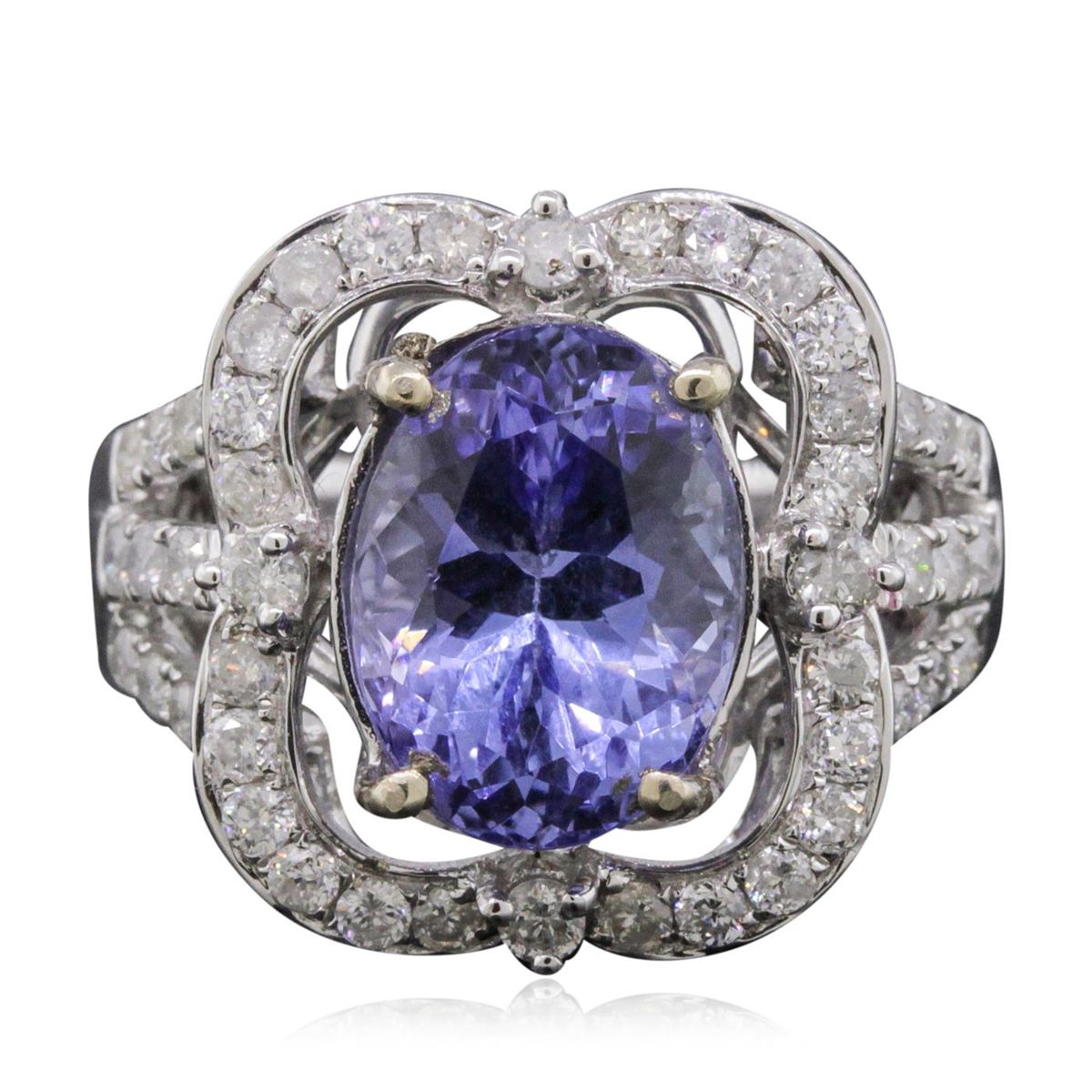One electronically tested 14KT white gold ladies cast tanzanite and diamond ring with a bright polish finish. The featured tanzanite is set within a stylized diamond bezel supported by diamond set three-way split shoulders, completed by a two and one-half millimeter wide band. Trademark is Orianne. Identified with markings of "14K". Condition is new, good workmanship. Containing: One prong set oval brilliant cut natural tanzanite, measuring 12.00 x 8.85 x 7.51mm, 7% bulge factor, approximate weight of 5.85ct., clarity is eye clean, type I, medium dark, very slightly grayish, bluish violet color, (GIA bV 6/3), cut is good. Transmitting light with no distortion, transparent. Colored Stone Grading Report attached. Graded in the setting. Tanzanite is a very rare gemstone that is only found in the country of Tanzania. Originally discovered in 1967. Tiffany & Company, named the stone Tanzanite. It is found in the Usumburu Mountains that border the Umba Valley of northern Tanzania. Tanzanite occurs in gray, brown, violet, blue, reddish-purple, & green. The gem is interesting because of its exceptional pleochroism. Rotated in different directions a tanzanite will exhibit multiple changes of color. Tanzanite has a low tolerance to ultrasonic cleaning, and should not be cleaned using this method. Forty-Six prong set round brilliant cut diamonds, measuring 2.20 - 1.70 x 1.17mm (depth est.) approximate total weight of 46 Stones = 1.20ct. Graded in the setting. Clarity: I-1 to I-2. Color: G - I. Total Weight of Colored Stones 5.85ct. Total Weight of Diamonds 1.20ct. Total Weight of Ring 8.33 grams. AIG Appraised at $18,635.00.
