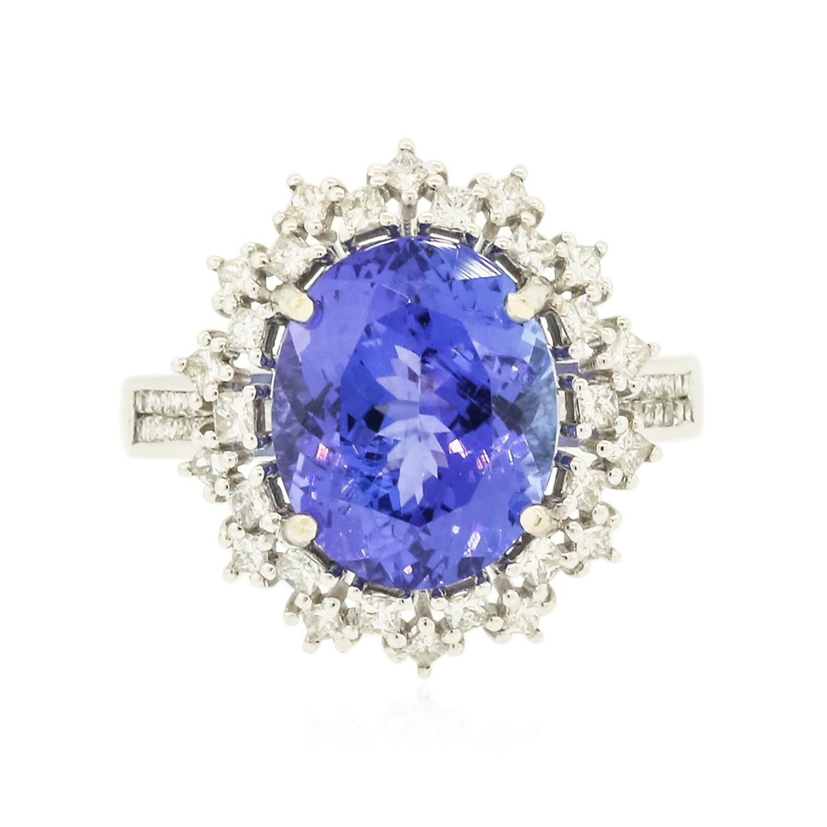 One electronically tested 14KT white gold ladies cast tanzanite and diamond ring with a bright polish finish. The featured tanzanite is set within two tiered diamond bezels supported by diamond set shoulders, completed by a three millimeter wide band. Trademark is Orianne. Identified with markings of "14K". Condition is new, good workmanship. Containing: One prong set oval brilliant cut natural tanzanite, measuring 12.30 x 9.90 x 6.70mm, 6% bulge factor, approximate weight of 5.86ct., clarity is eye clean, type I, medium dark, very slightly grayish, violetish blue color, (GIA vB 6/3), cut is good. Transmitting light with a minimum of distortion, transparent. Naturally occurring internal & external characteristics are present. Colored Stone Grading Report attached. Graded in the setting. Tanzanite is a very rare gemstone that is only found in the country of Tanzania. Originally discovered in 1967. Tiffany & Company, named the stone Tanzanite. It is found in the Usumburu Mountains that border the Umba Valley of northern Tanzania. Tanzanite occurs in gray, brown, violet, blue, reddish-purple, & green. The gem is interesting because of its exceptional pleochroism. Rotated in different directions a tanzanite will exhibit multiple changes of color. Tanzanite has a low tolerance to ultrasonic cleaning, and should not be cleaned using this method. Twenty-Eight prong set princess cut diamonds, measuring 1.60 x 1.50 x 1.13mm (depth est.) approximate total weight of 28 Stones = 0.72ct. Graded in the setting. Clarity: SI-1 to I-1. Color: G - I Thirty-Six channel set princess cut diamonds, measuring 1.00 x 1.00 x 0.75mm (depth est.) approximate total weight of 36 Stones = 0.32ct. Graded in the setting. Clarity: VS-1 to SI-1. Color: G - I. Total Weight of Colored Stones 5.86ct. Total Weight of Diamonds 1.04ct. Total Weight of Ring 4.73 grams. AIG Appraised at $18,055.00.
