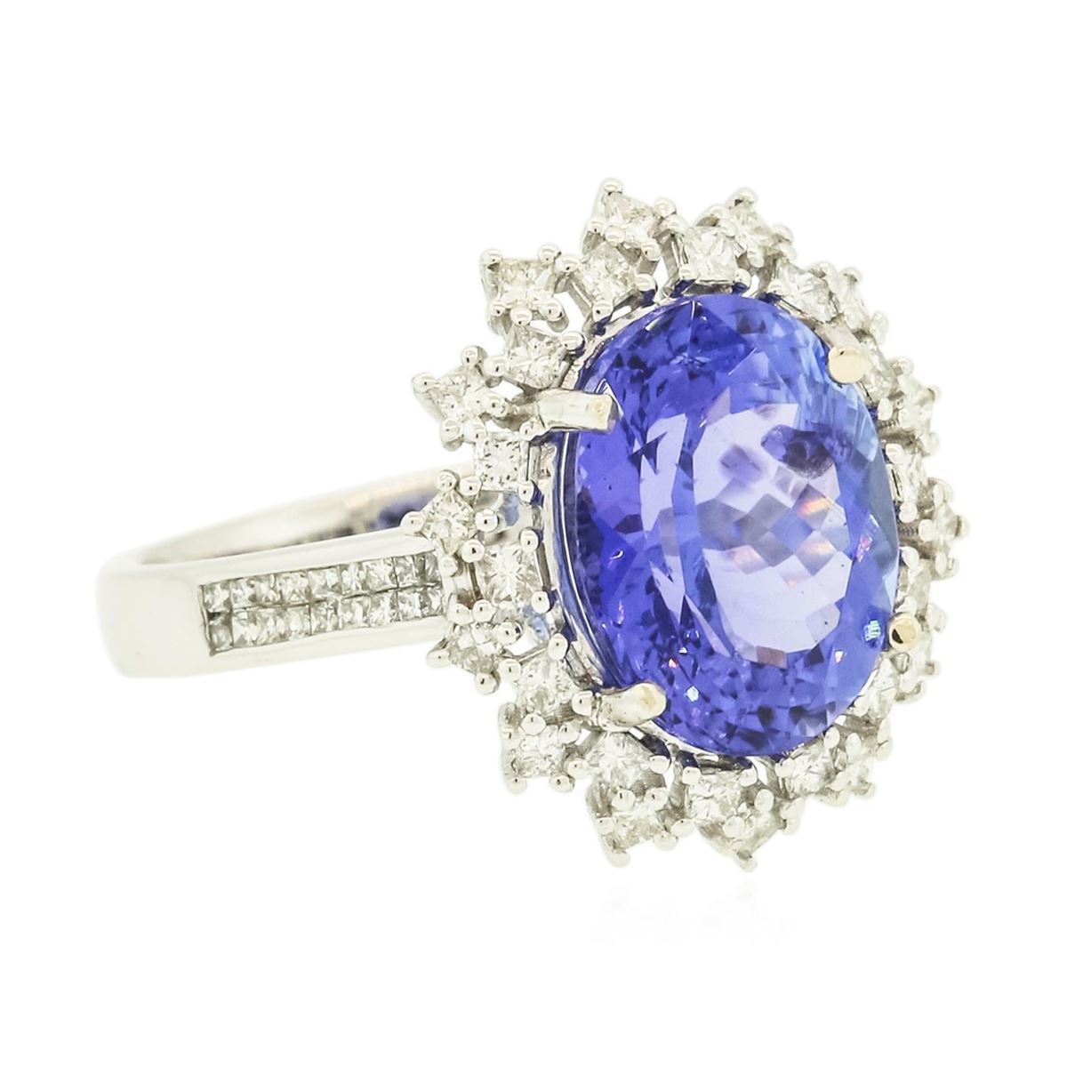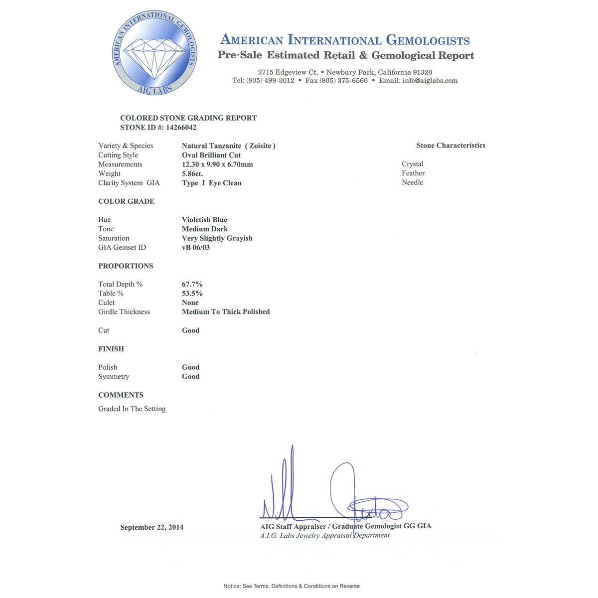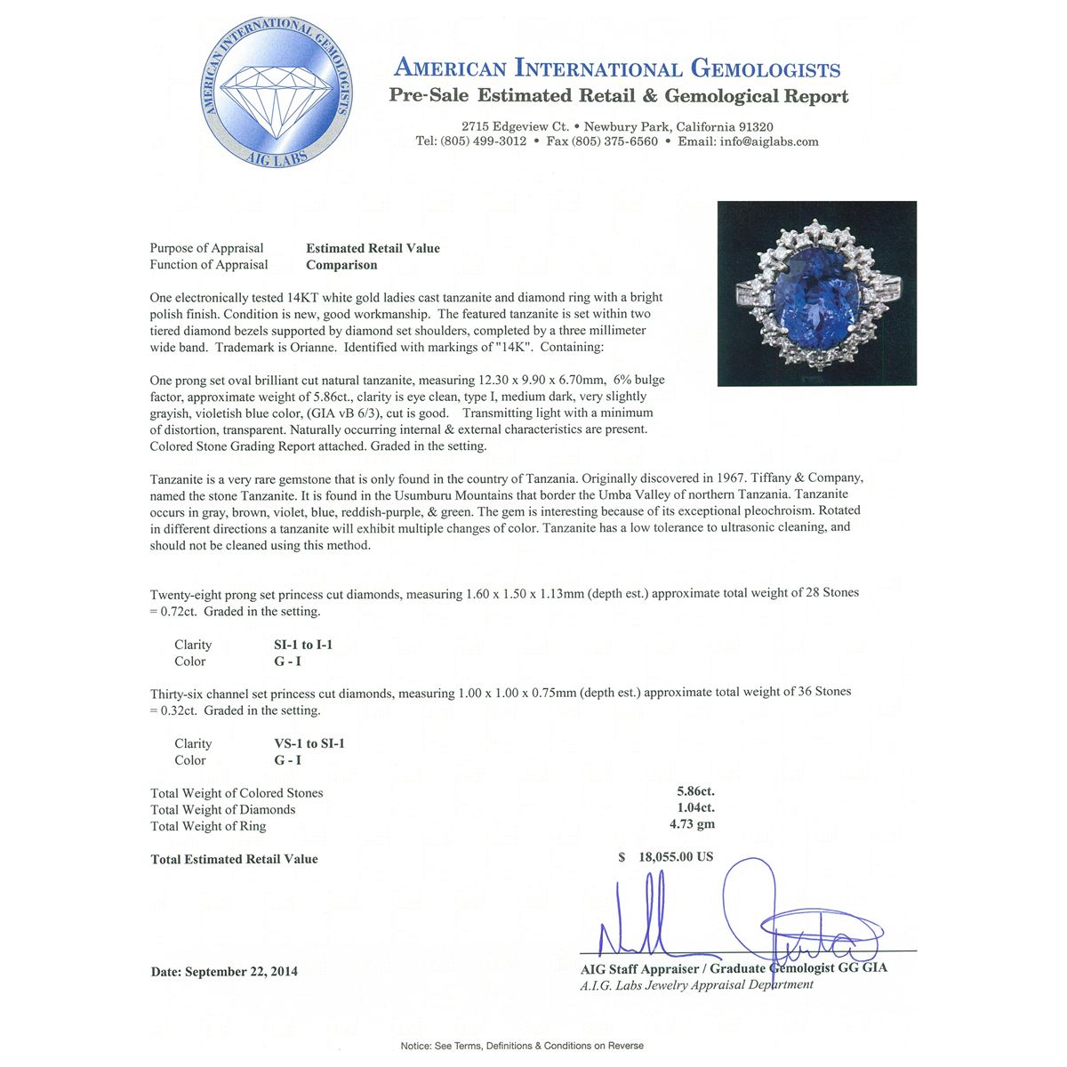 One electronically tested 14KT white gold ladies cast tanzanite and diamond ring with a bright polish finish. The featured tanzanite is set within two tiered diamond bezels supported by diamond set shoulders, completed by a three millimeter wide band. Trademark is Orianne. Identified with markings of "14K". Condition is new, good workmanship. Containing: One prong set oval brilliant cut natural tanzanite, measuring 12.30 x 9.90 x 6.70mm, 6% bulge factor, approximate weight of 5.86ct., clarity is eye clean, type I, medium dark, very slightly grayish, violetish blue color, (GIA vB 6/3), cut is good. Transmitting light with a minimum of distortion, transparent. Naturally occurring internal & external characteristics are present. Colored Stone Grading Report attached. Graded in the setting. Tanzanite is a very rare gemstone that is only found in the country of Tanzania. Originally discovered in 1967. Tiffany & Company, named the stone Tanzanite. It is found in the Usumburu Mountains that border the Umba Valley of northern Tanzania. Tanzanite occurs in gray, brown, violet, blue, reddish-purple, & green. The gem is interesting because of its exceptional pleochroism. Rotated in different directions a tanzanite will exhibit multiple changes of color. Tanzanite has a low tolerance to ultrasonic cleaning, and should not be cleaned using this method. Twenty-Eight prong set princess cut diamonds, measuring 1.60 x 1.50 x 1.13mm (depth est.) approximate total weight of 28 Stones = 0.72ct. Graded in the setting. Clarity: SI-1 to I-1. Color: G - I Thirty-Six channel set princess cut diamonds, measuring 1.00 x 1.00 x 0.75mm (depth est.) approximate total weight of 36 Stones = 0.32ct. Graded in the setting. Clarity: VS-1 to SI-1. Color: G - I. Total Weight of Colored Stones 5.86ct. Total Weight of Diamonds 1.04ct. Total Weight of Ring 4.73 grams. AIG Appraised at $18,055.00.