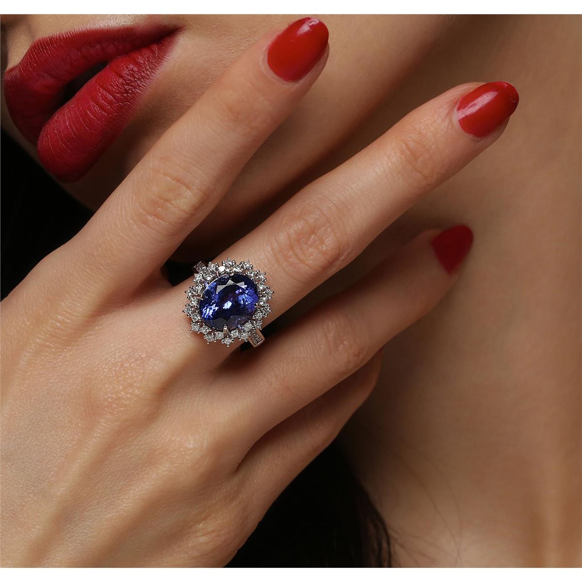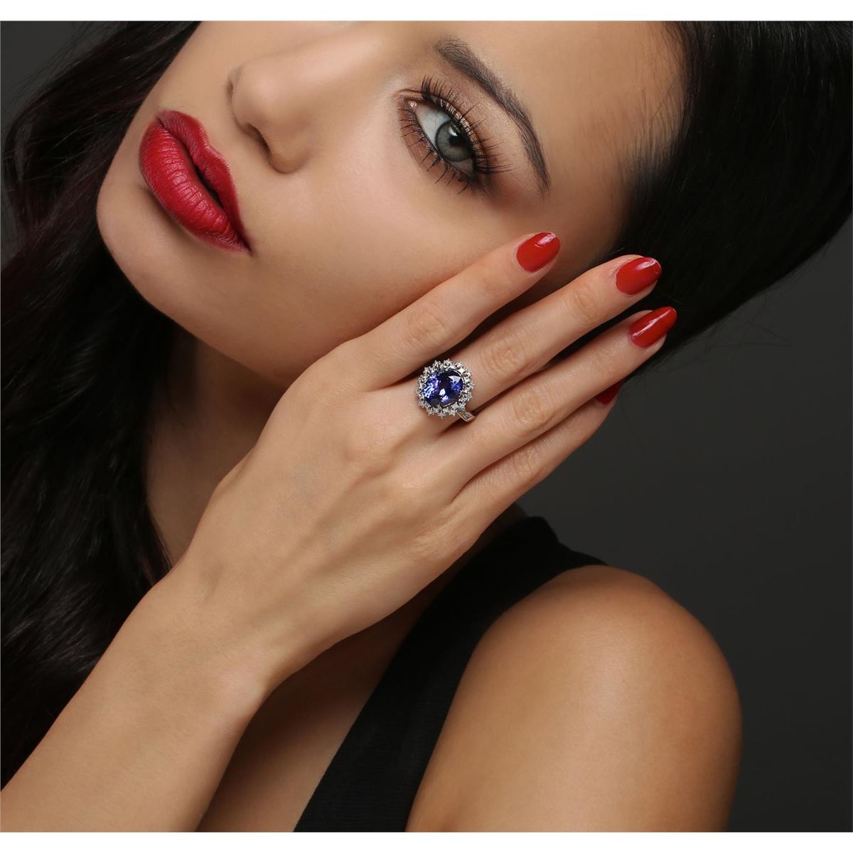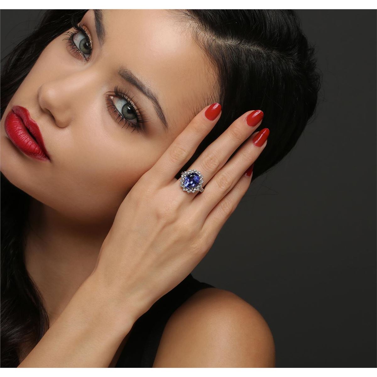 One electronically tested 14KT white gold ladies cast tanzanite and diamond ring with a bright polish finish. The featured tanzanite is set within two tiered diamond bezels supported by diamond set shoulders, completed by a three millimeter wide band. Trademark is Orianne. Identified with markings of "14K". Condition is new, good workmanship. Containing: One prong set oval brilliant cut natural tanzanite, measuring 12.30 x 9.90 x 6.70mm, 6% bulge factor, approximate weight of 5.86ct., clarity is eye clean, type I, medium dark, very slightly grayish, violetish blue color, (GIA vB 6/3), cut is good. Transmitting light with a minimum of distortion, transparent. Naturally occurring internal & external characteristics are present. Colored Stone Grading Report attached. Graded in the setting. Tanzanite is a very rare gemstone that is only found in the country of Tanzania. Originally discovered in 1967. Tiffany & Company, named the stone Tanzanite. It is found in the Usumburu Mountains that border the Umba Valley of northern Tanzania. Tanzanite occurs in gray, brown, violet, blue, reddish-purple, & green. The gem is interesting because of its exceptional pleochroism. Rotated in different directions a tanzanite will exhibit multiple changes of color. Tanzanite has a low tolerance to ultrasonic cleaning, and should not be cleaned using this method. Twenty-Eight prong set princess cut diamonds, measuring 1.60 x 1.50 x 1.13mm (depth est.) approximate total weight of 28 Stones = 0.72ct. Graded in the setting. Clarity: SI-1 to I-1. Color: G - I Thirty-Six channel set princess cut diamonds, measuring 1.00 x 1.00 x 0.75mm (depth est.) approximate total weight of 36 Stones = 0.32ct. Graded in the setting. Clarity: VS-1 to SI-1. Color: G - I. Total Weight of Colored Stones 5.86ct. Total Weight of Diamonds 1.04ct. Total Weight of Ring 4.73 grams. AIG Appraised at $18,055.00.