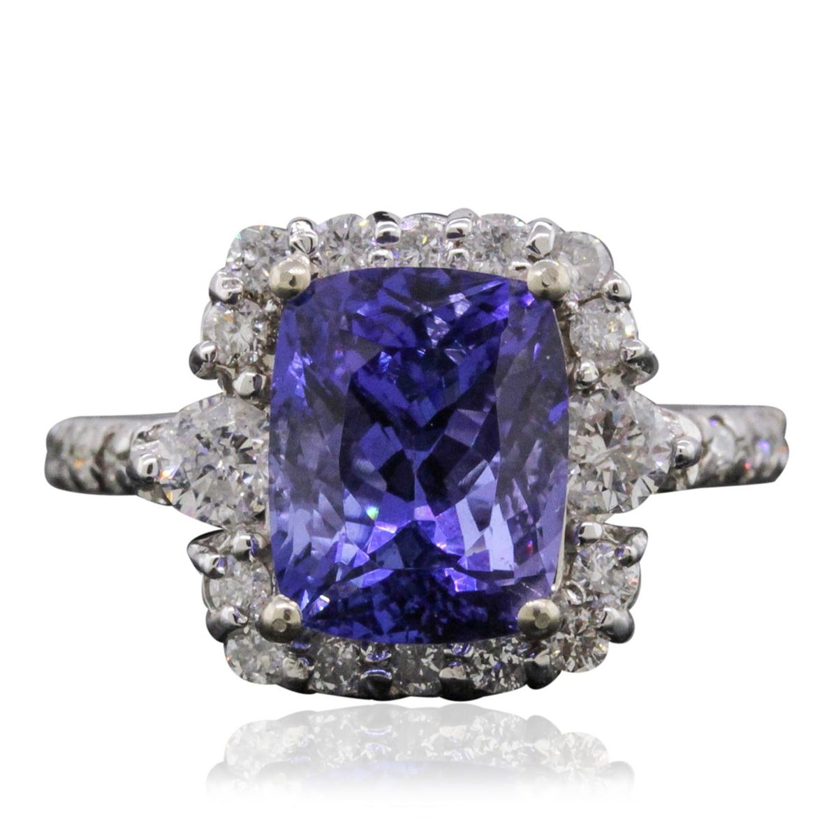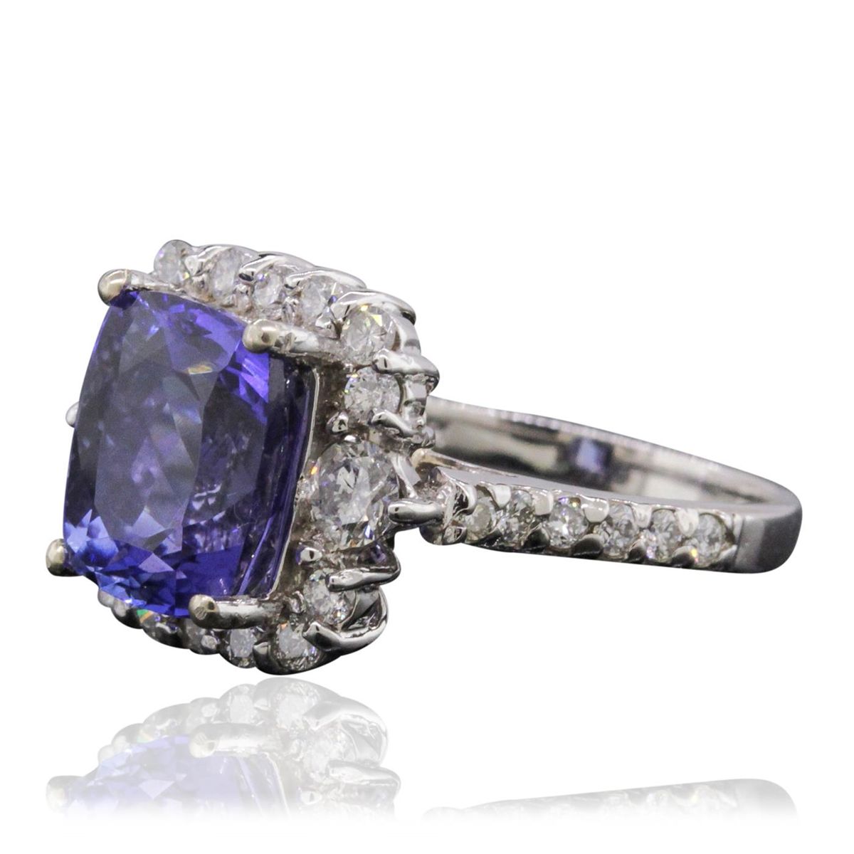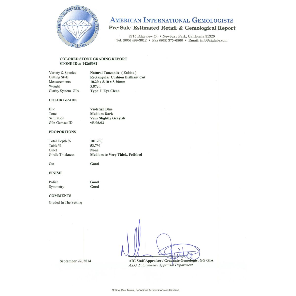 One electronically tested 14KT white gold ladies cast tanzanite and diamond ring with a bright polish finish. The featured tanzanite is set within a diamond bezel supported by a diamond set shoulders, completed by a two millimeter wide band. Identified with markings of "K14". Condition is new, good workmanship. Containing: One prong set rectangular cushion brilliant cut natural tanzanite, measuring 10.20 x 8.10 x 8.20mm, 10% bulge factor, approximate weight of 5.87ct., clarity is eye clean, type I, medium dark, very slightly grayish, violetish blue color, (GIA vB 6/3), cut is good. Transmitting light with no distortion, transparent. Colored Stone Grading Report attached. Graded in the setting. Tanzanite is a very rare gemstone that is only found in the country of Tanzania. Originally discovered in 1967. Tiffany & Company, named the stone Tanzanite. It is found in the Usumburu Mountains that border the Umba Valley of northern Tanzania. Tanzanite occurs in gray, brown, violet, blue, reddish-purple, & green. The gem is interesting because of its exceptional pleochroism. Rotated in different directions a tanzanite will exhibit multiple changes of color. Tanzanite has a low tolerance to ultrasonic cleaning, and should not be cleaned using this method. Two prong set round brilliant cut diamonds, measuring 3.60 - 3.50 x 2.13mm (depth est.) approximate total weight of 2 Stones = 0.35ct. Graded in the setting. Clarity: I-1. Color: I Twenty-Six prong set round brilliant cut diamonds, measuring 1.90 - 1.80 x 1.11mm (depth est.) approximate total weight of 26 Stones = 0.70ct. Graded in the setting. Clarity: SI-1 to I-1. Color: G - I. Total Weight of Colored Stones 5.87ct. Total Weight of Diamonds 1.05ct. Total Weight of Ring 5.48 grams. AIG Appraised at $18,440.00.