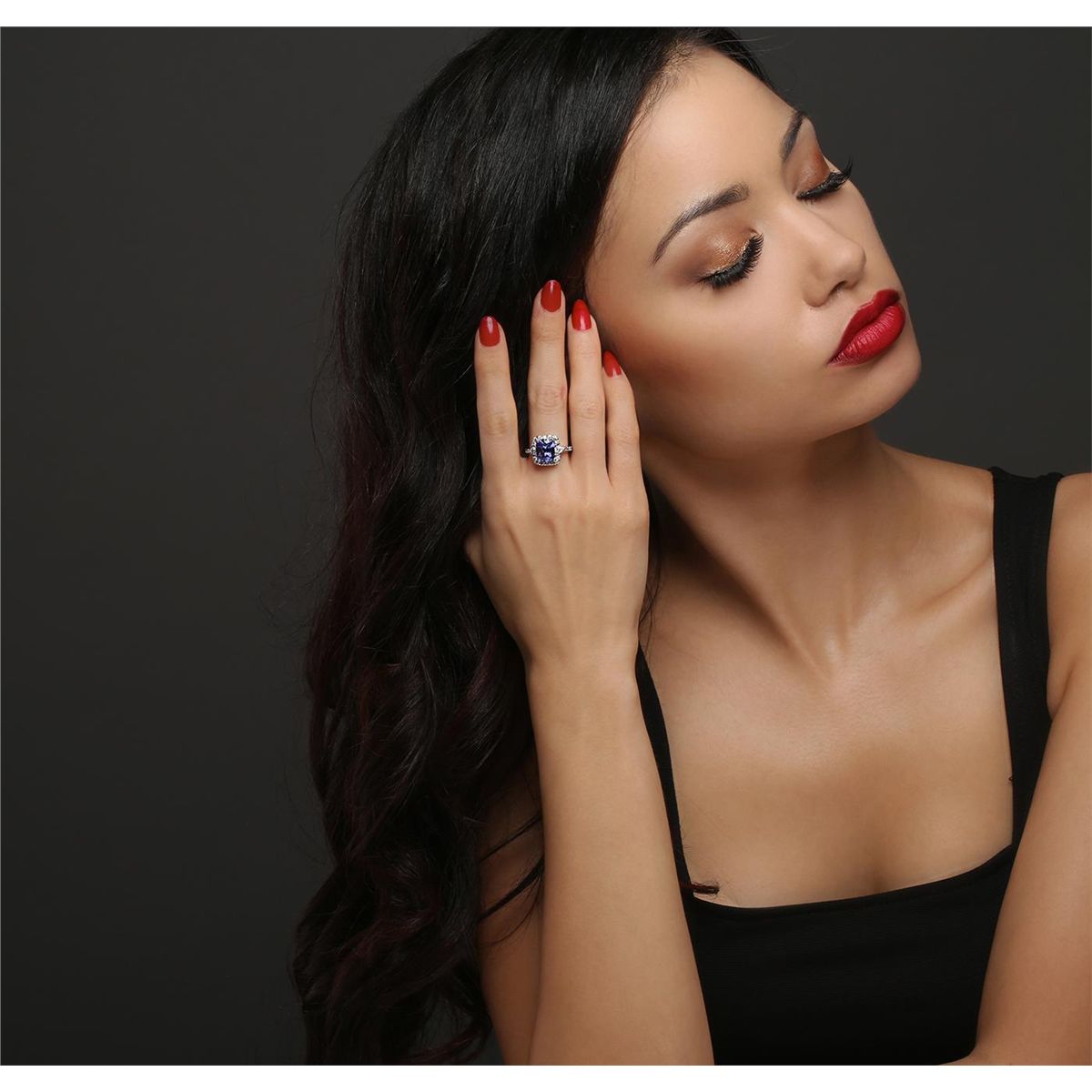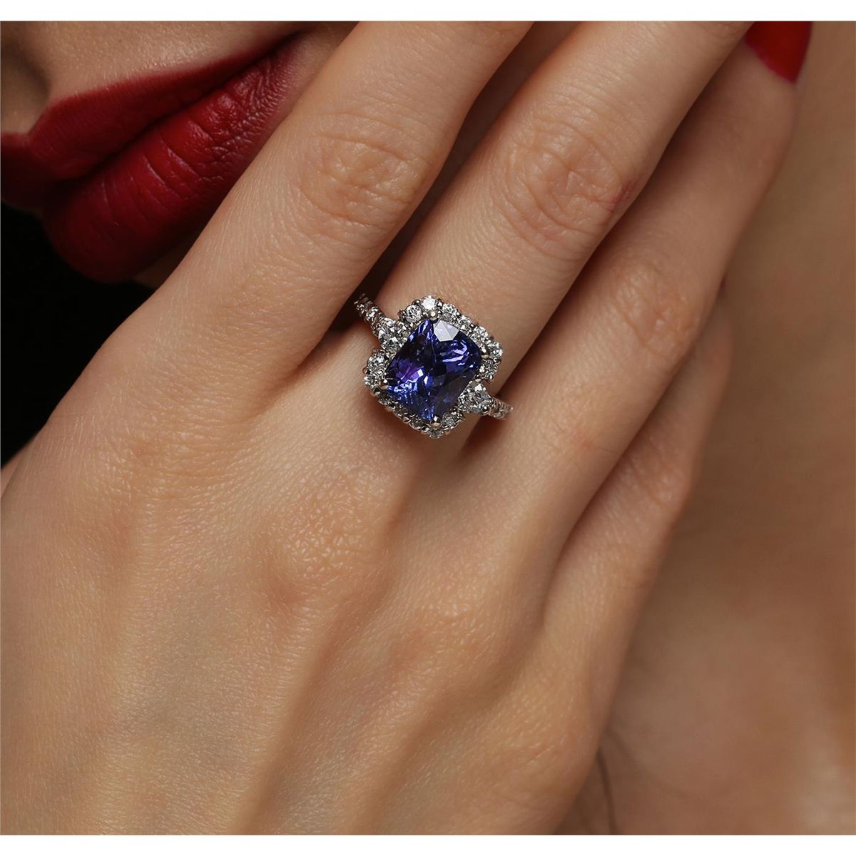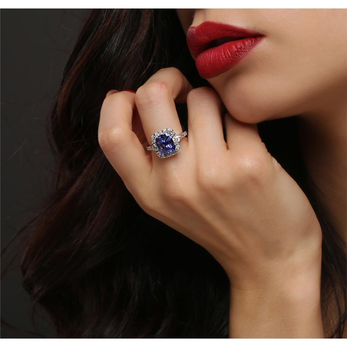 One electronically tested 14KT white gold ladies cast tanzanite and diamond ring with a bright polish finish. The featured tanzanite is set within a diamond bezel supported by a diamond set shoulders, completed by a two millimeter wide band. Identified with markings of "K14". Condition is new, good workmanship. Containing: One prong set rectangular cushion brilliant cut natural tanzanite, measuring 10.20 x 8.10 x 8.20mm, 10% bulge factor, approximate weight of 5.87ct., clarity is eye clean, type I, medium dark, very slightly grayish, violetish blue color, (GIA vB 6/3), cut is good. Transmitting light with no distortion, transparent. Colored Stone Grading Report attached. Graded in the setting. Tanzanite is a very rare gemstone that is only found in the country of Tanzania. Originally discovered in 1967. Tiffany & Company, named the stone Tanzanite. It is found in the Usumburu Mountains that border the Umba Valley of northern Tanzania. Tanzanite occurs in gray, brown, violet, blue, reddish-purple, & green. The gem is interesting because of its exceptional pleochroism. Rotated in different directions a tanzanite will exhibit multiple changes of color. Tanzanite has a low tolerance to ultrasonic cleaning, and should not be cleaned using this method. Two prong set round brilliant cut diamonds, measuring 3.60 - 3.50 x 2.13mm (depth est.) approximate total weight of 2 Stones = 0.35ct. Graded in the setting. Clarity: I-1. Color: I Twenty-Six prong set round brilliant cut diamonds, measuring 1.90 - 1.80 x 1.11mm (depth est.) approximate total weight of 26 Stones = 0.70ct. Graded in the setting. Clarity: SI-1 to I-1. Color: G - I. Total Weight of Colored Stones 5.87ct. Total Weight of Diamonds 1.05ct. Total Weight of Ring 5.48 grams. AIG Appraised at $18,440.00.
