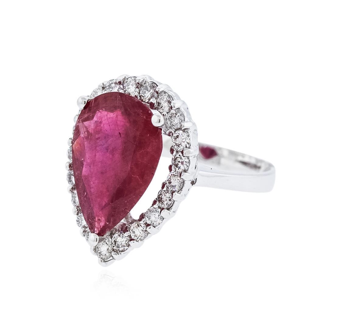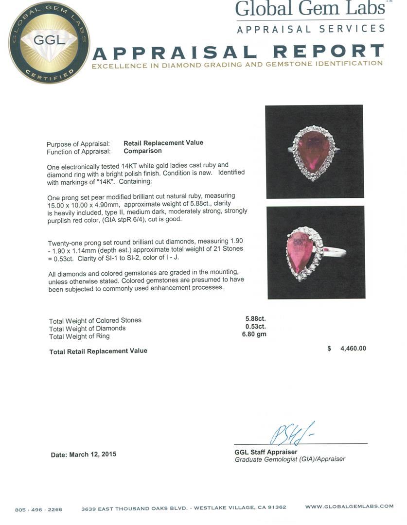 One electronically tested 14KT white gold ladies cast ruby and diamond ring with a bright polish finish. Identified with markings of "14K". Condition is new. Containing: One prong set pear modified brilliant cut natural ruby, measuring 15.00. x 10.00. x 4.90mm, approximate weight of 5.88ct., clarity is heavily included, type II, medium dark, moderately strong, strongly purplish red color, (GIA stpR 6/4), cut is good. Twenty-One prong set round brilliant cut diamonds, measuring 1.90 - 1.90 x 1.14mm (depth est.) approximate total weight of 21 Stones = 0.53ct. Clarity: SI-1 to SI-2. Color: I - J. All diamonds and colored gemstones are graded in the mounting, unless otherwise stated. Colored gemstones are presumed to have been subjected to commonly used enhancement processes. Total Weight of Colored Stones 5.88ct. Total Weight of Diamonds 0.53ct. Total Weight of Ring 6.80 grams. GGL Appraised at $4,460.00.