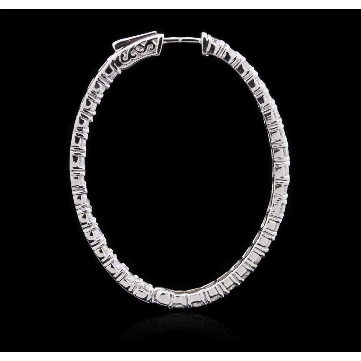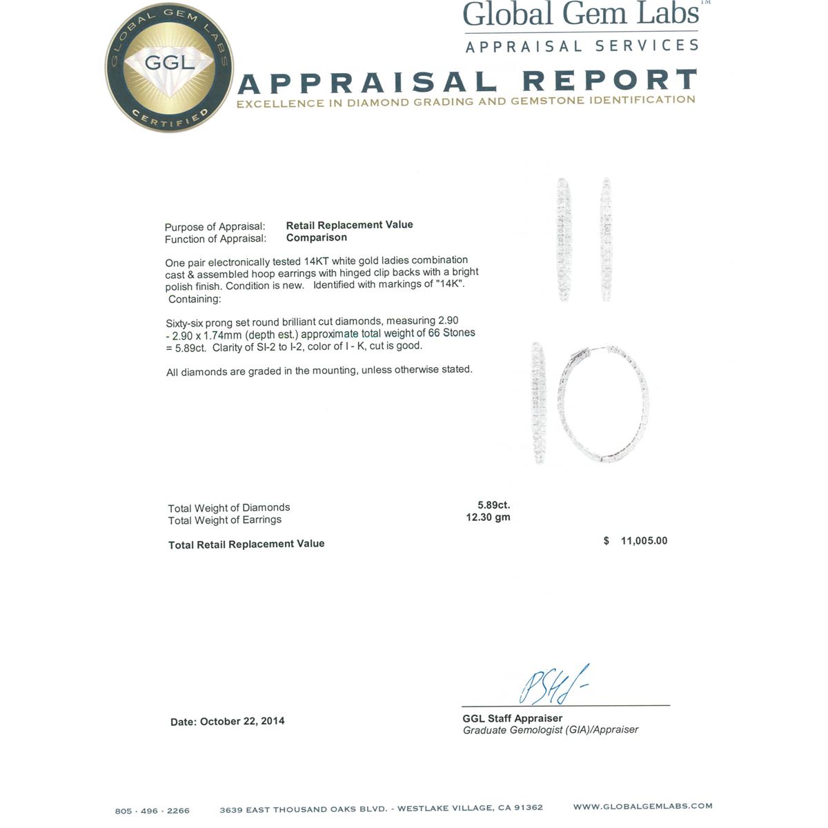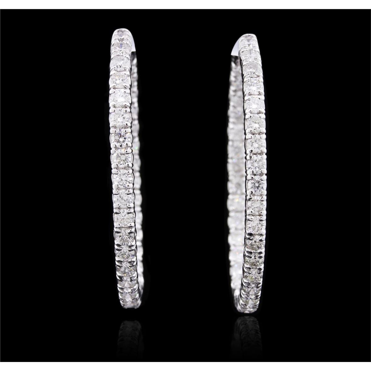 One pair electronically tested 14KT white gold ladies combination cast & assembled hoop earrings with hinged clip backs with a bright polish finish. Identified with markings of "14K". Condition is new. Containing: Sixty-Six prong set round brilliant cut diamonds, measuring 2.90 - 2.90 x 1.74mm (depth est.) approximate total  weight of 66 Stones = 5.89ct. Clarity: SI-2 to I-2. Color: I - K, Cut is Good. All diamonds are graded in the mounting, unless otherwise stated. Total Weight of Diamonds 5.89ct. Total Weight of Earrings 12.30 grams. GGL Appraised at $11,005.00.