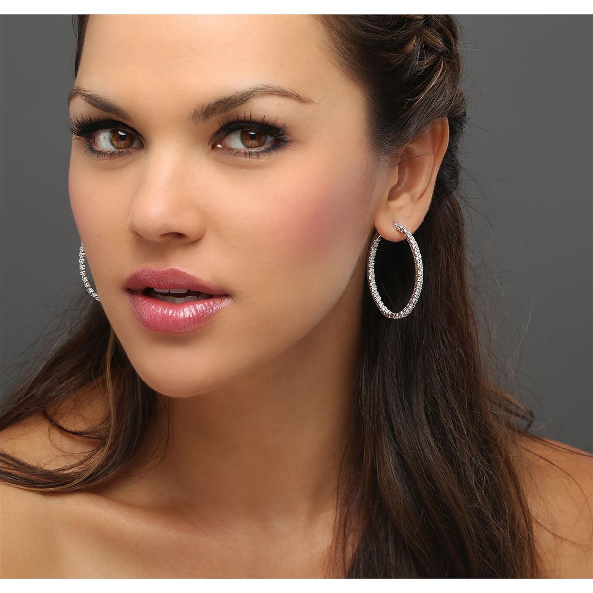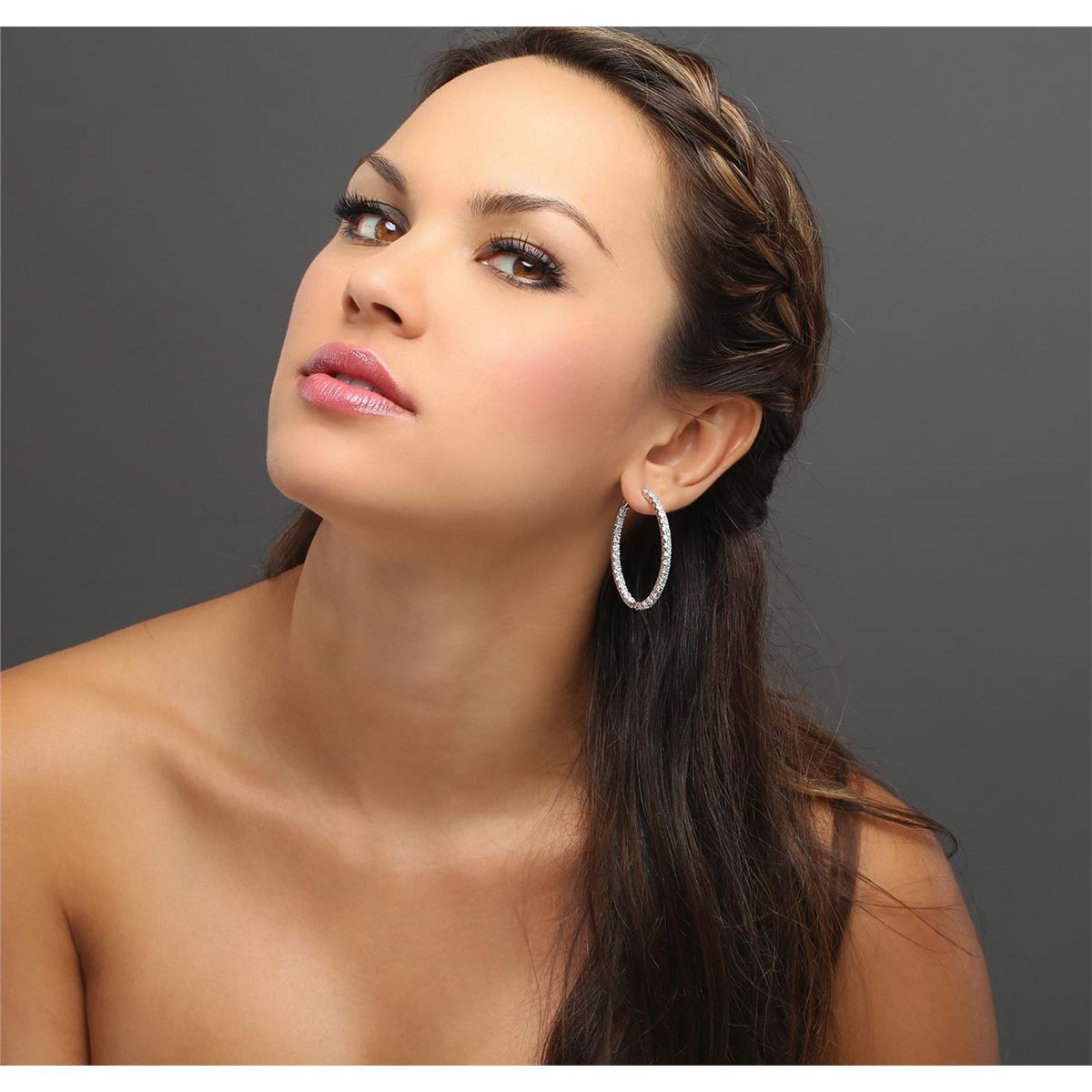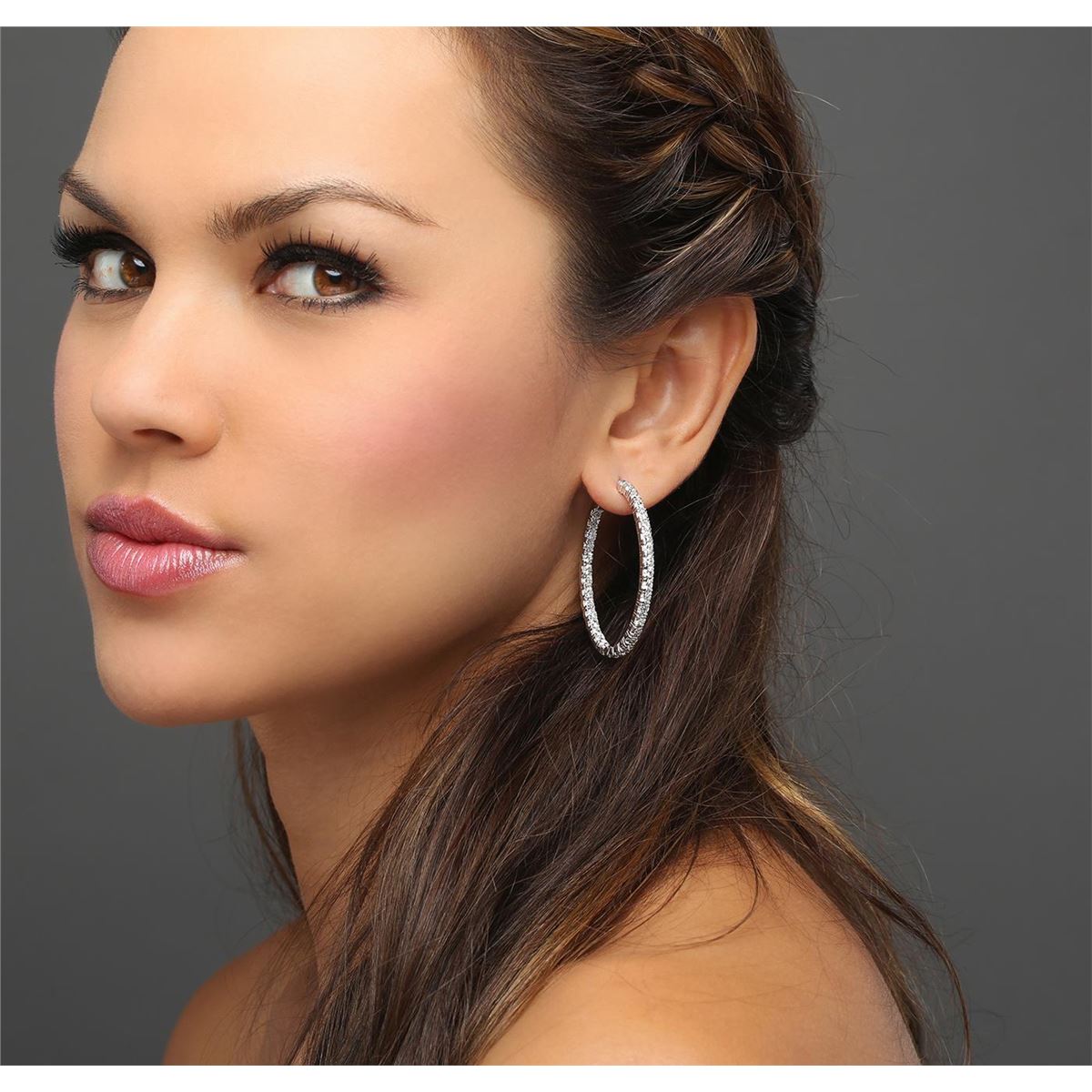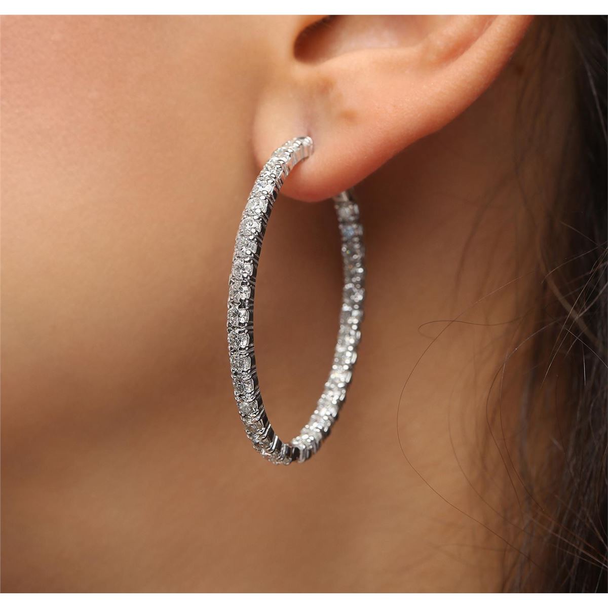 One pair electronically tested 14KT white gold ladies combination cast & assembled hoop earrings with hinged clip backs with a bright polish finish. Identified with markings of "14K". Condition is new. Containing: Sixty-Six prong set round brilliant cut diamonds, measuring 2.90 - 2.90 x 1.74mm (depth est.) approximate total  weight of 66 Stones = 5.89ct. Clarity: SI-2 to I-2. Color: I - K, Cut is Good. All diamonds are graded in the mounting, unless otherwise stated. Total Weight of Diamonds 5.89ct. Total Weight of Earrings 12.30 grams. GGL Appraised at $11,005.00.