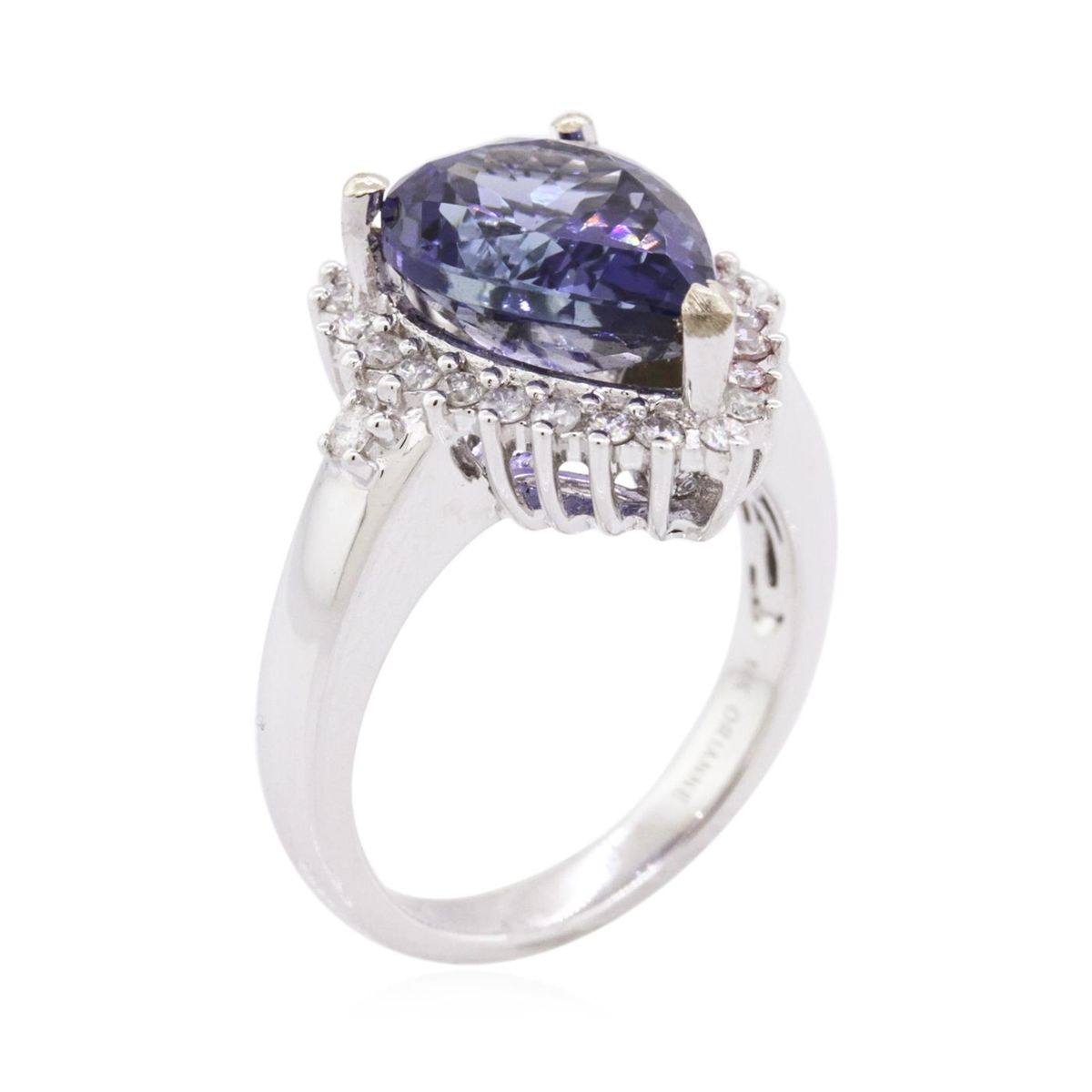 One electronically tested 14KT white gold ladies cast tanzanite and diamond ring with a bright polish finish. The featured tanzanite is set within a diamond bezel, completed by a two and one-half millimeter wide band. Trademark is Orianne. Identified with markings of "14K". Condition is new, good workmanship. Containing: One prong set pear mixed cut natural tanzanite, measuring 13.20 x 9.50 x 6.50mm, 8% bulge factor, approximate weight of 5.90ct., clarity is eye clean, type I, medium dark, very slightly grayish, bluish violet color, (GIA bV 6/3), cut is good. Transmitting light with no distortion, transparent. Colored Stone Grading Report attached. Graded in the setting. Tanzanite is a very rare gemstone that is only found in the country of Tanzania. Originally discovered in 1967. Tiffany & Company, named the stone Tanzanite. It is found in the Usumburu Mountains that border the Umba Valley of northern Tanzania. Tanzanite occurs in gray, brown, violet, blue, reddish-purple, & green. The gem is interesting because of its exceptional pleochroism. Rotated in different directions a tanzanite will exhibit multiple changes of color. Tanzanite has a low tolerance to ultrasonic cleaning, and should not be cleaned using this method. Twenty-Six prong set round brilliant cut diamonds, measuring 1.70 - 1.60 x 0.99mm (depth est.) approximate total weight of 26 Stones = 0.44ct. Faint pink secondary color throughout. Graded in the setting. Clarity: SI-2 to I-2. Color: G - I. Total Weight of Colored Stones 5.90ct. Total Weight of Diamonds 0.44ct. Total Weight of Ring 6.67 grams. AIG Appraised at $16,735.00.