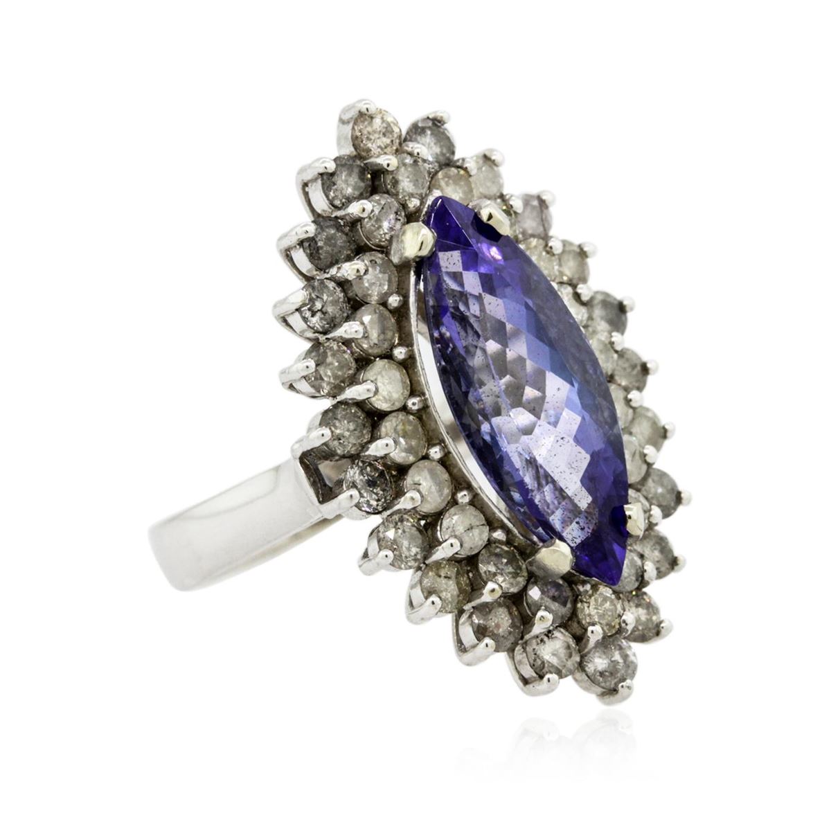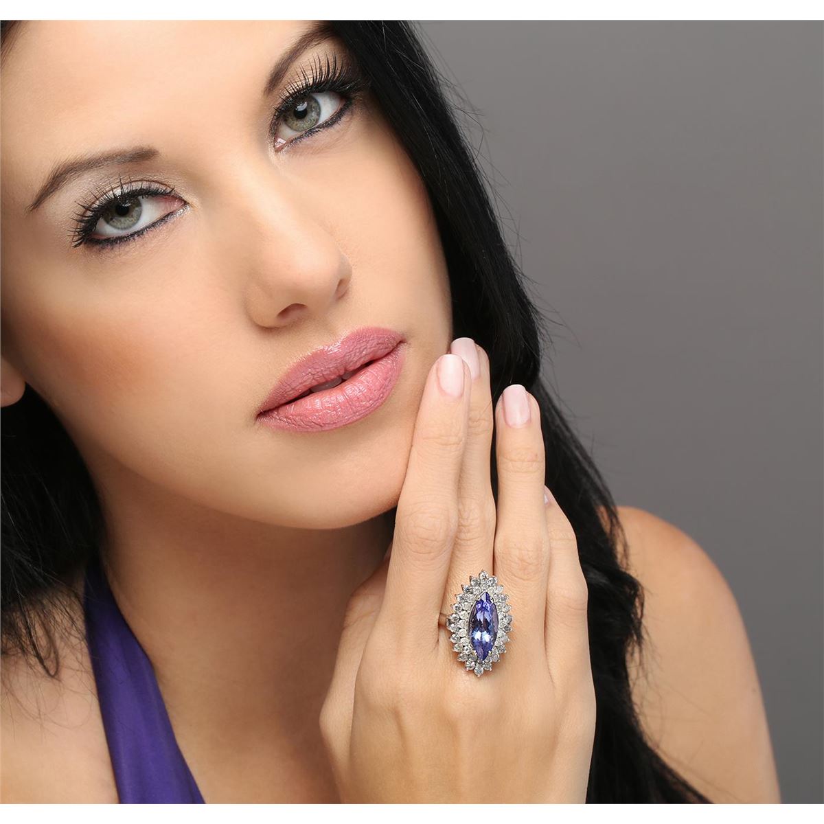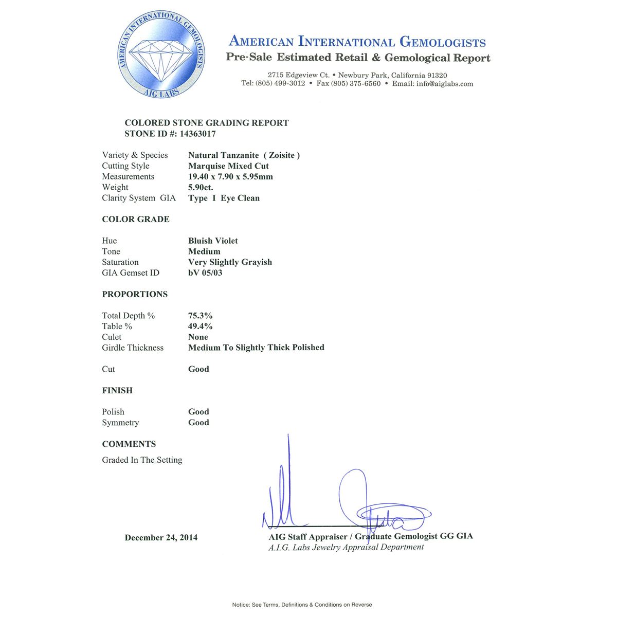 One electronically tested 14KT white gold ladies cast tanzanite and diamond ring with a bright polish finish. The featured tanzanite is set within a tiered diamond bezel, completed by a three and one-half millimeter wide band. Identified with markings of "K14". Condition is good. Containing: One prong set marquise mixed cut natural tanzanite, measuring 19.40 x 7.90 x 5.95mm, approximate weight of 5.90ct., clarity is eye clean, type I, medium, very slightly grayish, bluish violet color, (GIA bV 5/3), cut is good. Transmitting light with no distortion, transparent. Colored Stone Grading Report attached. Graded in the setting. Tanzanite is a very rare gemstone that is only found in the country of Tanzania. Originally discovered in 1967. Tiffany & Company, named the stone Tanzanite. It is found in the Usumburu Mountains that border the Umba Valley of northern Tanzania. Tanzanite occurs in gray, brown, violet, blue, reddish-purple, & green. The gem is interesting because of its exceptional pleochroism. Rotated in different directions a tanzanite will exhibit multiple changes of color. Tanzanite has a low tolerance to ultrasonic cleaning, and should not be cleaned using this method. Forty-Two prong set round brilliant cut diamonds, measuring 2.70 - 2.50 x 1.56mm (depth est.) approximate total weight of 42 Stones = 2.80ct. Graded in the setting. Clarity: I-1 to I-3. Color: I - K. Total Weight of Colored Stones 5.90ct. Total Weight of Diamonds 2.80ct. Total Weight of Ring 10.64 grams. AIG Appraised at $18,180.00.