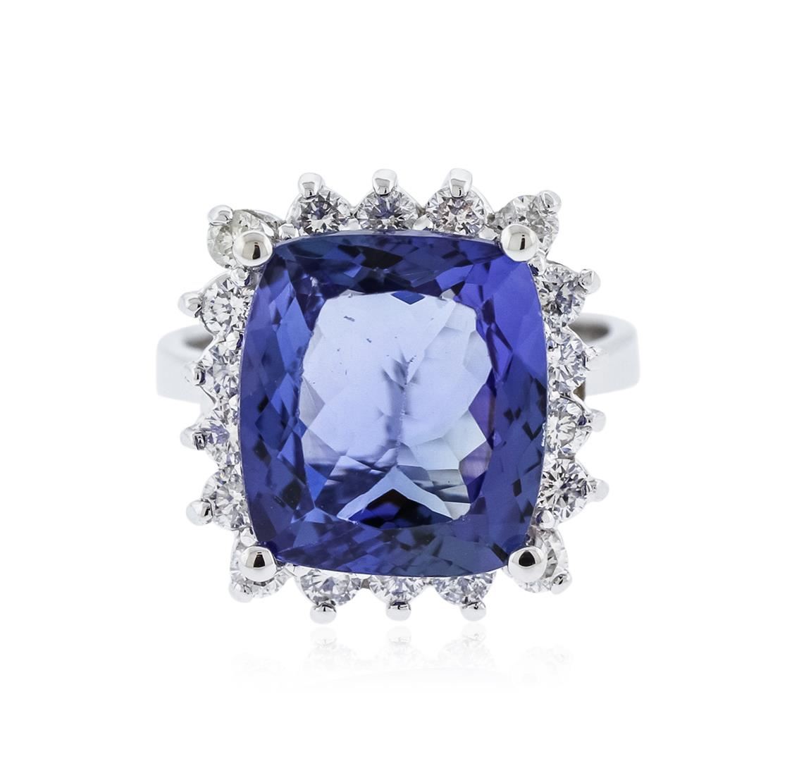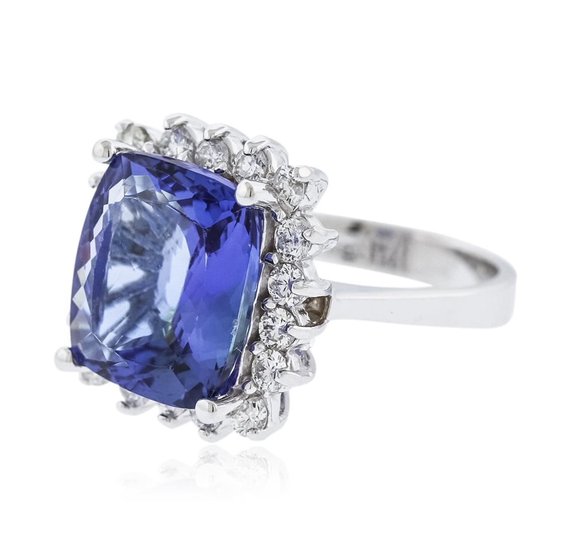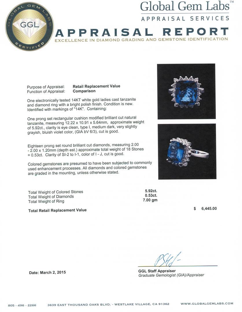 One electronically tested 14KT white gold ladies cast tanzanite and diamond ring with a bright polish finish. Identified with markings of "14K". Condition is new. Containing: One prong set rectangular cushion modified brilliant cut natural tanzanite, measuring 12.22 x 10.91 x 5.64mm, approximate weight of 5.92ct., clarity is eye clean, type I, medium dark, very slightly grayish, bluish violet color, (GIA bV 6/3), cut is good. Eighteen prong set round brilliant cut diamonds, measuring 2.00 - 2.00 x 1.20mm (depth est.) approximate total weight of 18 Stones = 0.53ct. Clarity: SI-2 to I-1. Color: I - J, Cut is Good. Colored gemstones are presumed to have been subjected to commonly used enhancement processes. All diamonds and colored gemstones are graded in the mounting, unless otherwise stated. Total Weight of Colored Stones 5.92ct. Total Weight of Diamonds 0.53ct. Total Weight of Ring 7.00 grams. GGL Appraised at $6,445.00.