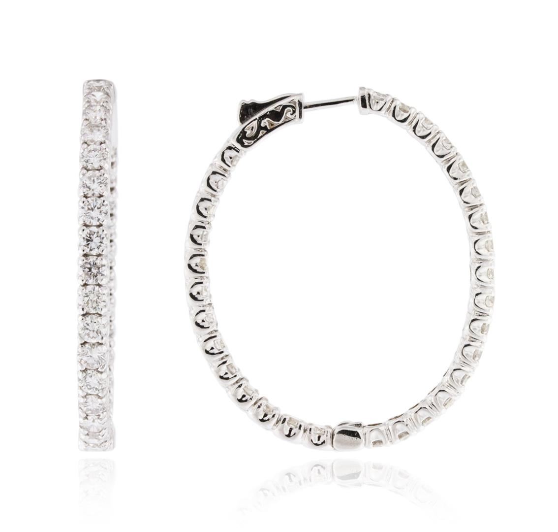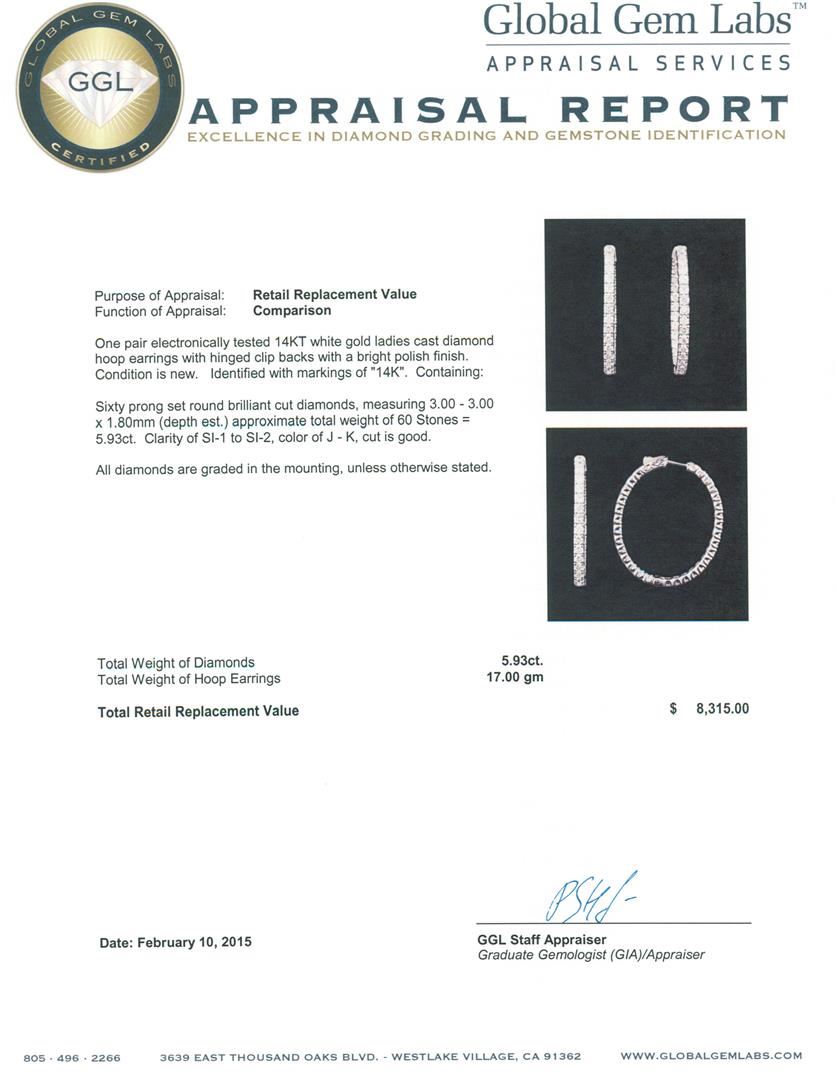 One pair electronically tested 14KT white gold ladies cast diamond hoop earrings with hinged clip backs with a bright polish finish. Identified with markings of "14K". Condition is new. Containing: Sixty prong set round brilliant cut diamonds, measuring 3.00 - 3.00 x 1.80mm (depth est.) approximate total weight of 60 Stones = 5.93ct. Clarity: SI-1 to SI-2. Color: J - K, Cut is Good. All diamonds are graded in the mounting, unless otherwise stated. Total Weight of Diamonds 5.93ct. Total Weight of Hoop Earrings 17.00 grams. GGL Appraised at $8,315.00.