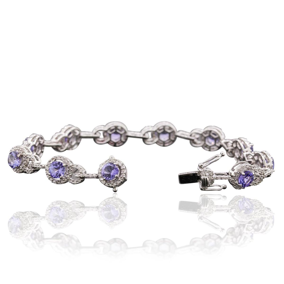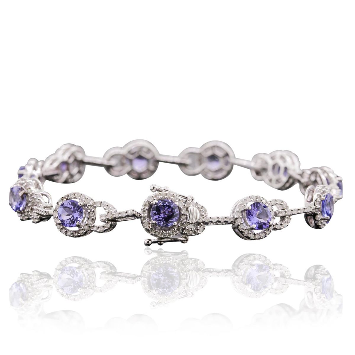 One electronically tested 14KT white gold Ladies combination cast & assembled bracelet with a hidden box clasp with a bright polish finish. Condition is new. Measurements: 7" in length. Identified with markings of "14K". Containing: Eleven prong set round modified brilliant cut natural tanzanites, measuring 5.00 - 5.00 x 3.25 mm, approximate. Total Weight of 5.94ct., clarity is eye clean, type I, medium light, very slightly grayish, violet color, (GIA V 4/3), cut is very good. Colored gemstones are presumed to have been subjected to commonly used color/clarity enhancement processes. Three Hundred Nineteen prong set round brilliant cut diamonds, measuring 1.10 - 1.10 x 0.66mm (depth est.) approximate. Total Weight of 319 Stones = 1.53ct. Clarity: I-1 to I-2. Color: I - J, Cut is Good. Total Weight of Colored Stones 5.94ct. Total Weight of Diamonds 1.53ct. Total Weight of Bracelet 12.80 Grams. GGL Appraised at $17,380.00.