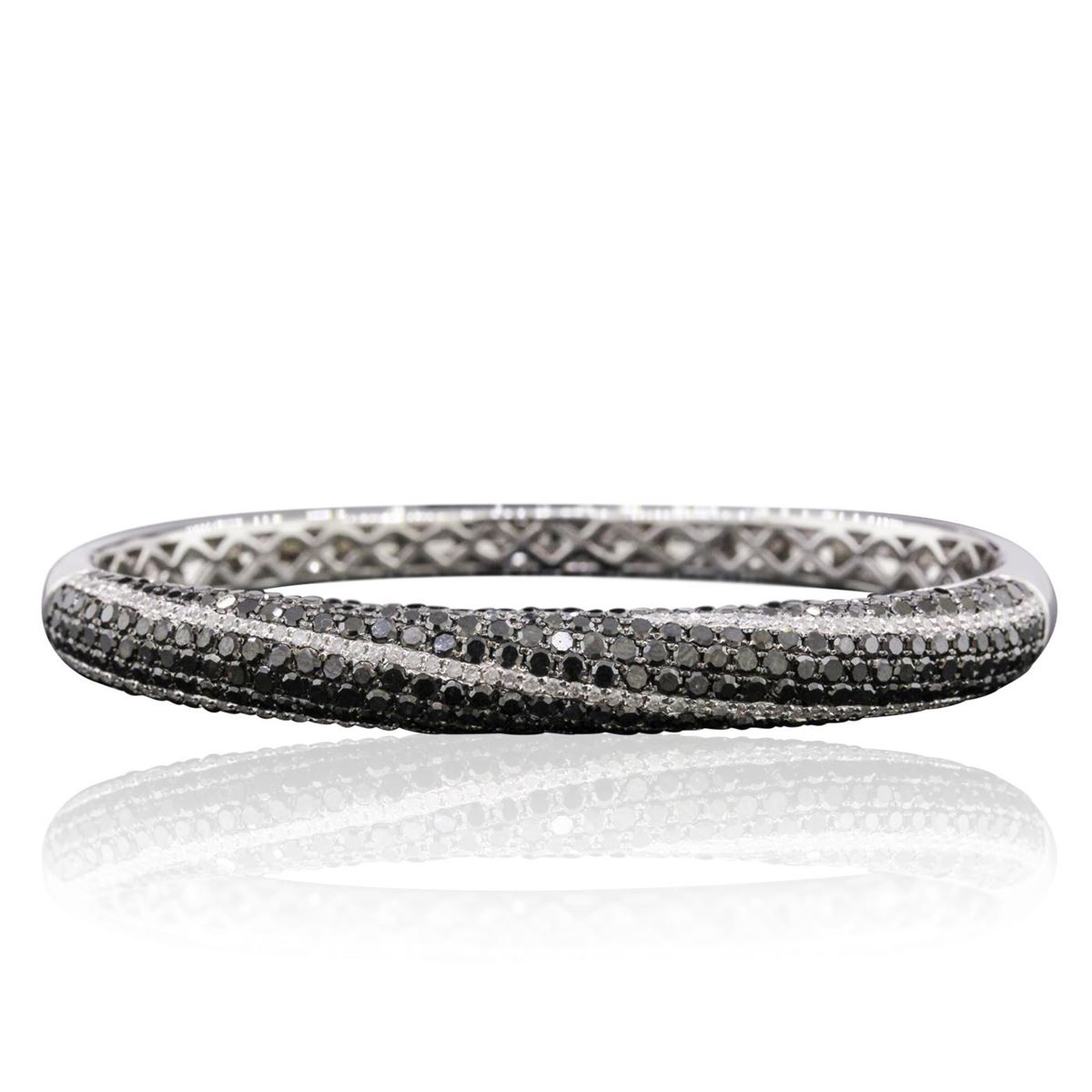 One electronically tested 14KT white gold ladies combination cast & assembled diamond bangle bracelet with a hidden box clasp with a bright polish finish. Measurements: 2.50" x 2.20". Identified with markings of "14K 585". Condition is new. Containing: Three Hundred Twelve prong set round brilliant cut diamonds, measuring 1.70 - 1.70 x 1.02mm (depth est.) approximate total weight of 312 Stones = 5.59ct. color of Fancy Black, cut is good. One Hundred Five prong set round brilliant cut diamonds, measuring 1.00 - 1.00 x 0.60mm (depth est.) approximate total weight of 105 Stones = 0.38ct. . Clarity: I-1 to I-2. Color: I - J, Cut is Good. All diamonds are graded in the mounting, unless otherwise stated.. Total Weight of Diamonds 5.96ct.. Total Weight of Bangle Bracelet 21.00 grams. GGL Appraised at $16,920.00.