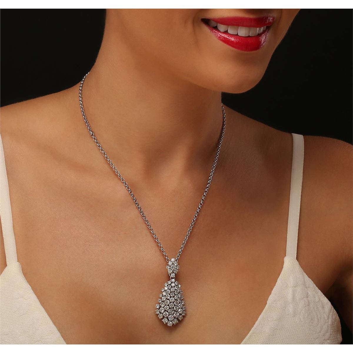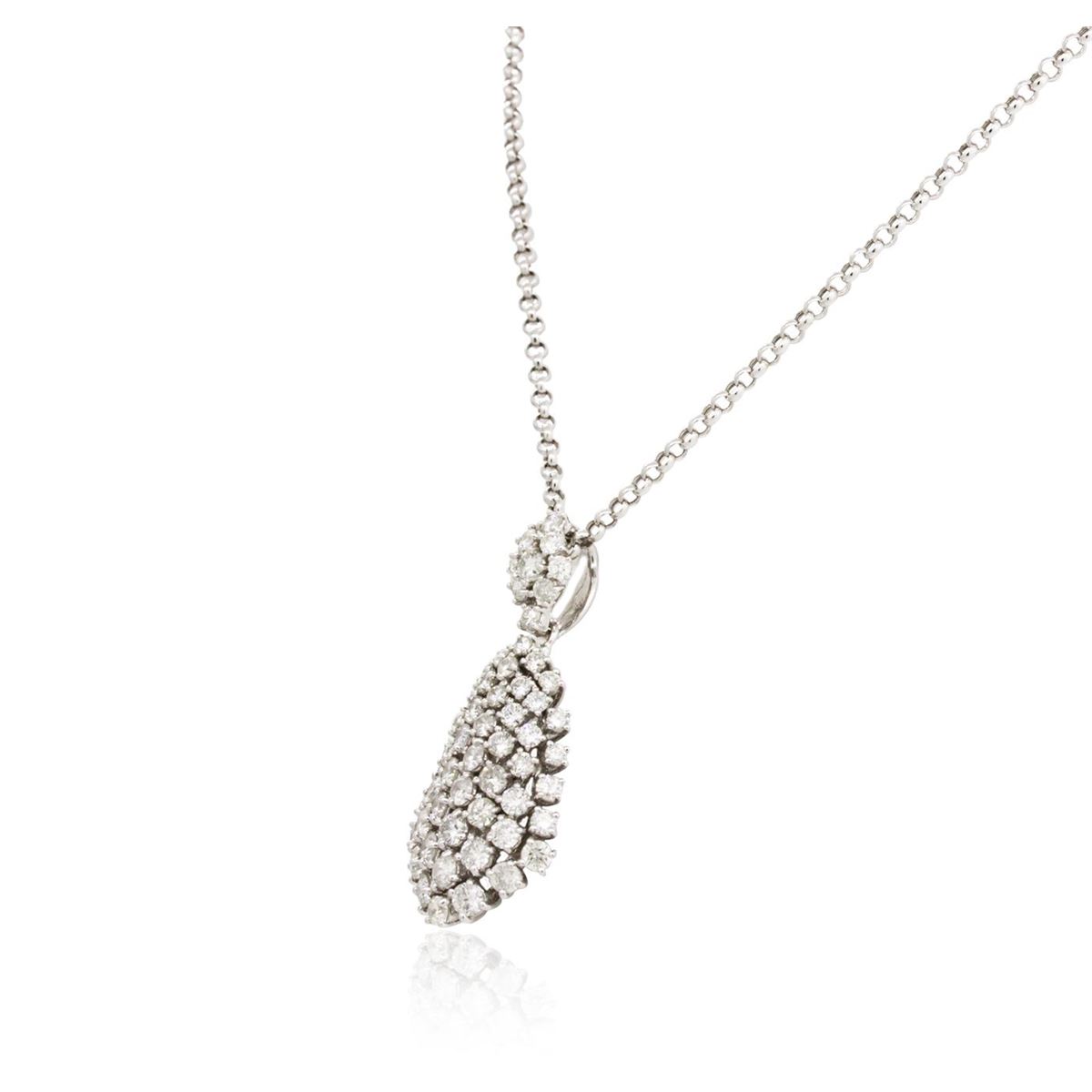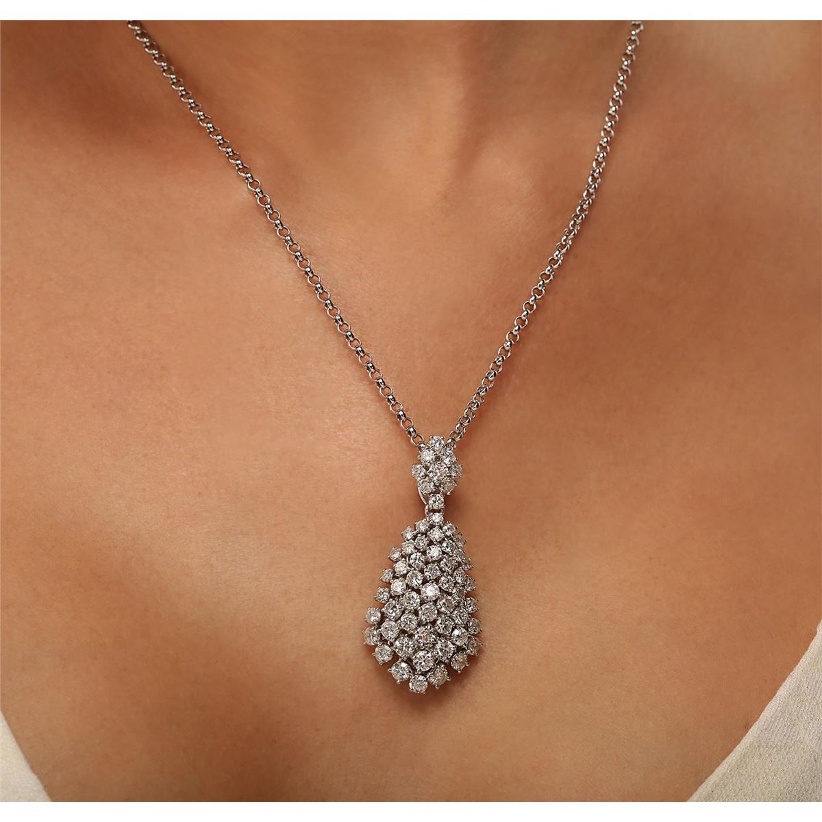 One electronically tested 14KT white gold ladies cast & assembled diamond pendant with chain. The pendant is supported by an eighteen inch length 14KT white gold designer style link chain, terminating in a lobster claw clasp. Bright polish finish. Identified with markings of "585". Condition is new, good workmanship. Containing: Eleven prong set round brilliant cut diamonds, measuring 3.70 - 3.50 x 2.16mm (depth est.) approximate total weight of 11 Stones = 1.97ct. Graded in the setting. Clarity: SI-1 to I-1 . Color: G - I Fourteen prong set round brilliant cut diamonds, measuring 3.40 - 3.00. x 1.92mm (depth est.) approximate total weight of 14 Stones = 1.77ct. Graded in the setting. Clarity: SI-1 to I-1 . Color: G - I Thirty-Three prong set round brilliant cut diamonds, measuring 2.80 - 2.40 x 1.56mm (depth est.) approximate total weight of 33 Stones = 2.22ct. Graded in the setting. Clarity: SI-1 to I-1 . Color: G - I. Total Weight of Diamonds 5.96ct. Total Weight of Pendant With Chain 14.97 grams. AIG Appraised at $20,030.00.