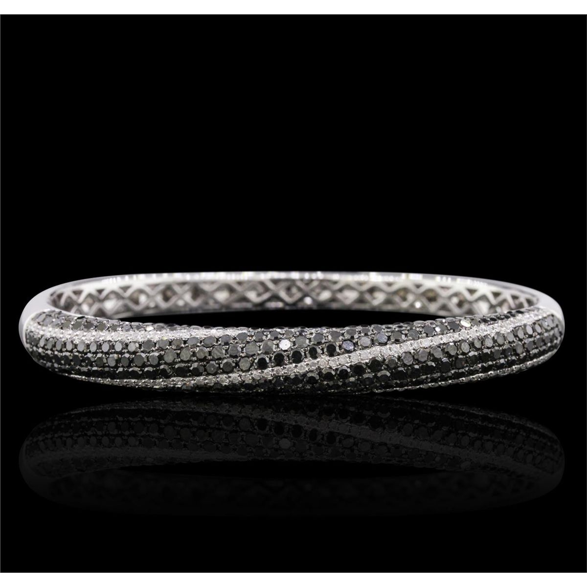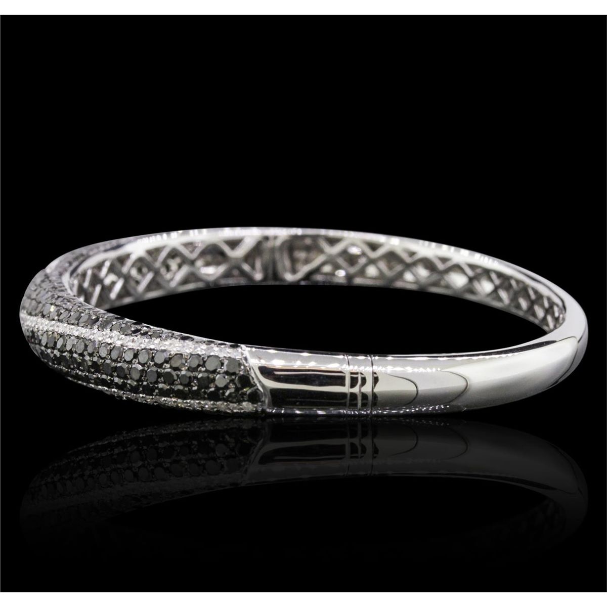 One electronically tested 14KT white gold ladies combination cast & assembled diamond bangle bracelet with a hidden box clasp with a bright polish finish. Measurements: 2.50" x 2.20". Identified with markings of "14K 585". Condition is new. Containing: Three Hundred Twelve prong set round brilliant cut diamonds, measuring 1.70 - 1.70 x 1.02mm (depth est.) approximate total weight of 312 Stones = 5.59ct. color of Fancy Black, cut is good. One Hundred Five prong set round brilliant cut diamonds, measuring 1.00 - 1.00 x 0.60mm (depth est.) approximate total weight of 105 Stones = 0.38ct. . Clarity: I-1 to I-2. Color: I - J, Cut is Good. All diamonds are graded in the mounting, unless otherwise stated.. Total Weight of Diamonds 5.96ct.. Total Weight of Bangle Bracelet 21.00 grams. GGL Appraised at $16,920.00.