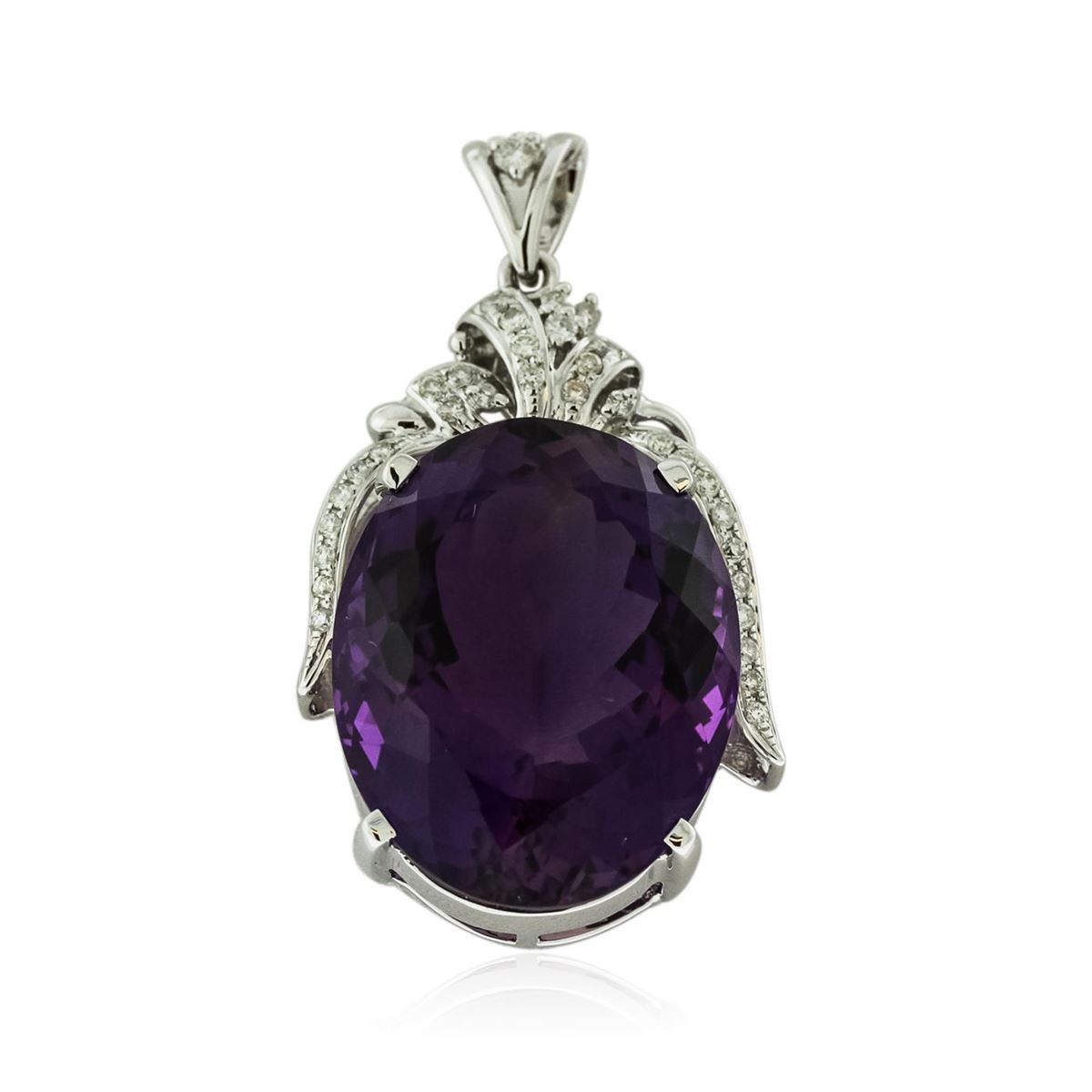 One electronically tested 14KT white gold ladies cast amethyst and diamond pendant with a bright polish finish. Identified with markings of "14K". Condition is new. Containing: One prong set oval modified brilliant cut natural amethyst, measuring 27.00. x 22.00. x 15.30mm, approximate weight of 50.77ct., clarity is eye clean, type II, medium, very slightly grayish, purple color, (GIA P 5/3), cut is good. One prong set round brilliant cut diamond, measuring 2.50 - 2.50 x 1.50mm (depth est.) approximate weight of 0.06ct. Clarity: SI-1. Color: I, Cut is Good. Thirty-Two prong set round brilliant cut diamonds, measuring 1.50 - 1.50 x 0.90mm (depth est.) approximate total weight of 32 Stones = 0.39ct. Clarity: SI-2 to I-1. Color: H - I, Cut is Good. Colored gemstones are presumed to have been subjected to commonly used enhancement processes. All diamonds and colored gemstones are graded in the mounting, unless otherwise stated. Total Weight of Colored Stones 50.77ct. Total Weight of Diamonds 0.45ct. Total Weight of Pendant 19.30 grams. GGL Appraised at $3,325.00.