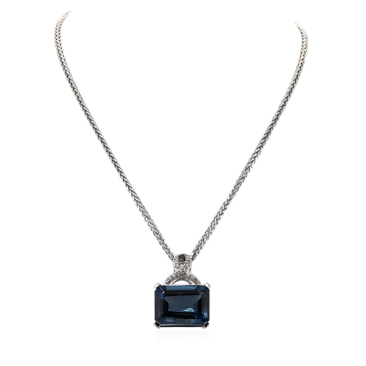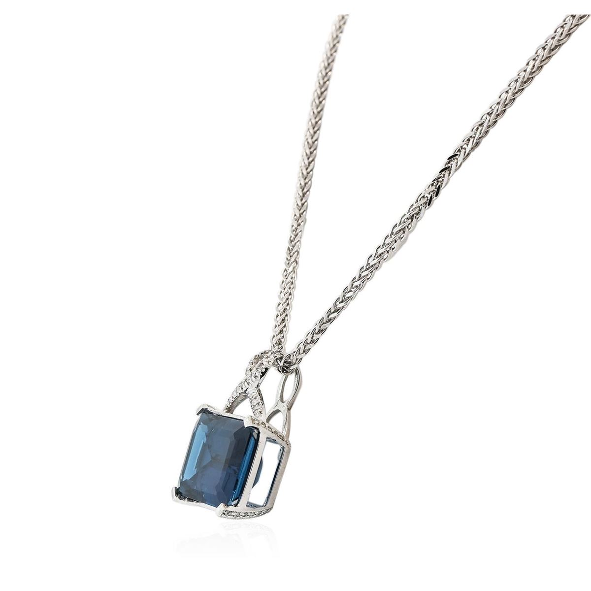 One electronically tested 14KT white gold ladies cast & assembled blue topaz and diamond pendant with chain. The pendant features a blue topaz set within a diamond accented basket, completed by an interwoven diamond set bail. The pendant is supported by an eighteen inch length 14KT white gold designer style chain, terminating in a lobster claw clasp. Bright polish finish with milgrain detailing. Identified with markings of "14K". Condition is new, good workmanship. Containing: One prong set rectangular step cut natural blue topaz, measuring 24.50 x 17.40 x 10.65mm, 6% bulge factor, approximate weight of 50.96ct., clarity is eye clean, type I, dark, very slightly grayish, very slightly greenish blue color, (GIA vslgB 7/3), cut is good. Transmitting light with no distortion, transparent. Graded in the setting. A deposit of a thin layer has been applied to the topaz to produce the intense color effect. The process utilizes a very high temperature treatment, diffusion of ions into the topaz, plus in some cases neutron bombardment has been used to create the color center. Diffusion processes causes the added ions to become part of the crystal surface with no distinct boundary. Do not put a gem treated in this manner into an ultrasonic cleaner. Forty-Four prong & bead set round brilliant cut diamonds, measuring 1.60 - 1.50 x 0.93mm (depth est.) approximate total weight of 44 Stones = 0.69ct. Graded in the setting. Clarity: SI-2 to I-2. Color: G - I. Total Weight of Colored Stones 50.96ct. Total Weight of Diamonds 0.69ct. Total Weight of Pendant With Chain 23.76 grams. AIG Appraised at $5,605.00.