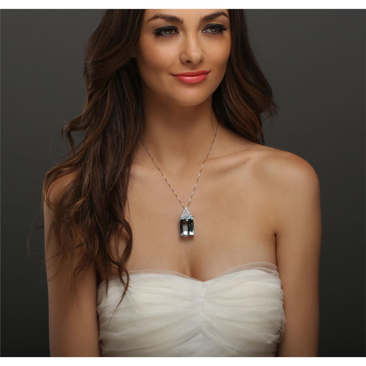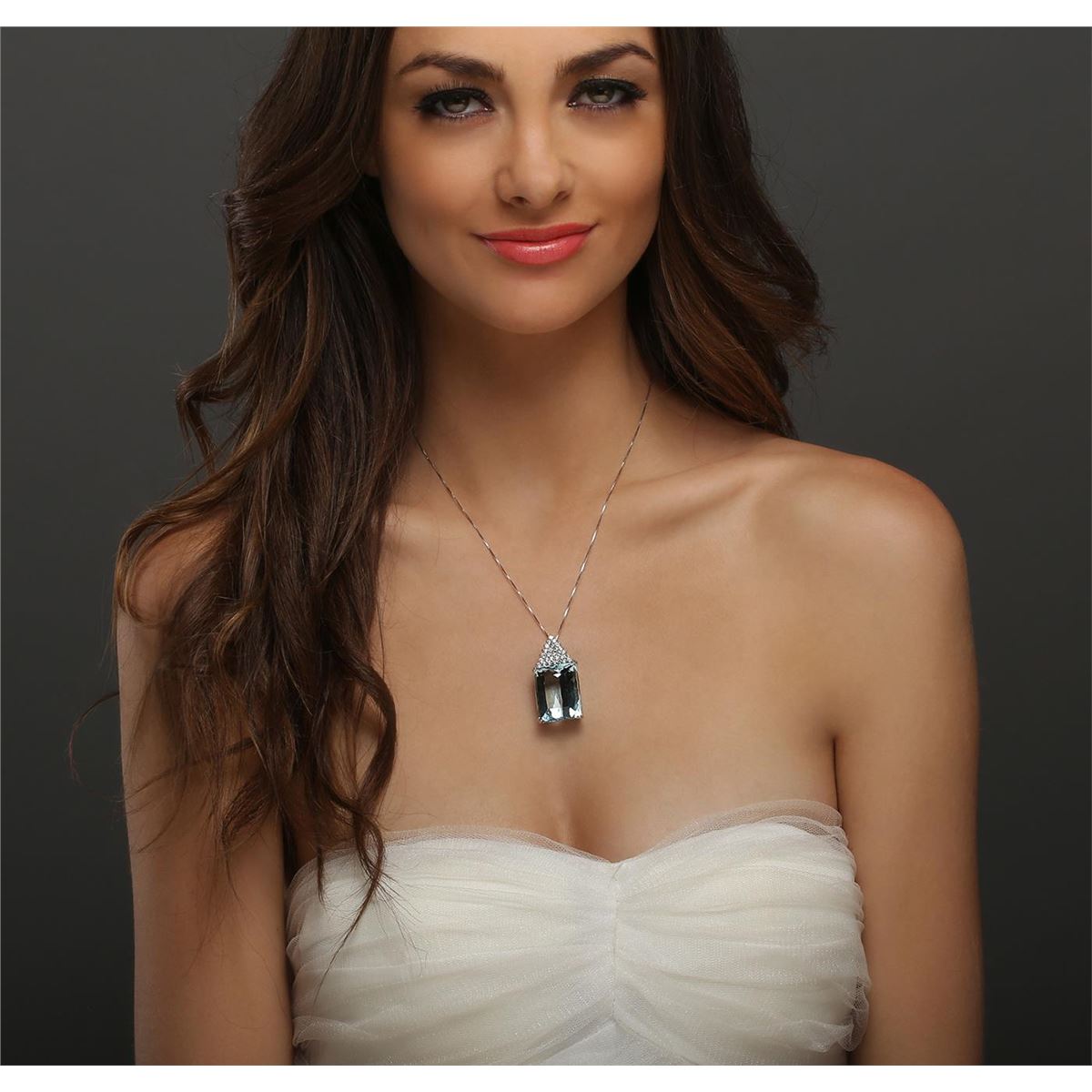 One electronically tested 14KT white gold ladies cast diamond pendant & chain 18.0" long, thin box link with a barrel clasp with a bright polish finish. Identified with markings of "14KT". Condition is new. Containing: One prong set rectangular modified brilliant cut natural aquamarine, measuring 25.13 x 19.68 x 12.67mm, approximate weight of 51.13ct., clarity is eye clean, type I, very light, grayish, blue color, (GIA B 2/1), cut is good. Twenty-Eight prong set round brilliant cut diamonds, measuring 2.00 - 2.00 x 1.20mm (depth est.) approximate total weight of 28 Stones = 0.82ct. . Clarity: SI-2 to I-1. Color: I - J, Cut is Good. Colored gemstones are presumed to have been subjected to commonly used enhancement processes. All diamonds and colored gemstones are graded in the mounting, unless otherwise stated.. Total Weight of Colored Stones 51.13ct.. Total Weight of Diamonds 0.82ct.. Total Weight of Pendant & Chain 16.80 grams. GGL Appraised at $8,670.00.
