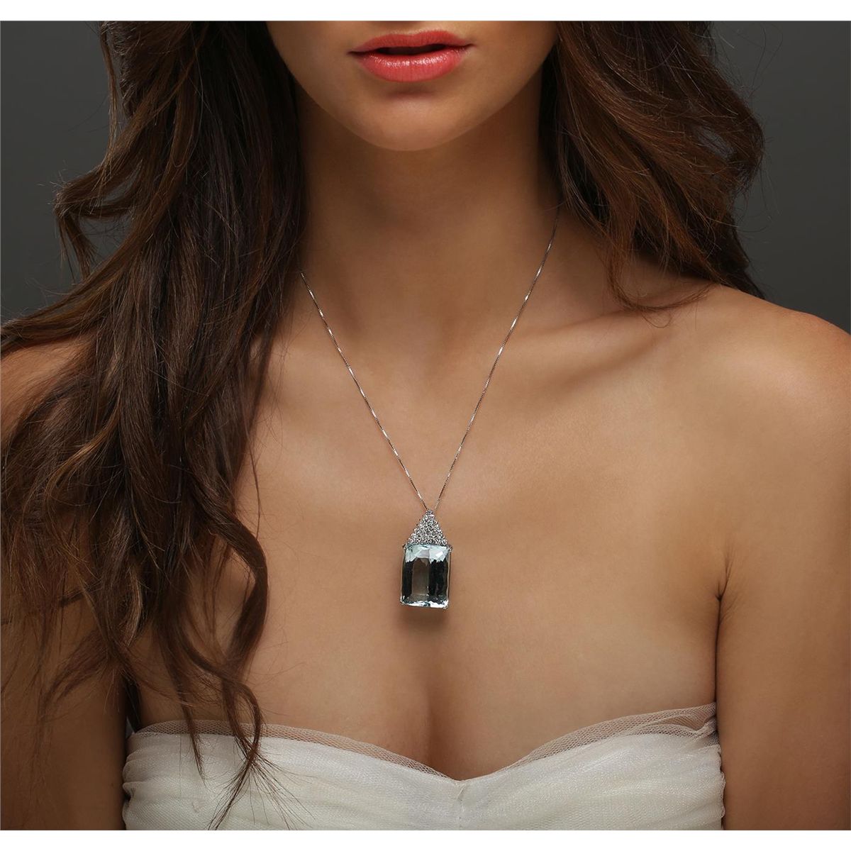 One electronically tested 14KT white gold ladies cast diamond pendant & chain 18.0" long, thin box link with a barrel clasp with a bright polish finish. Identified with markings of "14KT". Condition is new. Containing: One prong set rectangular modified brilliant cut natural aquamarine, measuring 25.13 x 19.68 x 12.67mm, approximate weight of 51.13ct., clarity is eye clean, type I, very light, grayish, blue color, (GIA B 2/1), cut is good. Twenty-Eight prong set round brilliant cut diamonds, measuring 2.00 - 2.00 x 1.20mm (depth est.) approximate total weight of 28 Stones = 0.82ct. . Clarity: SI-2 to I-1. Color: I - J, Cut is Good. Colored gemstones are presumed to have been subjected to commonly used enhancement processes. All diamonds and colored gemstones are graded in the mounting, unless otherwise stated.. Total Weight of Colored Stones 51.13ct.. Total Weight of Diamonds 0.82ct.. Total Weight of Pendant & Chain 16.80 grams. GGL Appraised at $8,670.00.