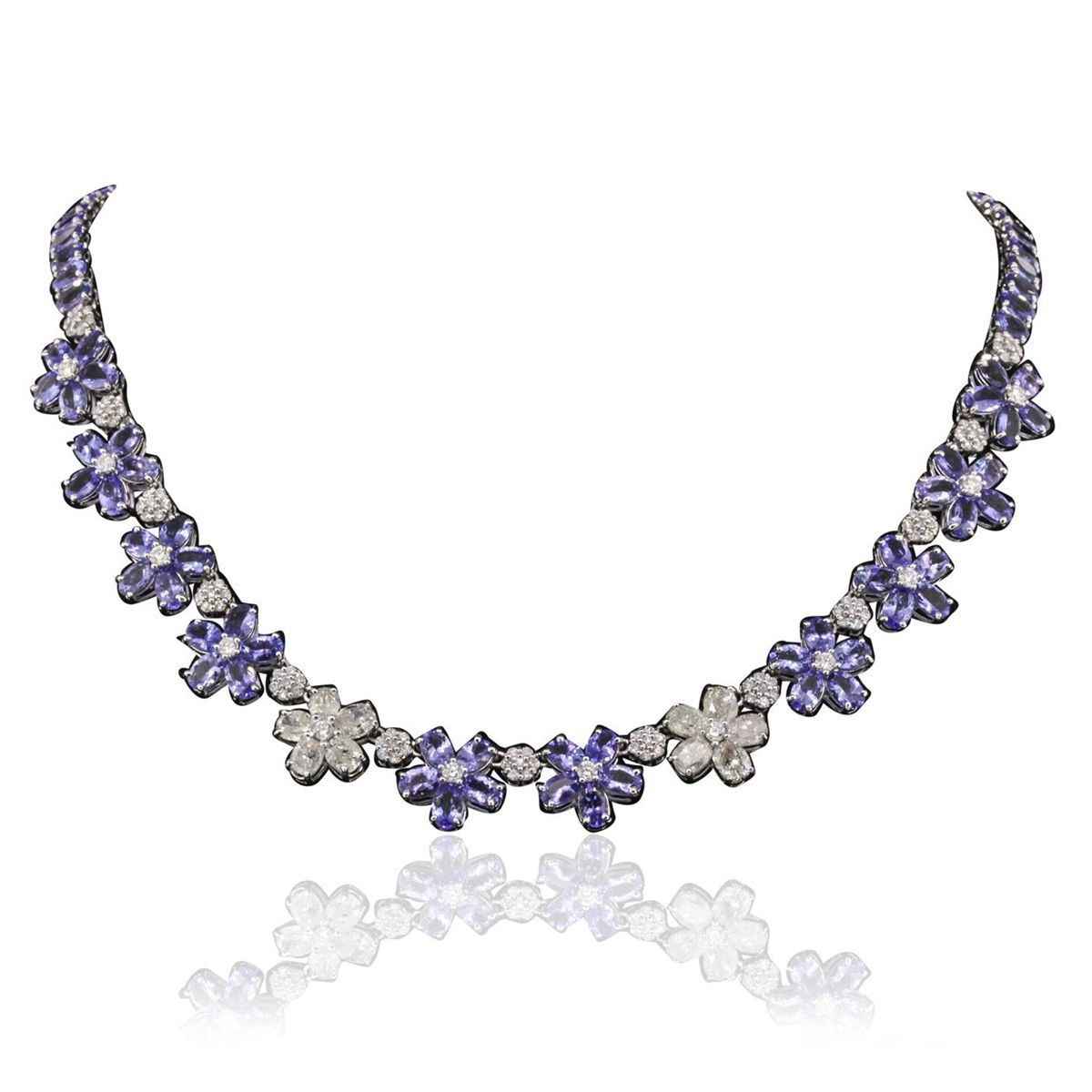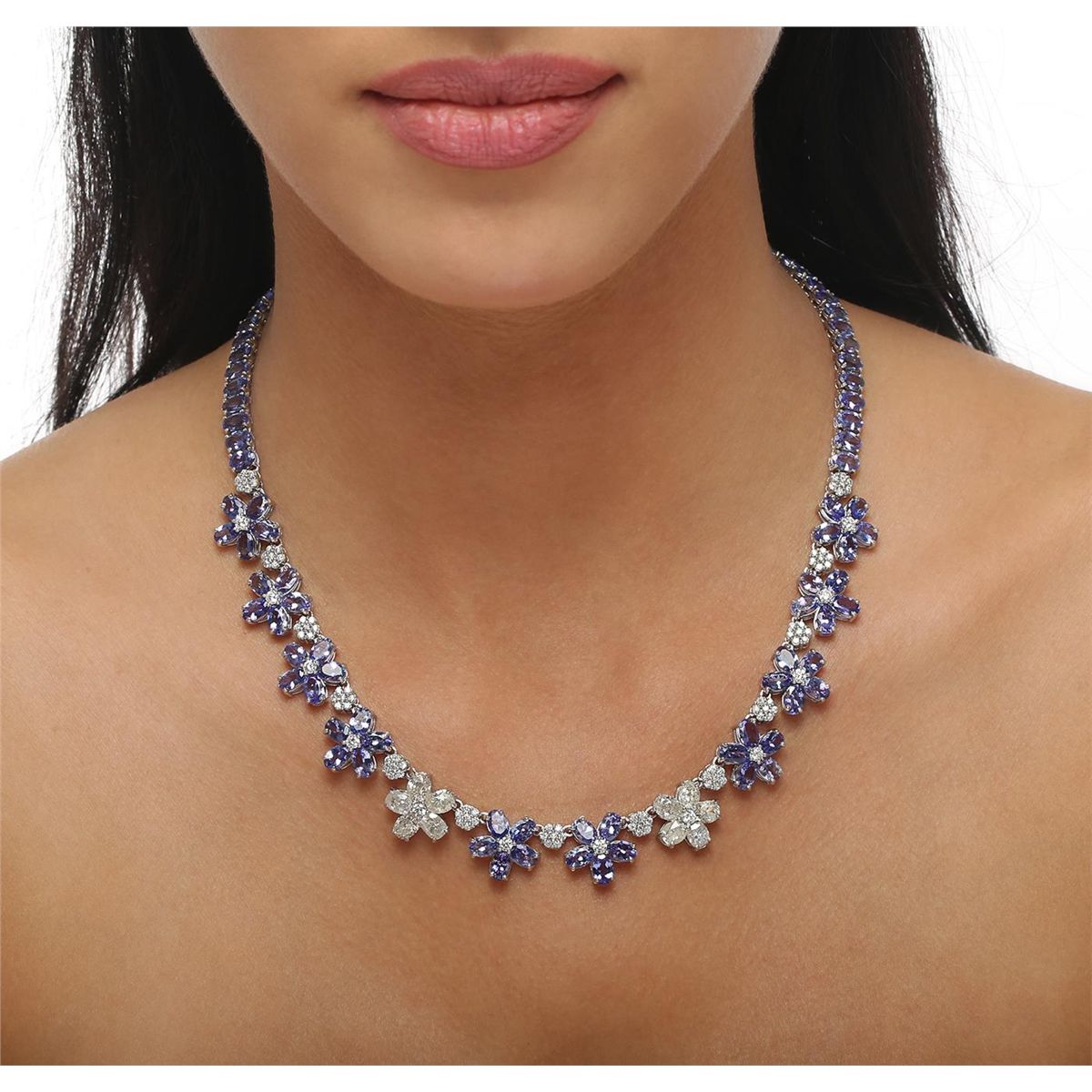 One electronically tested 14KT white gold ladies combination cast & assembled necklace with a bright polish finish. Condition is new. Measurements: 17" in length. Identified with markings of "14K". Containing: One hundred two prong set oval modified brilliant cut natural tanzanites, measuring 5.80 x 4.60 x 2.99mm, approximate. Total Weight of 55.08ct., clarity is eye clean, type I, medium light, very slightly grayish, violet color, (GIA V 4/3), cut is good. Ten prong set oval shaped cut diamonds, measuring 5.80 x 4.60 x 2.90mm (depth est.) approximate. Total Weight of 10 Stones = 4.86ct. Clarity: I-1 to I-2. Color: J - K, Cut is Good. Twelve prong set round brilliant cut diamonds, measuring 2.80 - 2.80 x 1.68mm (depth est.) approximate. Total Weight of 12 Stones = 0.96ct. Clarity: SI-1 to SI-2. Color: I - J, Cut is Good. Ninety-One prong set round brilliant cut diamonds, measuring 1.50 - 1.50 x 0.90mm (depth est.) approximate. Total Weight of 91 Stones = 1.12ct. Clarity: I-1 to I-2. Color: I - J, Cut is Good. Colored gemstones are presumed to have been subjected to commonly used enhancement processes. All diamonds and colored gemstones are graded in the mounting, unless otherwise stated. Total Weight of Colored Stones 55.08ct. Total Weight of Diamonds 6.94ct. Total Weight of Necklace 41.30 grams. GGL Appraised at $85,925.00.