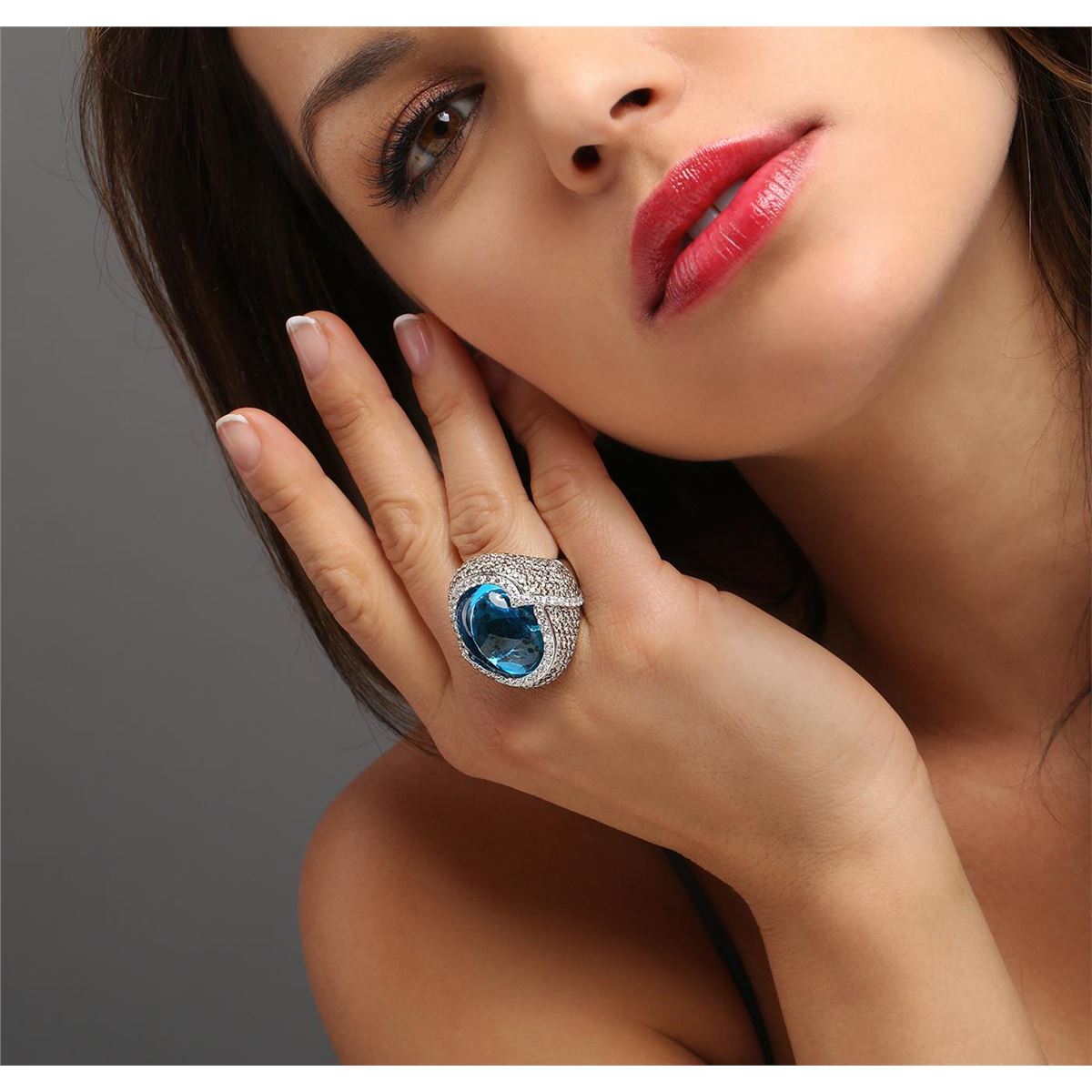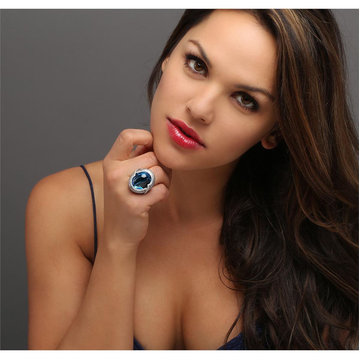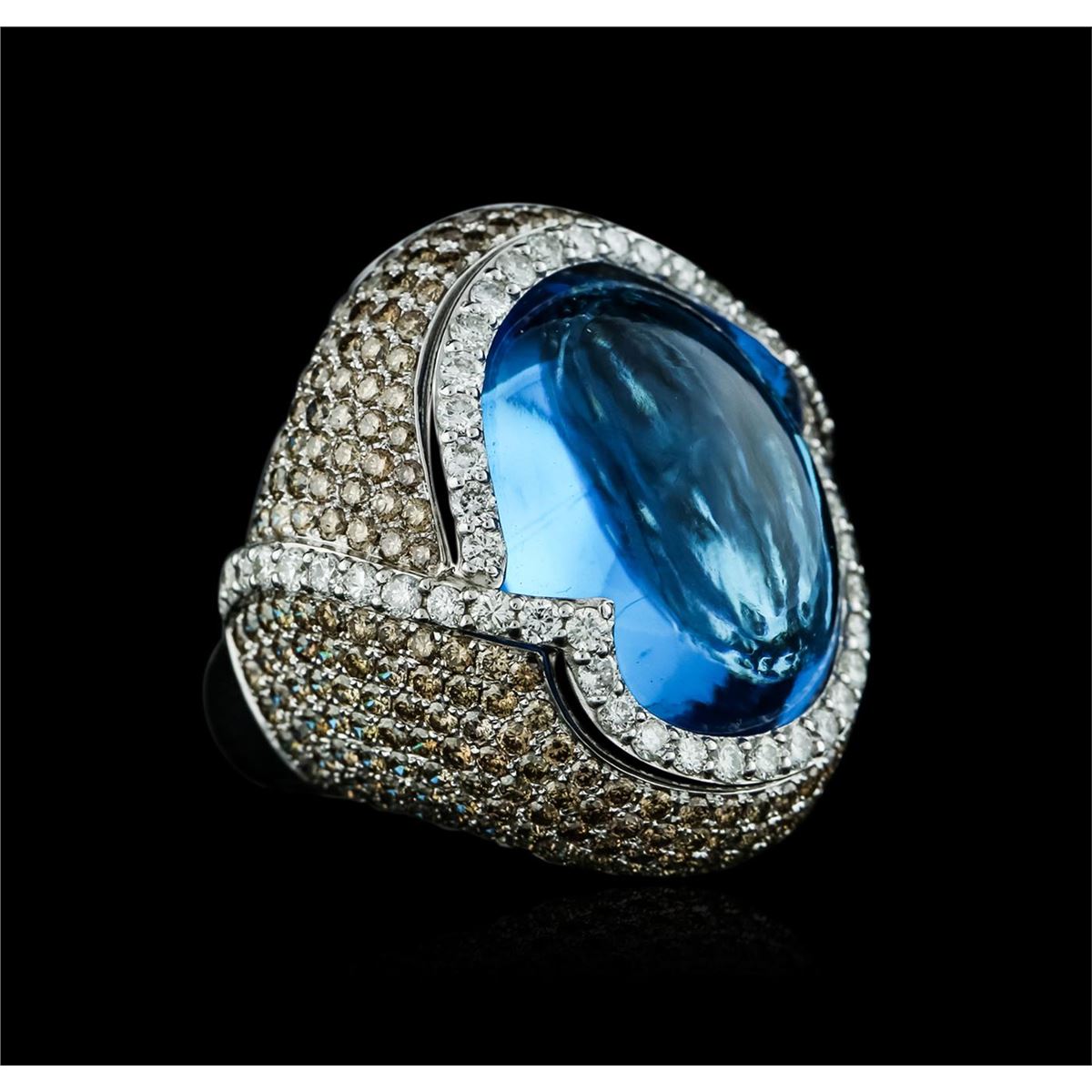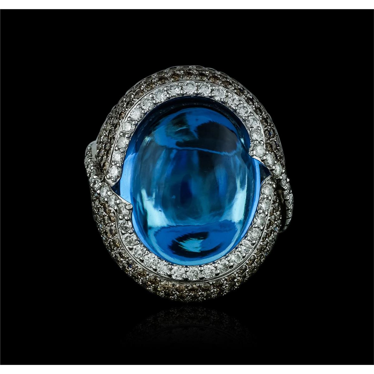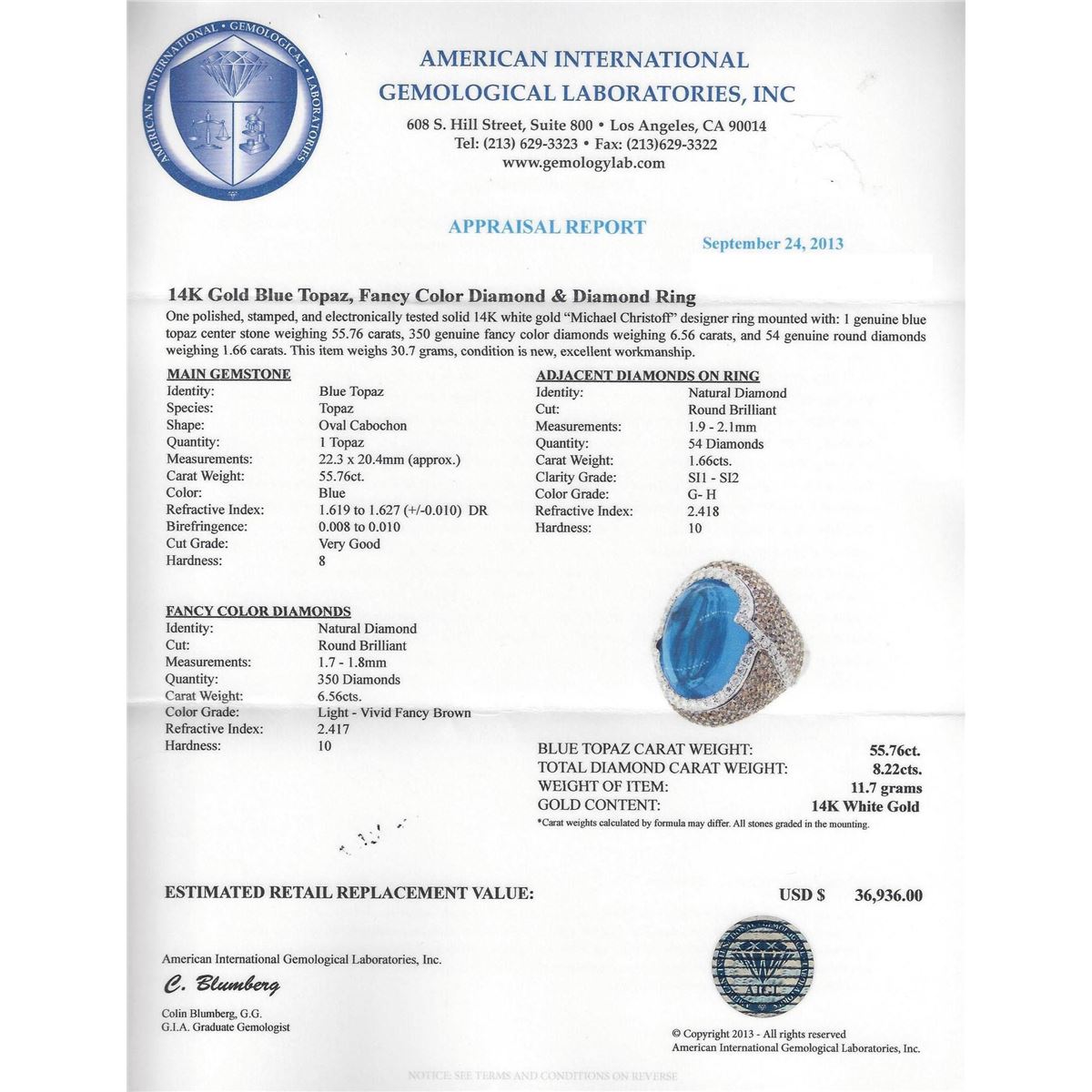 One polished, stamped, and electronically tested solid 14KT white gold "Michael Christoff" designer ring mounted with: 1 genuine blue topaz center stone weighing 55.76ct, 350 genuine fancy brown color diamonds weighing 6.56ctw, and 54 genuine round diamonds weighing 1.66ctw. This item weighs 30.70 grams, condition is new, excellent workmanship. AIGL Appraised at $36,936.00.