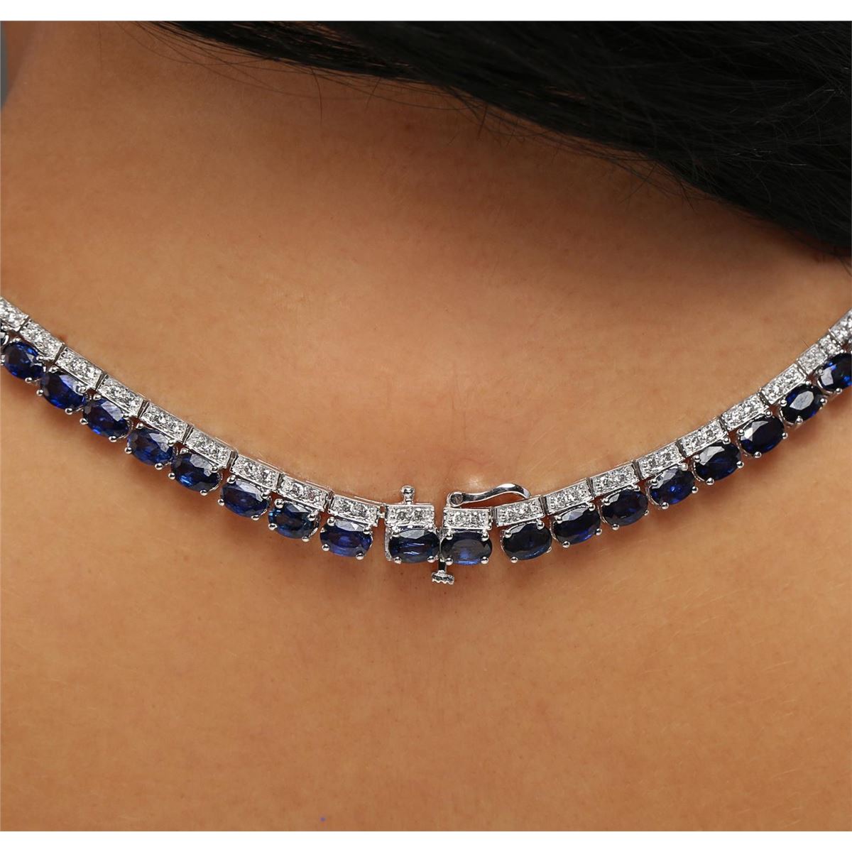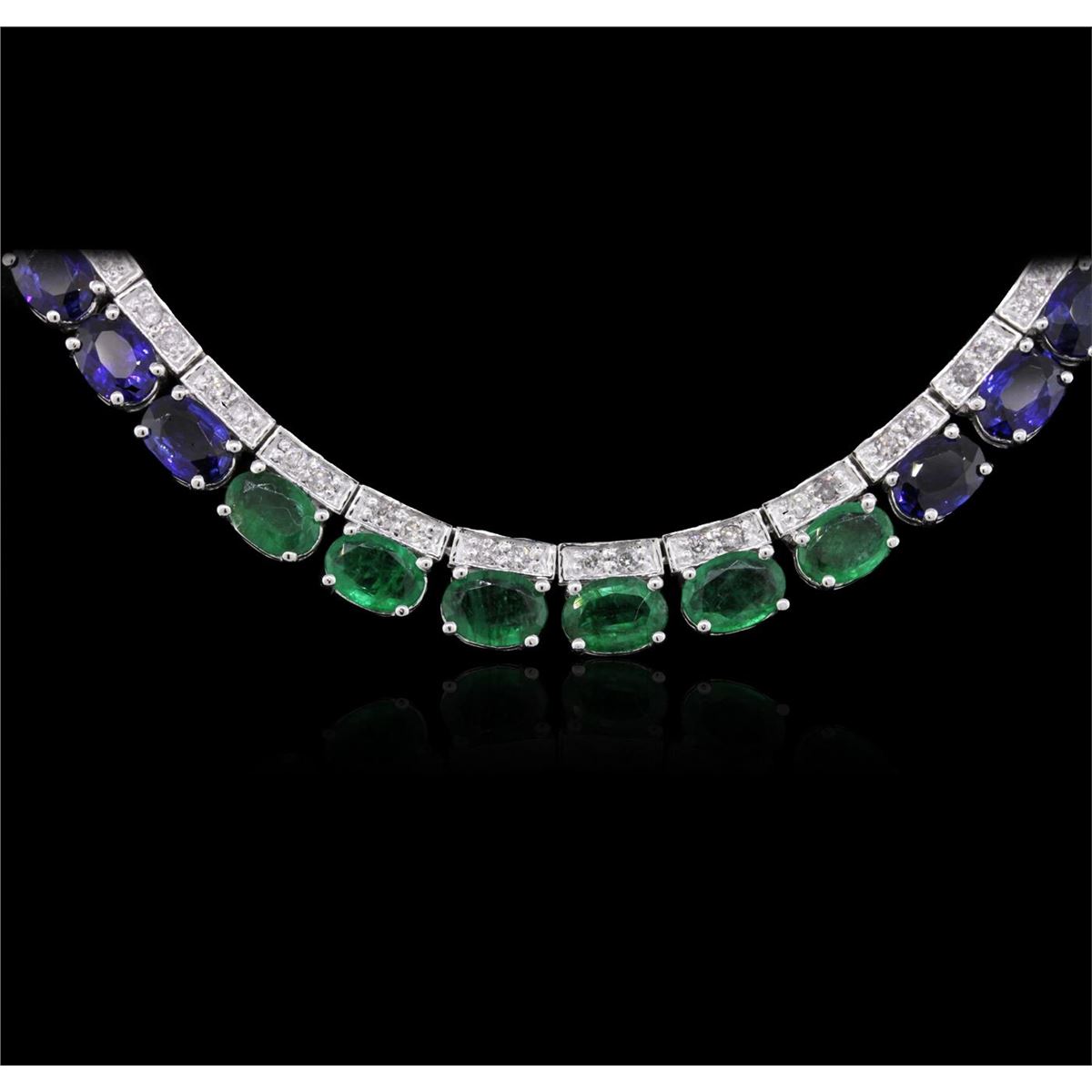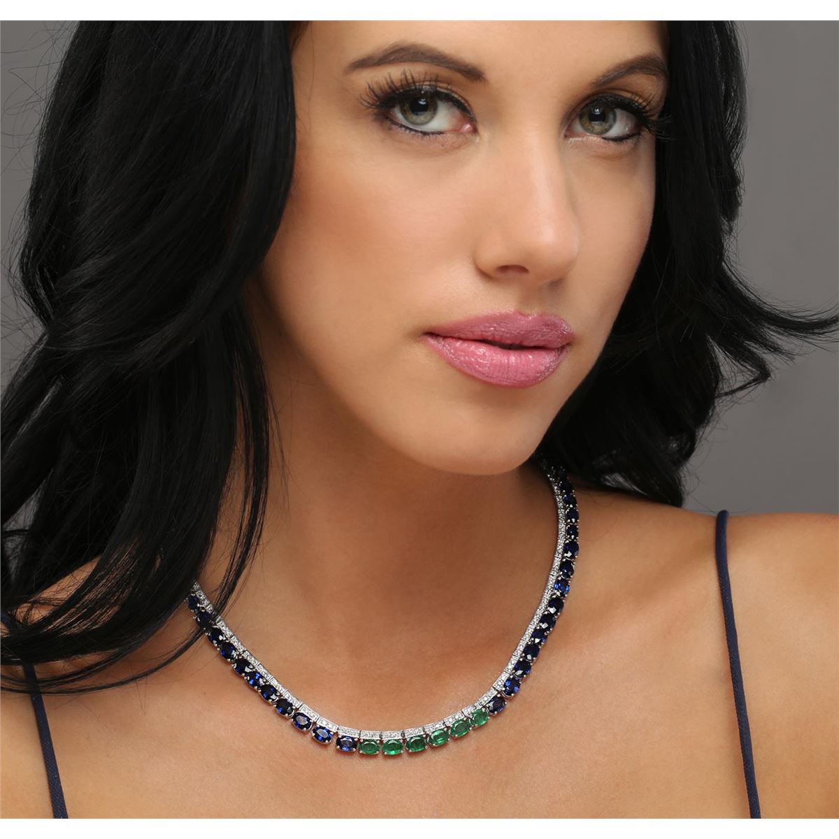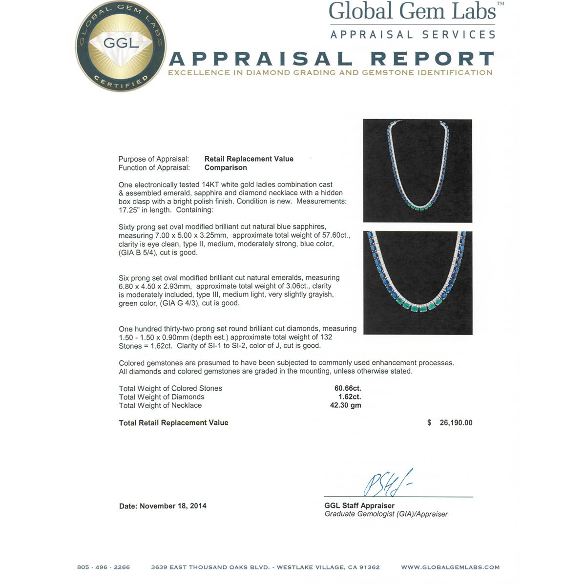 One electronically tested 14KT white gold ladies combination cast & assembled emerald, sapphire and diamond necklace with a hidden box clasp with a bright polish finish. Measurements: 17.25" in length. Condition is new. Containing: Sixty prong set oval modified brilliant cut natural blue sapphires, measuring 7.00 x 5.00 x 3.25mm, approximate total weight of 57.60ct., clarity is eye clean, type II, medium, moderately strong, blue color, (GIA B 5/4), cut is good. Six prong set oval modified brilliant cut natural emeralds, measuring 6.80 x 4.50 x 2.93mm, approximate total weight of 3.06ct., clarity is moderately included, type III, medium light, very slightly grayish, green color, (GIA G 4/3), cut is good. One Hundred Thirty-Two prong set round brilliant cut diamonds, measuring 1.50 - 1.50 x 0.90mm (depth est.) approximate total weight of 132 Stones = 1.62ct. Clarity: SI-1 to SI-2. Color: J, Cut is Good. Colored gemstones are presumed to have been subjected to commonly used enhancement processes. All diamonds and colored gemstones are graded in the mounting, unless otherwise stated. Total Weight of Colored Stones 60.66ct. Total Weight of Diamonds 1.62ct. Total Weight of Necklace 42.30 grams. GGL Appraised at $26,190.00.