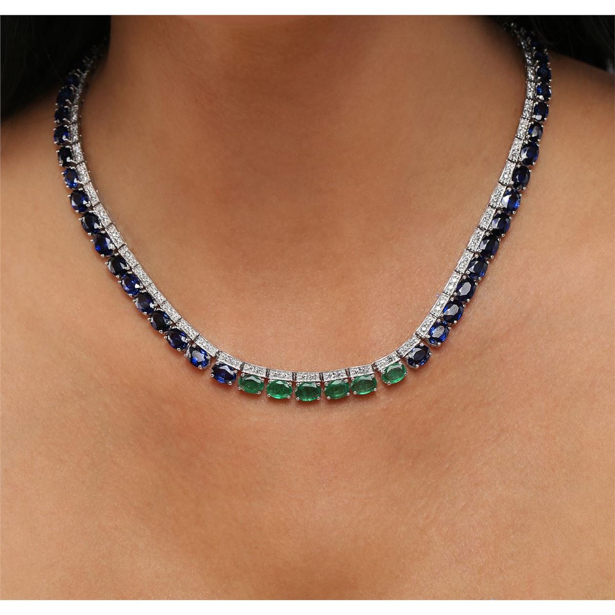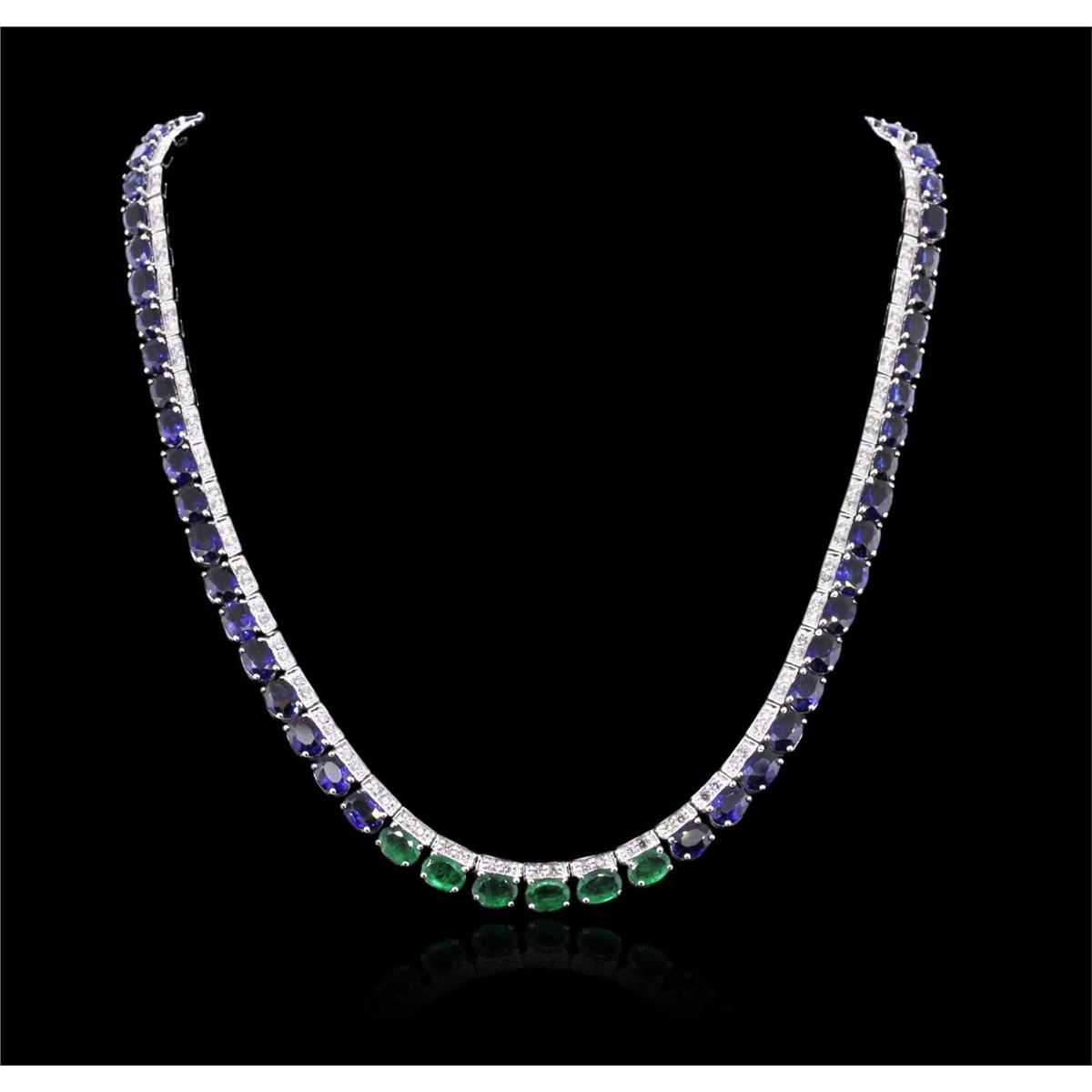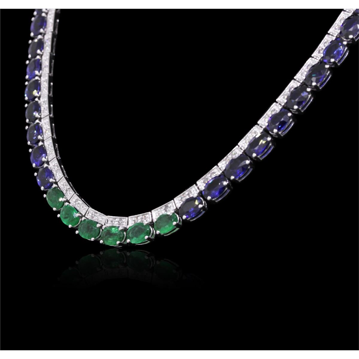 One electronically tested 14KT white gold ladies combination cast & assembled emerald, sapphire and diamond necklace with a hidden box clasp with a bright polish finish. Measurements: 17.25" in length. Condition is new. Containing: Sixty prong set oval modified brilliant cut natural blue sapphires, measuring 7.00 x 5.00 x 3.25mm, approximate total weight of 57.60ct., clarity is eye clean, type II, medium, moderately strong, blue color, (GIA B 5/4), cut is good. Six prong set oval modified brilliant cut natural emeralds, measuring 6.80 x 4.50 x 2.93mm, approximate total weight of 3.06ct., clarity is moderately included, type III, medium light, very slightly grayish, green color, (GIA G 4/3), cut is good. One Hundred Thirty-Two prong set round brilliant cut diamonds, measuring 1.50 - 1.50 x 0.90mm (depth est.) approximate total weight of 132 Stones = 1.62ct. Clarity: SI-1 to SI-2. Color: J, Cut is Good. Colored gemstones are presumed to have been subjected to commonly used enhancement processes. All diamonds and colored gemstones are graded in the mounting, unless otherwise stated. Total Weight of Colored Stones 60.66ct. Total Weight of Diamonds 1.62ct. Total Weight of Necklace 42.30 grams. GGL Appraised at $26,190.00.