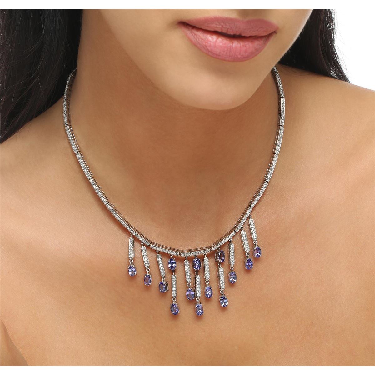 One electronically tested 14KT white gold ladies combination cast & assembled necklace with a hidden box clasp with a bright polish finish. Condition is new. Measurements: 14" in length. Identified with markings of "14K". Containing: Fourteen prong set oval modified brilliant cut natural tanzanites, measuring 5.94 x 3.28 x 3.00mm, approximate. Total Weight of 6.02ct., clarity is eye clean, type I, medium light, very slightly grayish, violet color, (GIA V 4/3), cut is good. Three Hundred Twenty-Seven prong set round brilliant cut diamonds, measuring 1.30 - 1.30 x 0.78mm (depth est.) approximate. Total Weight of 327 Stones = 2.62ct. Clarity: SI-1 to I-1. Color: I - J, Cut is Good. Colored gemstones are presumed to have been subjected to commonly used enhancement processes. All diamonds and colored gemstones are graded in the mounting, unless otherwise stated. Total Weight of Colored Stones 6.02ct. Total Weight of Diamonds 2.62ct. Total Weight of Necklace 30.30 grams. GGL Appraised at $26,855.00.