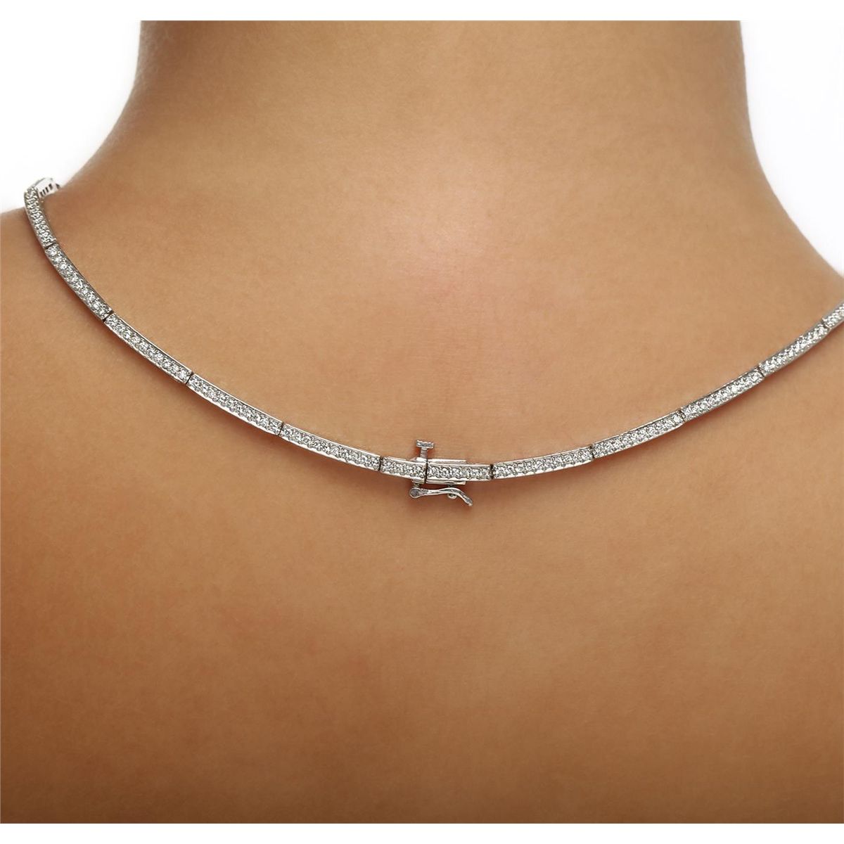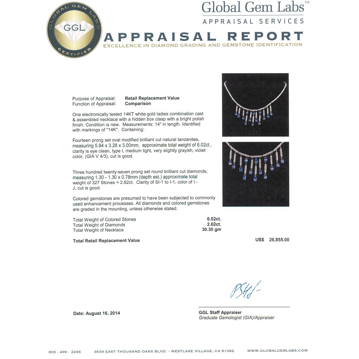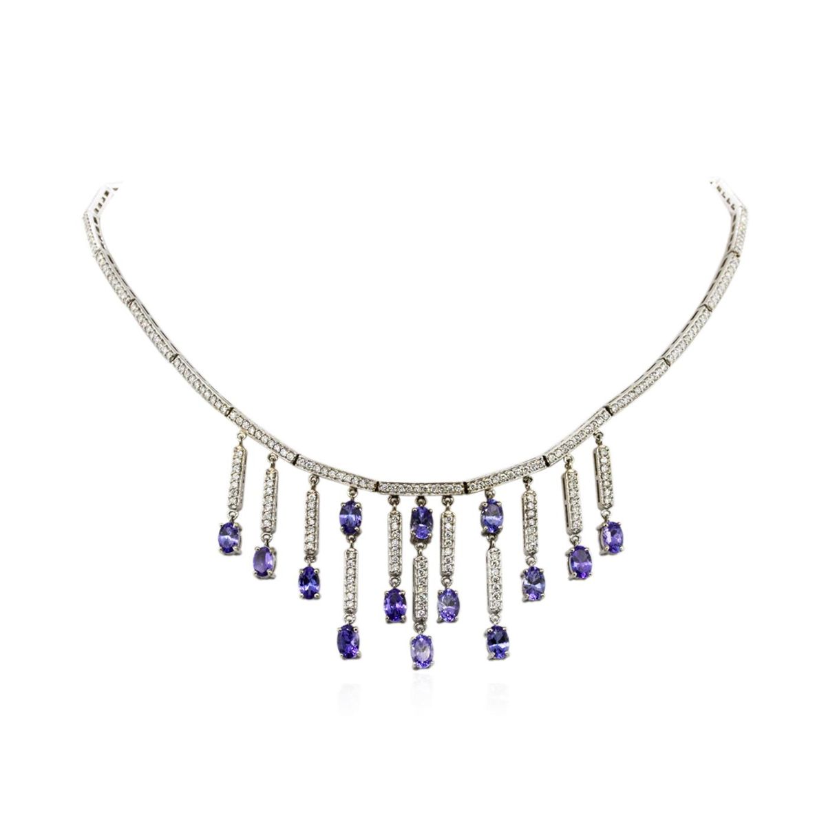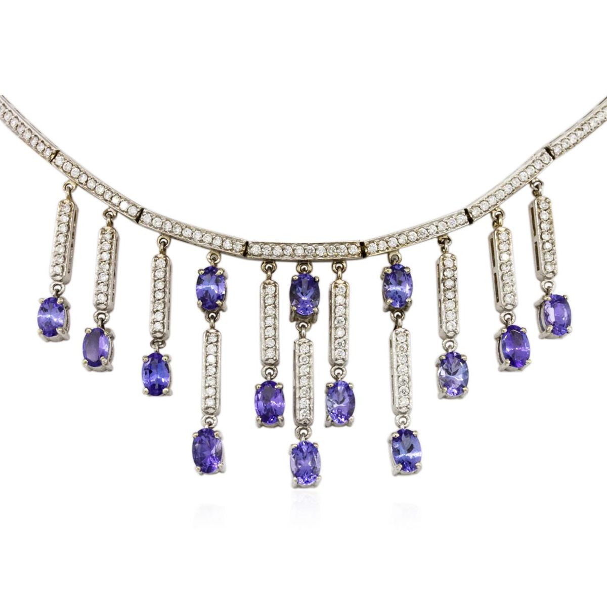One electronically tested 14KT white gold ladies combination cast & assembled necklace with a hidden box clasp with a bright polish finish. Condition is new. Measurements: 14" in length. Identified with markings of "14K". Containing: Fourteen prong set oval modified brilliant cut natural tanzanites, measuring 5.94 x 3.28 x 3.00mm, approximate. Total Weight of 6.02ct., clarity is eye clean, type I, medium light, very slightly grayish, violet color, (GIA V 4/3), cut is good. Three Hundred Twenty-Seven prong set round brilliant cut diamonds, measuring 1.30 - 1.30 x 0.78mm (depth est.) approximate. Total Weight of 327 Stones = 2.62ct. Clarity: SI-1 to I-1. Color: I - J, Cut is Good. Colored gemstones are presumed to have been subjected to commonly used enhancement processes. All diamonds and colored gemstones are graded in the mounting, unless otherwise stated. Total Weight of Colored Stones 6.02ct. Total Weight of Diamonds 2.62ct. Total Weight of Necklace 30.30 grams. GGL Appraised at $26,855.00.