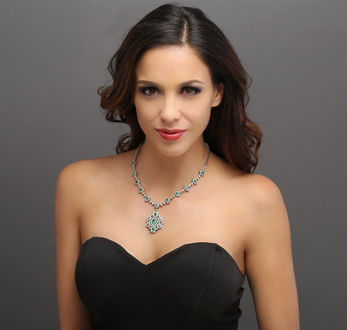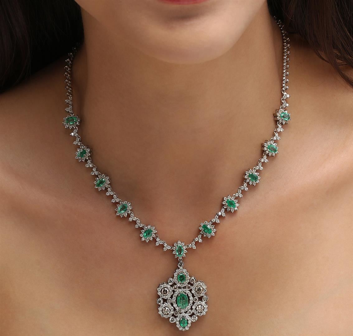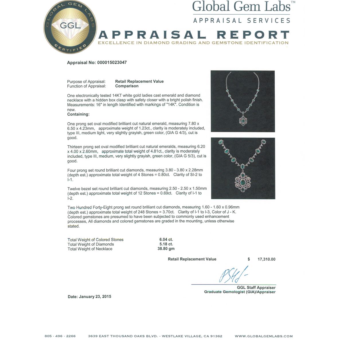 One electronically tested 14KT white gold ladies cast emerald and diamond necklace with a hidden box clasp with safety closer with a bright polish finish. Measurements: 16" in length Identified with markings of "14K". Condition is new. Containing: One prong set oval modified brilliant cut natural emerald, measuring 7.80 x 6.50 x 4.23mm, approximate weight of 1.23ct., clarity is moderately included, type III, medium light, very slightly grayish, green color, (GIA G 4/3), cut is good. Thirteen prong set oval modified brilliant cut natural emeralds, measuring 6.20 x 4.00 x 2.60mm, approximate total weight of 4.81ct., clarity is moderately included, type III, medium, very slightly grayish, green color, (GIA G 5/3), cut is good. Four prong set round brilliant cut diamonds, measuring 3.80 - 3.80 x 2.28mm (depth est.) approximate total weight of 4 Stones = 0.80ct. Clarity: SI-2 to I-1. Twelve bezel set round brilliant cut diamonds, measuring 2.50 - 2.50 x 1.50mm (depth est.) approximate total weight of 12 Stones = 0.69ct. Clarity: I-1 to I-2. Two Hundred Forty-Eight prong set round brilliant cut diamonds, measuring 1.60 - 1.60 x 0.96mm (depth est.) approximate total weight of 248 Stones = 3.70ct. Clarity: I-1 to I-3. Color: J - K. Colored gemstones are presumed to have been subjected to commonly used enhancement processes, All diamonds and colored gemstones are graded in the mounting, unless otherwise stated. Total Weight of Colored Stones 6.04ct. Total Weight of Diamonds 5.18ct. Total Weight of Necklace 38.80 grams. GGL Appraised at $17,310.00.