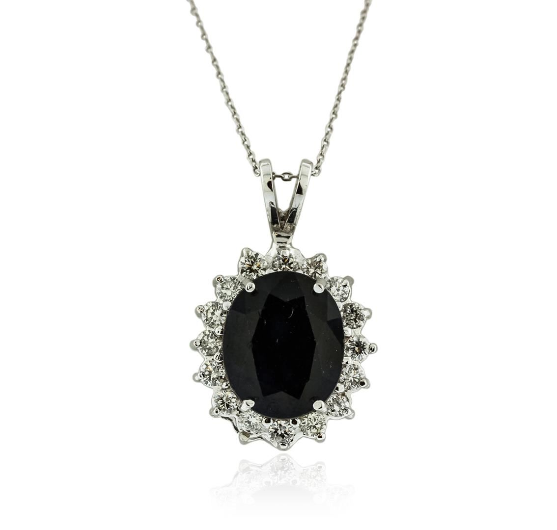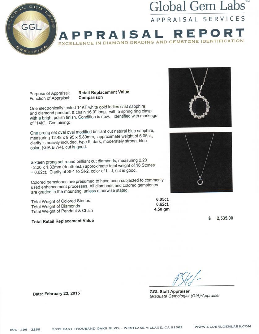 One electronically tested 14KT white gold ladies cast sapphire and diamond pendant & chain 16.0" long, with a spring ring clasp with a bright polish finish. Identified with markings of "14K". Condition is new. Containing: One prong set oval oval modified brilliant cut natural blue sapphire, measuring 12.48 x 9.95 x 5.80mm, approximate weight of 6.05ct., clarity is heavily included, type II, dark, moderately strong, blue color, (GIA B 7/4), cut is good. Sixteen prong set round brilliant cut diamonds, measuring 2.20 - 2.20 x 1.32mm (depth est.) approximate total weight of 16 Stones = 0.62ct. Clarity: SI-1 to SI-2. Color: I - J, Cut is Good. Colored gemstones are presumed to have been subjected to commonly used enhancement processes. All diamonds and colored gemstones are graded in the mounting, unless otherwise stated. Total Weight of Colored Stones 6.05ct. Total Weight of Diamonds 0.62ct. Total Weight of Pendant & Chain 4.50 grams. GGL Appraised at $2,535.00.