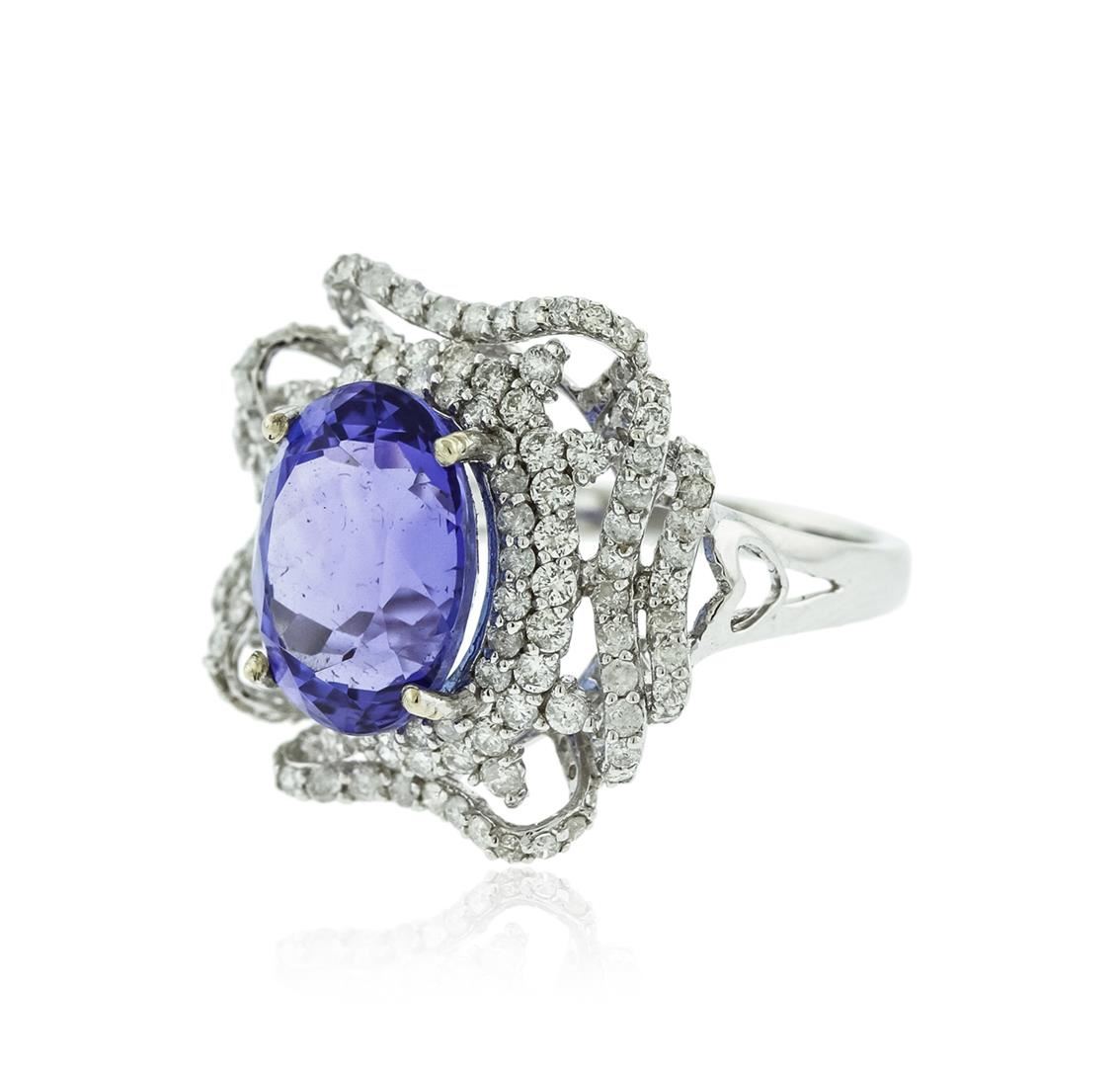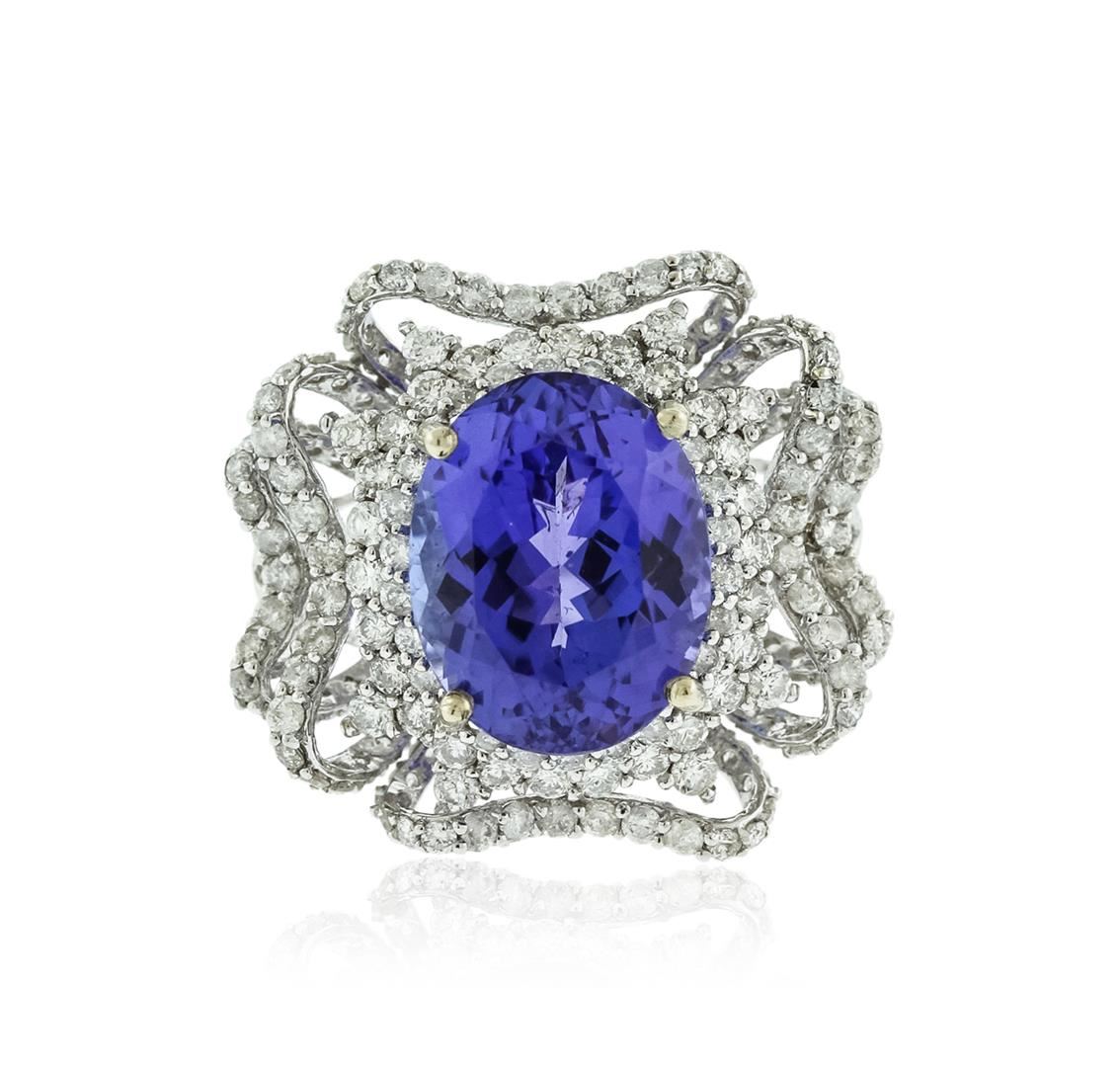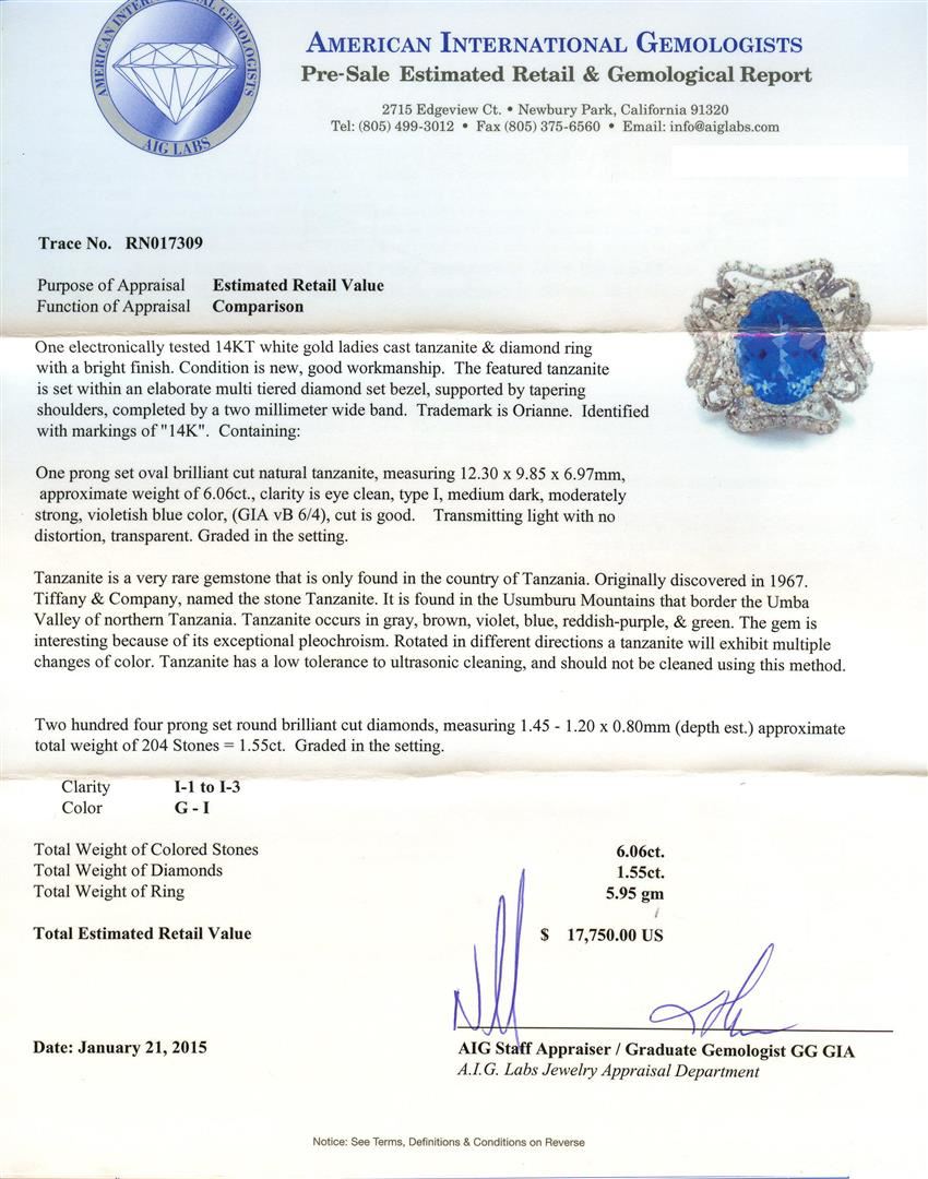 One electronically tested 14KT white gold ladies cast tanzanite & diamond ring with a bright finish. The featured tanzanite is set within an elaborate multi tiered diamond set bezel, supported by tapering shoulders, completed by a two millimeter wide band. Trademark is Orianne. Identified with markings of "14K". Condition is new, good workmanship. Containing: One prong set oval brilliant cut natural tanzanite, measuring 12.30 x 9.85 x 6.97mm, approximate weight of 6.06ct., clarity is eye clean, type I, medium dark, moderately strong, violetish blue color, (GIA vB 6/4), cut is good. Transmitting light with no distortion, transparent. Graded in the setting. Tanzanite is a very rare gemstone that is only found in the country of Tanzania. Originally discovered in 1967. Tiffany & Company, named the stone Tanzanite. It is found in the Usumburu Mountains that border the Umba Valley of northern Tanzania. Tanzanite occurs in gray, brown, violet, blue, reddish-purple, & green. The gem is interesting because of its exceptional pleochroism. Rotated in different directions a tanzanite will exhibit multiple changes of color. Tanzanite has a low tolerance to ultrasonic cleaning, and should not be cleaned using this method. Two Hundred Four prong set round brilliant cut diamonds, measuring 1.45 - 1.20 x 0.80mm (depth est.) approximate total weight of 204 Stones = 1.55ct. Graded in the setting. Clarity: I-1 to I-3. Color: G - I. Total Weight of Colored Stones 6.06ct. Total Weight of Diamonds 1.55ct. Total Weight of Ring 5.95gm. AIG Appraised at $17,750.00.